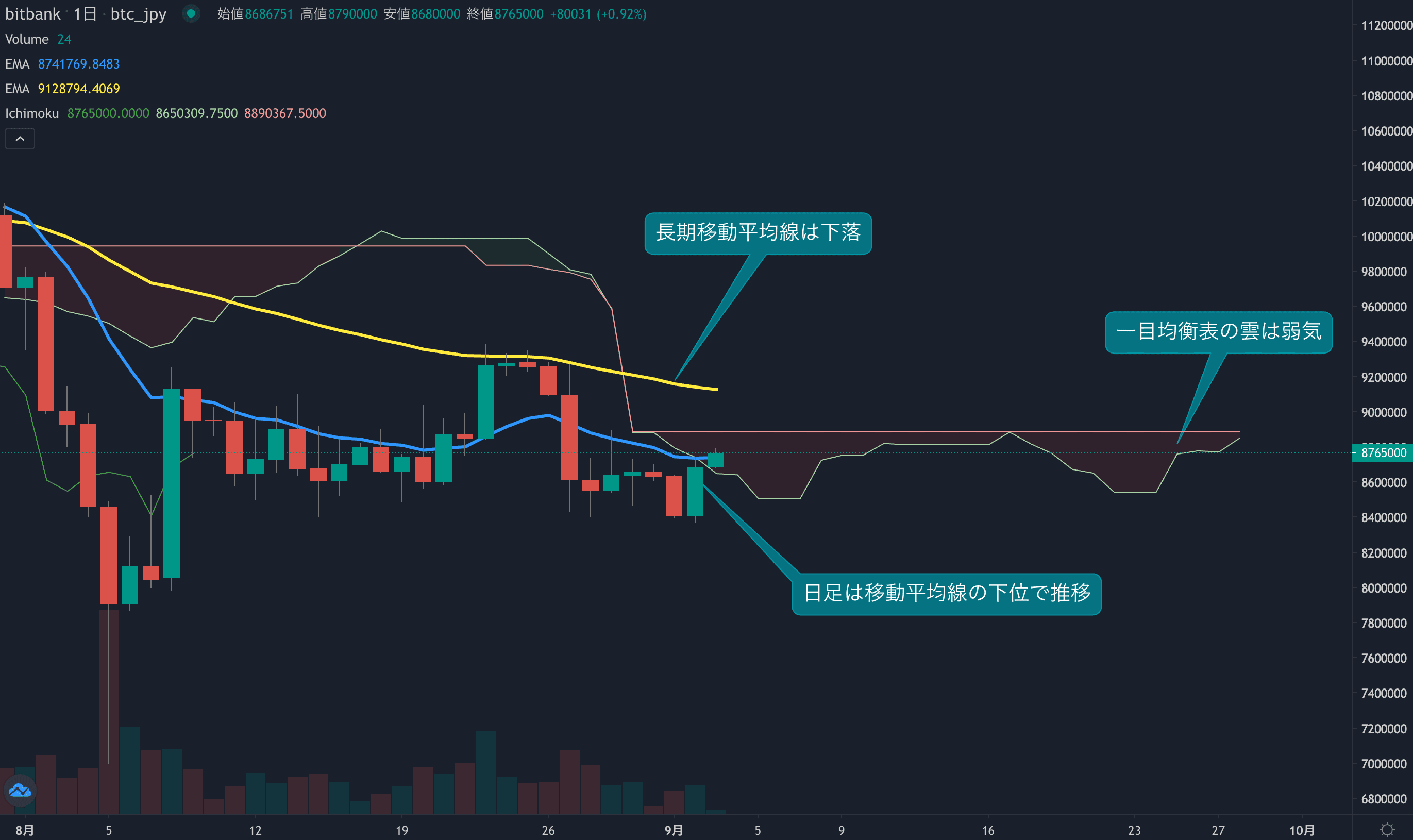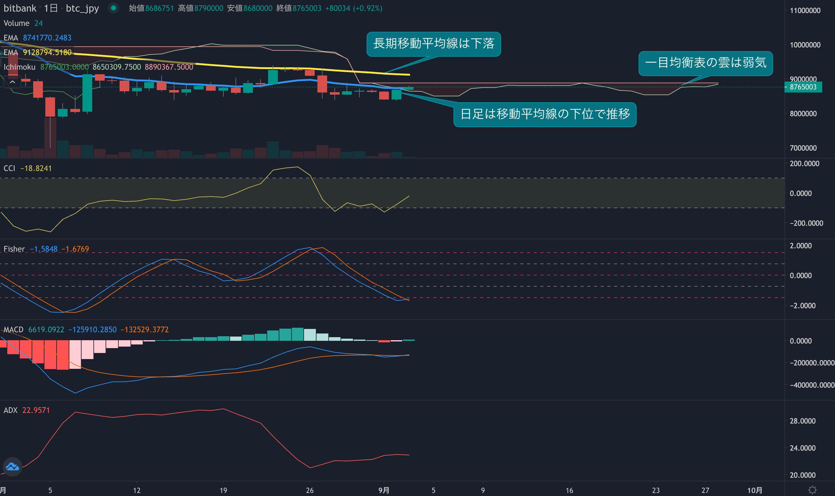 - 昨日のビットコインは3.2%上昇し、終値は868.4万円でした。今週の始めは買われて取引が始まりました。先週末の下落幅を取り戻す動きとなりました。日足は移動平均線近辺まで上昇しました。