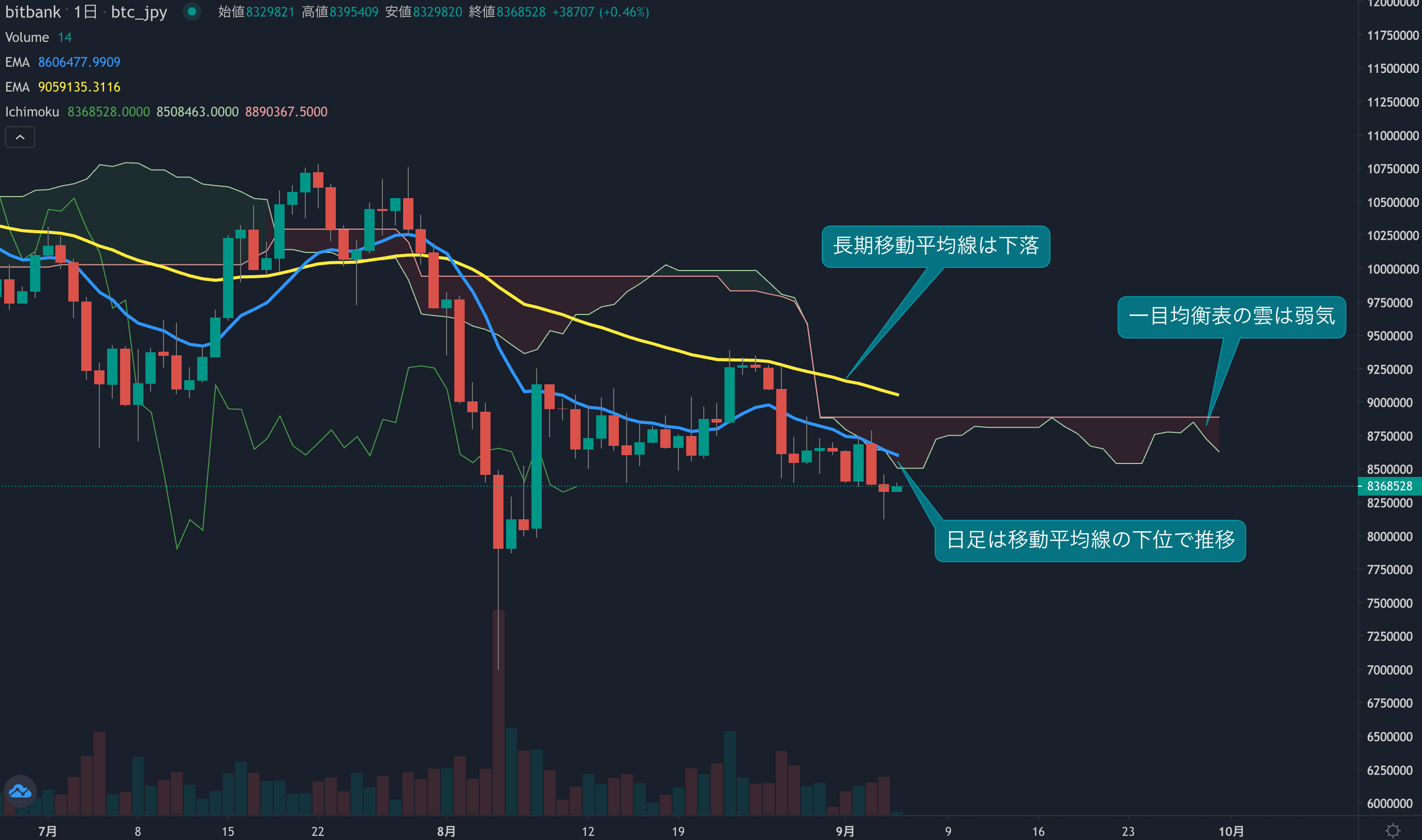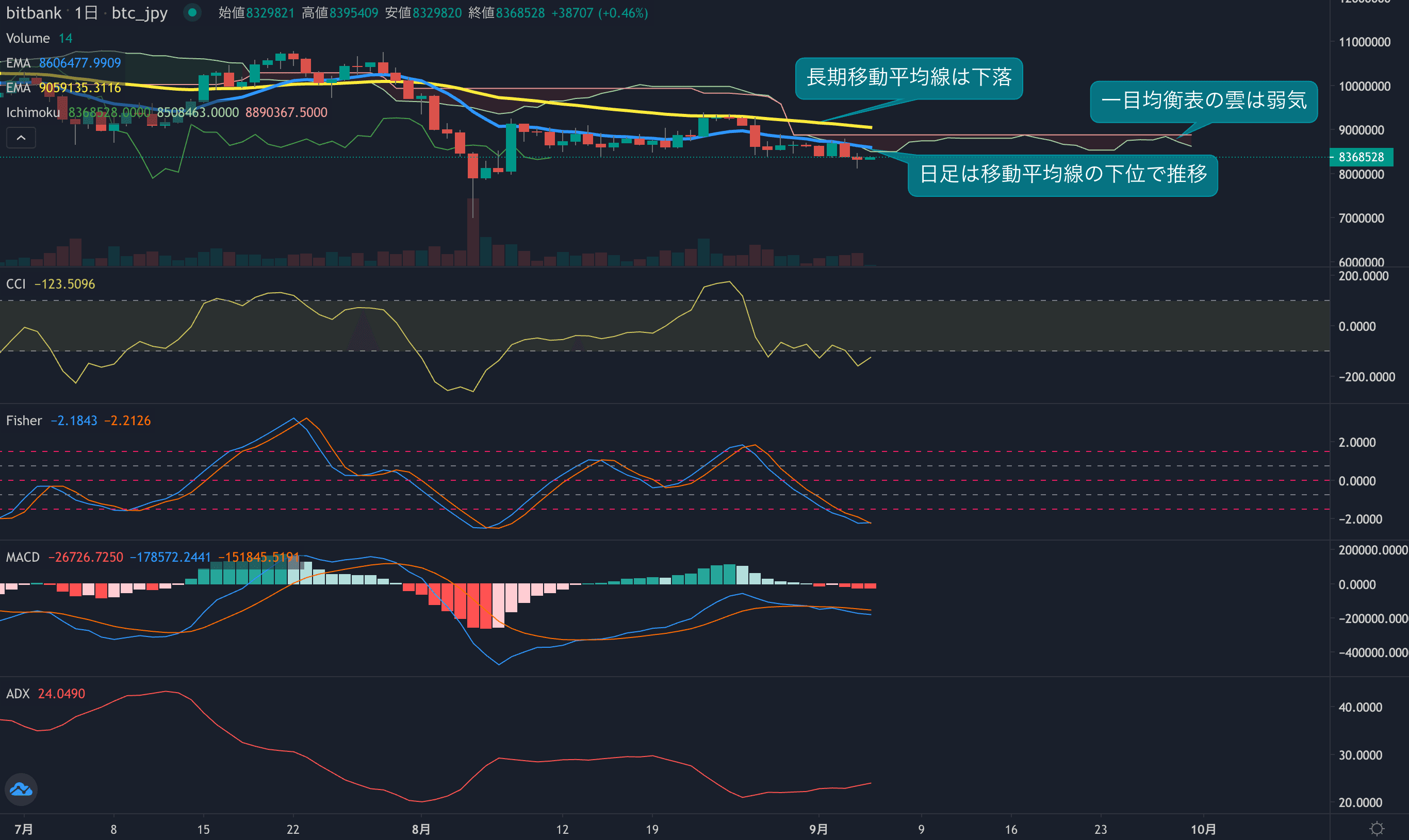 - ビットコインは、週始めに上昇した後に戻り売りが発生し、昨日は今週の安値を更新しました。先週から売り優勢な相場となっており、長期では8月に記録した安値の2番底を探る動きとなっています。日足は引き続き移動平均線の下位での推移となり、冴えない値動きとなっています。今後の重要な価格帯は800万円近辺のサポートラインでしょう。下落幅も徐々に縮小しており、反発があるか注目です。