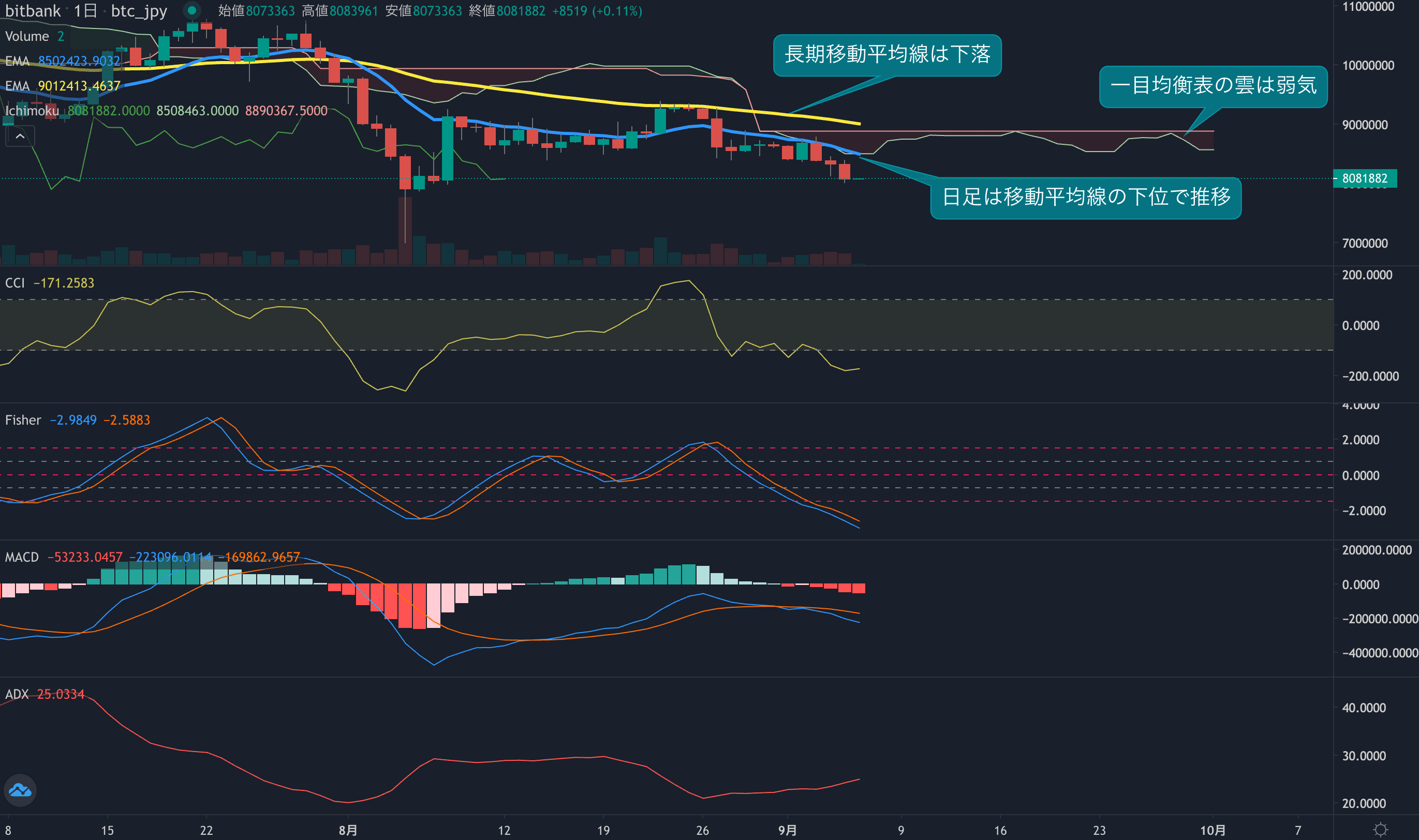 - ビットコインは、ここ3日間の値動きにより週次もマイナスとなり、3.5%ほどの下落となっています。昨日は一時801万円まで下落する動きがあり、節目の価格帯まで近づきました。日足のテクニカルは弱気トレンドとなっていますが、短期のオシレーターは大きなマイナスとなっており、売られ過ぎ感も出ている水準です。8月には下ひげが700万円にタッチしましたが、日足実体で見ると800万円近辺から反発しています。週末を前に買い戻される可能性もあり、サポート近辺での売りには注意が必要です。
