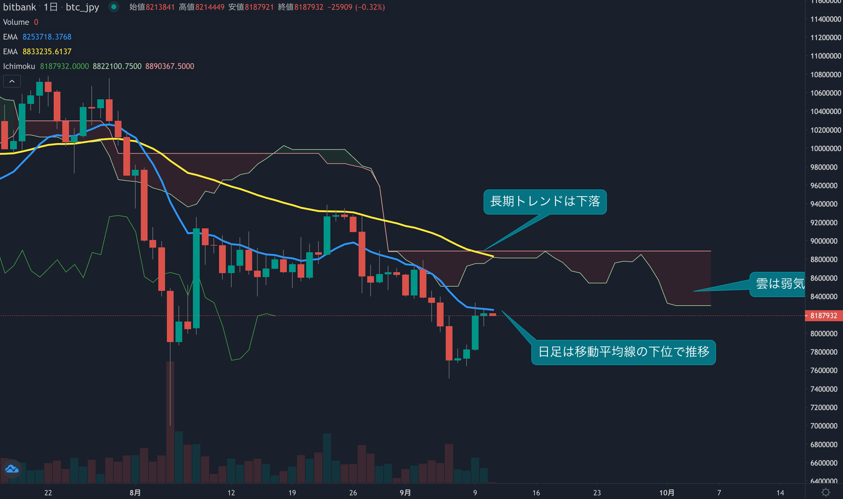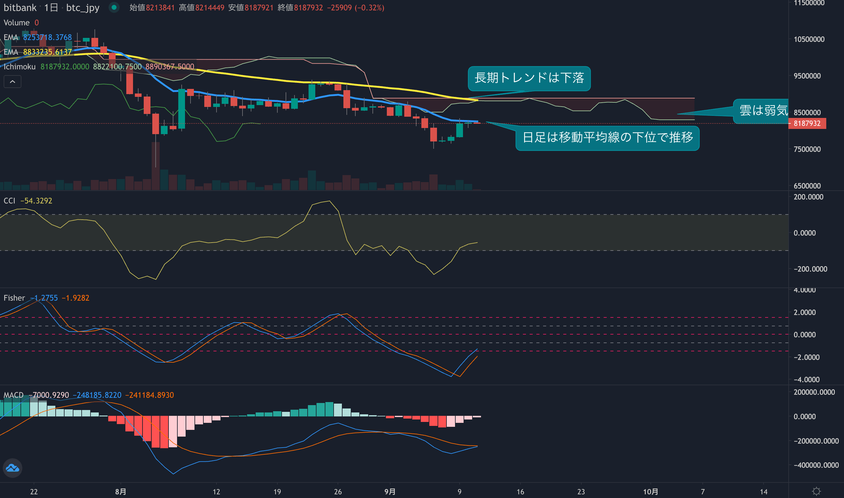 - 価格は14EMA(826.3万円)を下回り弱気示唆です。53EMA(885.8万円)は下落しており、長期トレンドも弱気です。一目均衡表の雲は先行スパン1(830.0万円)が先行スパン2(889.0万円)を下回り弱気示唆です。