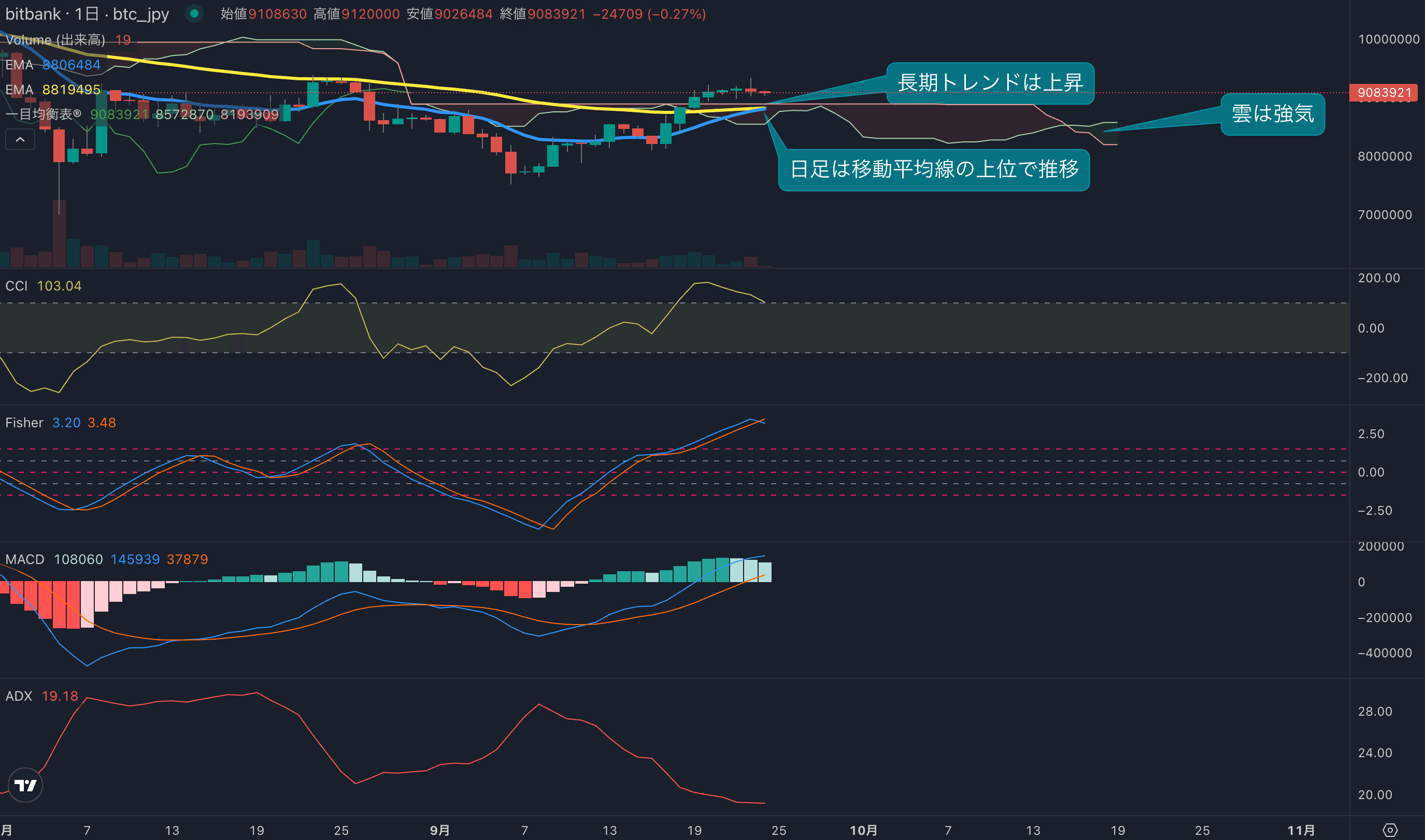 - 昨日のビットコインは0.4%下落し、終値は910.8万円でした。日足は7日ぶりに小幅なマイナスとなりました。8月後半に付けた930万円近辺の高値を前に足元では上値が重くなっています。長期では日足が2つの移動平均線を上回り、強気の値動きとなっています。