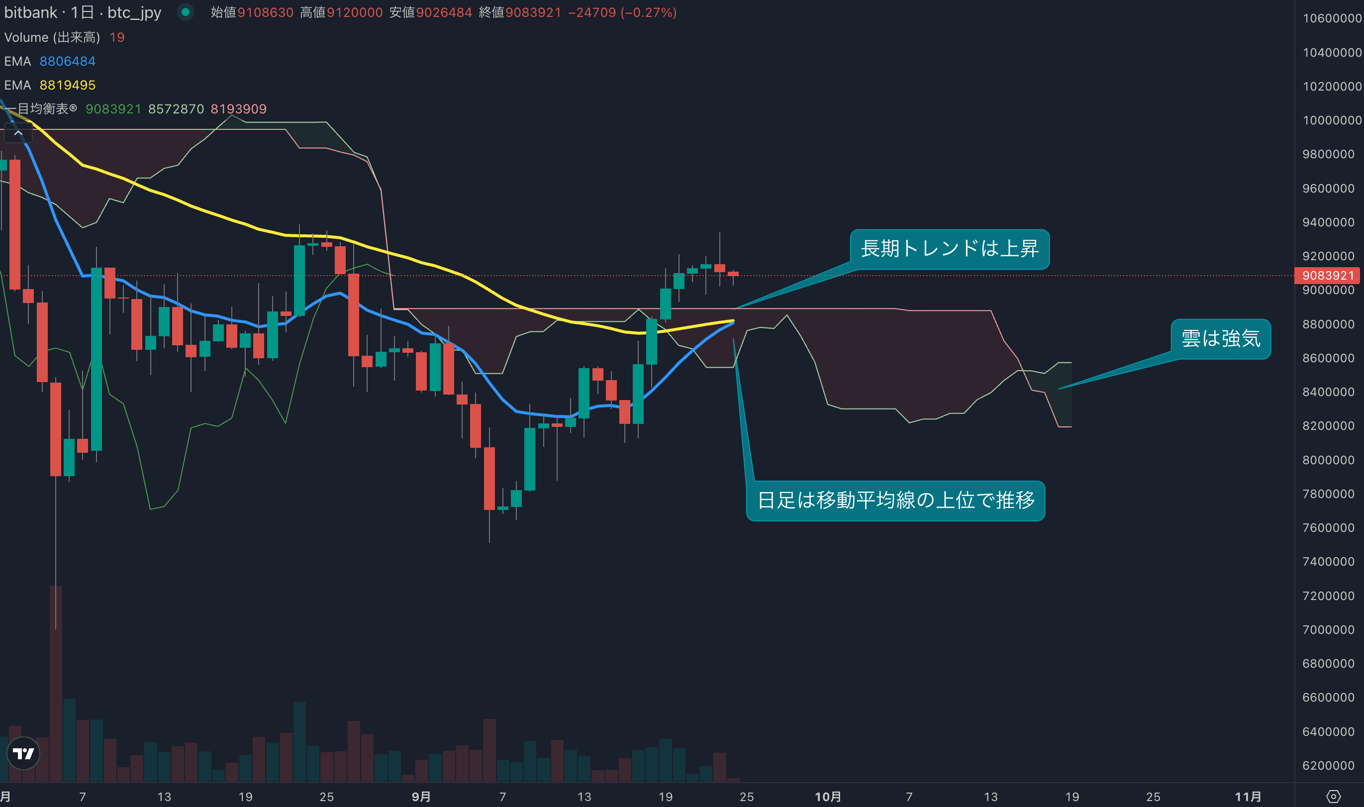 - 価格は14EMA(876.3万円)を上回り強気示唆です。53EMA(880.9万円)は上昇しており、長期トレンドも強気です。一目均衡表の雲は先行スパン1(857.2万円)が先行スパン2(819.3万円)を上回り強気示唆です。