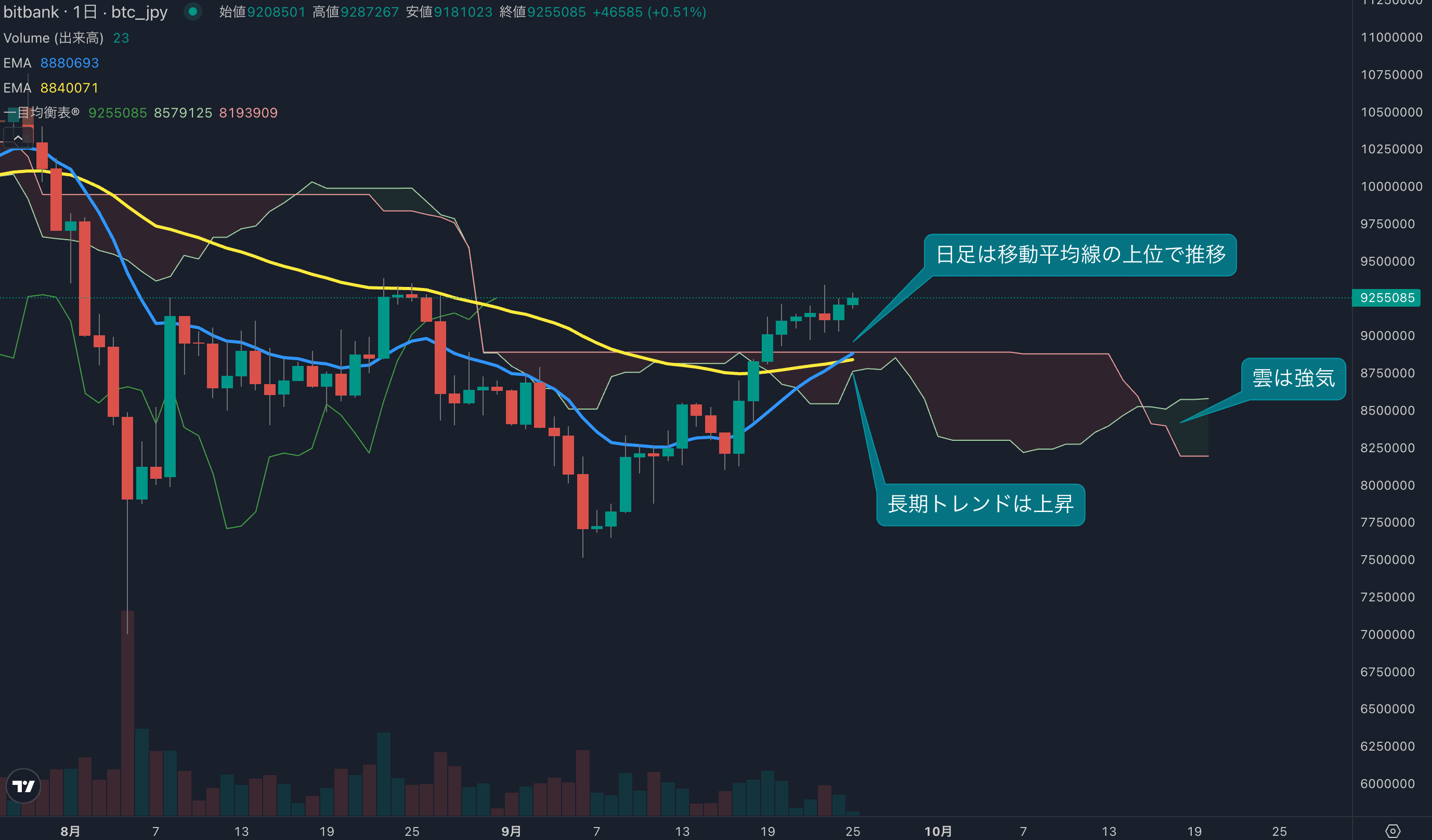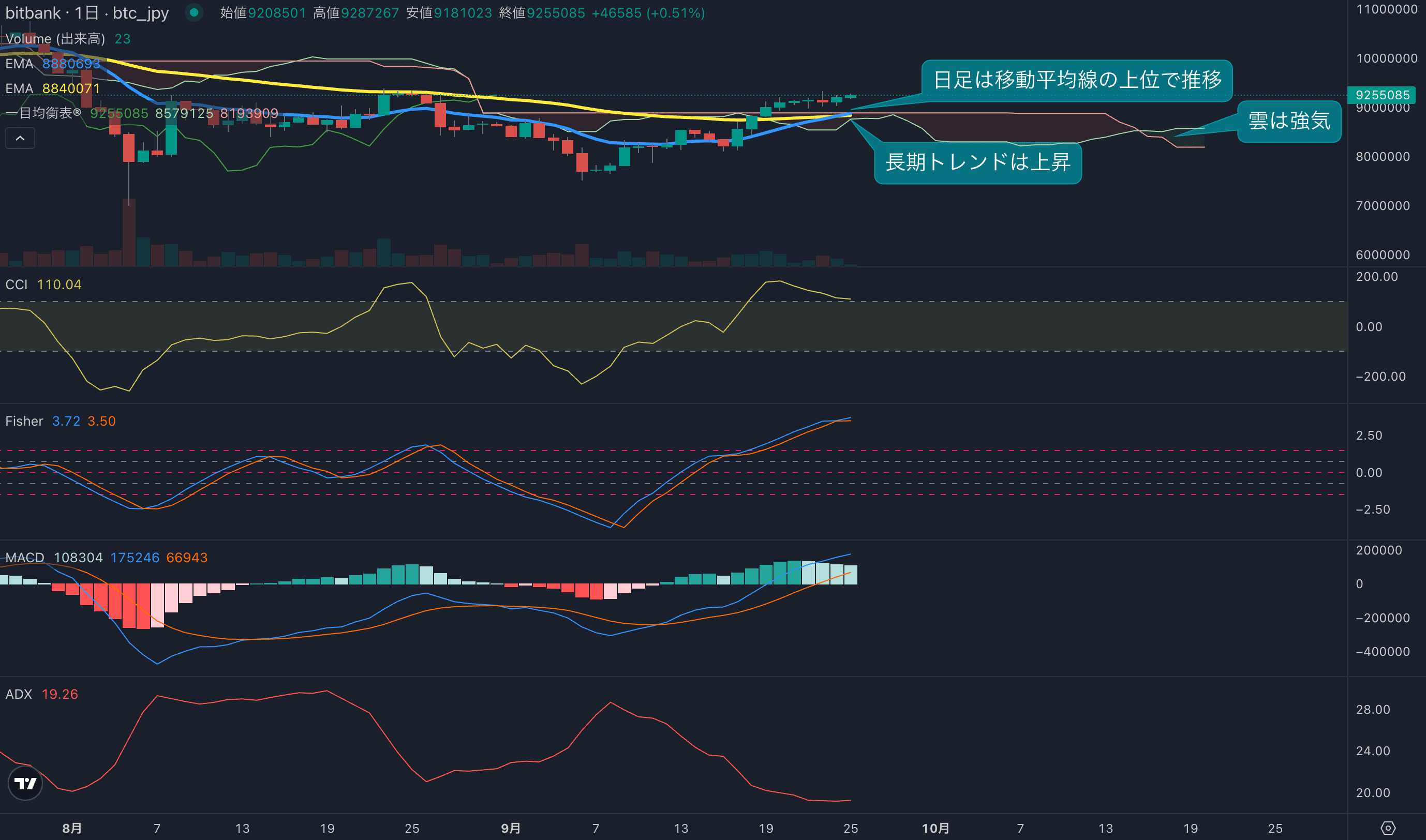 - 価格は14EMA(882.3万円)を上回り強気示唆です。53EMA(882.4万円)は上昇しており、長期トレンドも強気です。一目均衡表の雲は先行スパン1(857.2万円)が先行スパン2(819.3万円)を上回り強気示唆です。