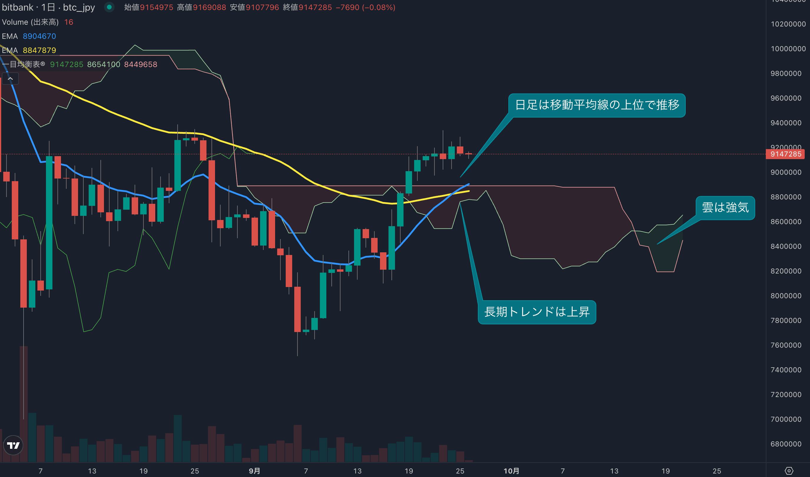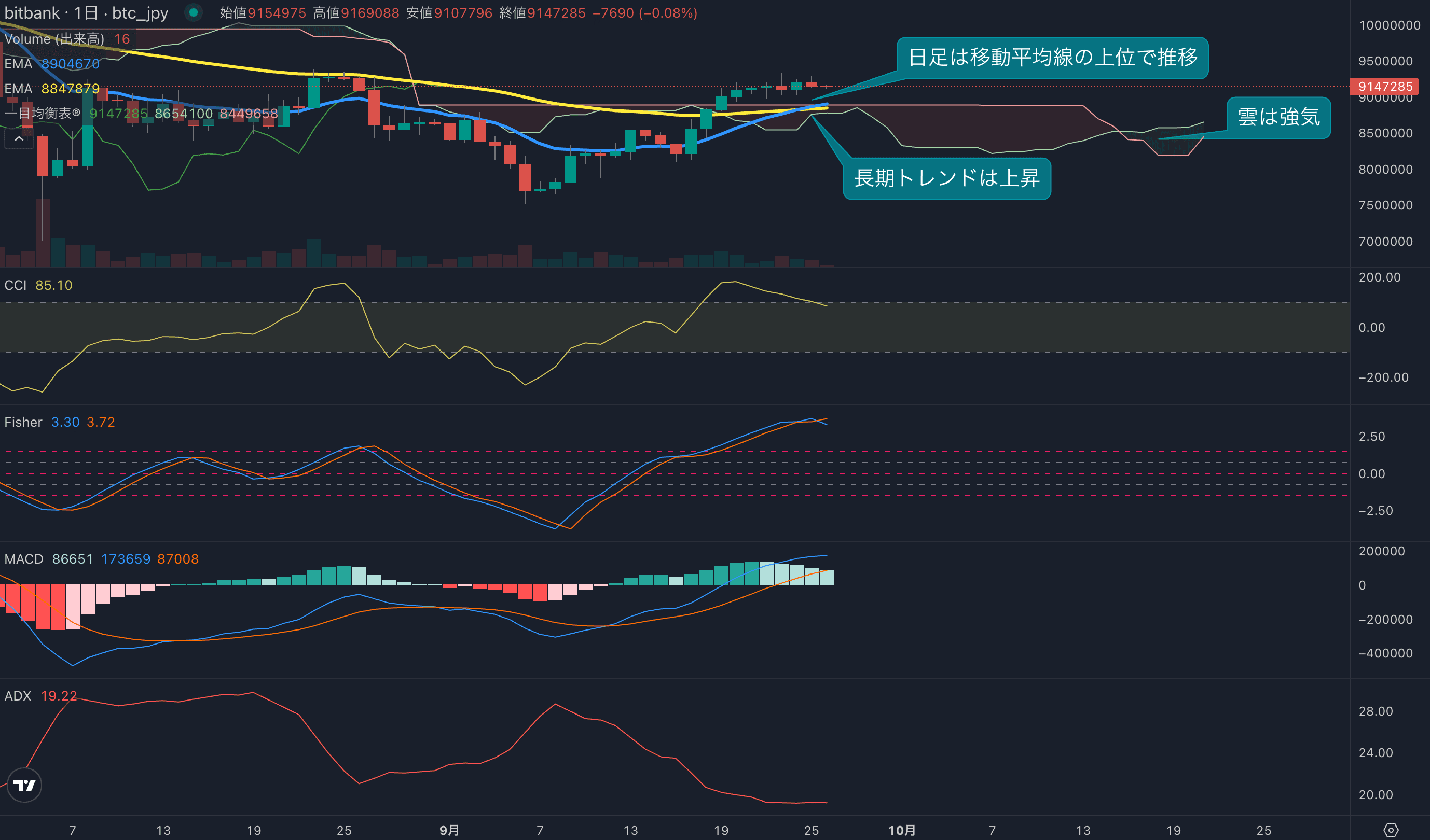 - 価格は14EMA(886.7万円)を上回り強気示唆です。53EMA(883.6万円)は上昇しており、長期トレンドも強気です。一目均衡表の雲は先行スパン1(857.9万円)が先行スパン2(819.3万円)を上回り強気示唆です。