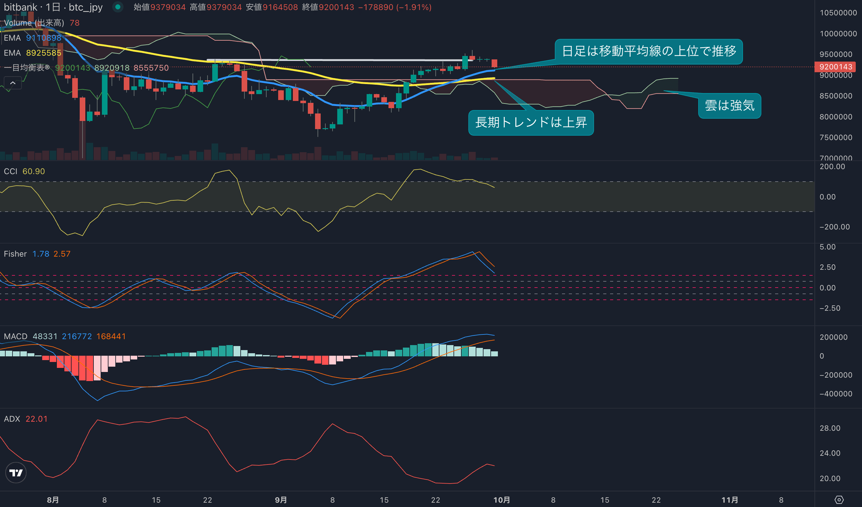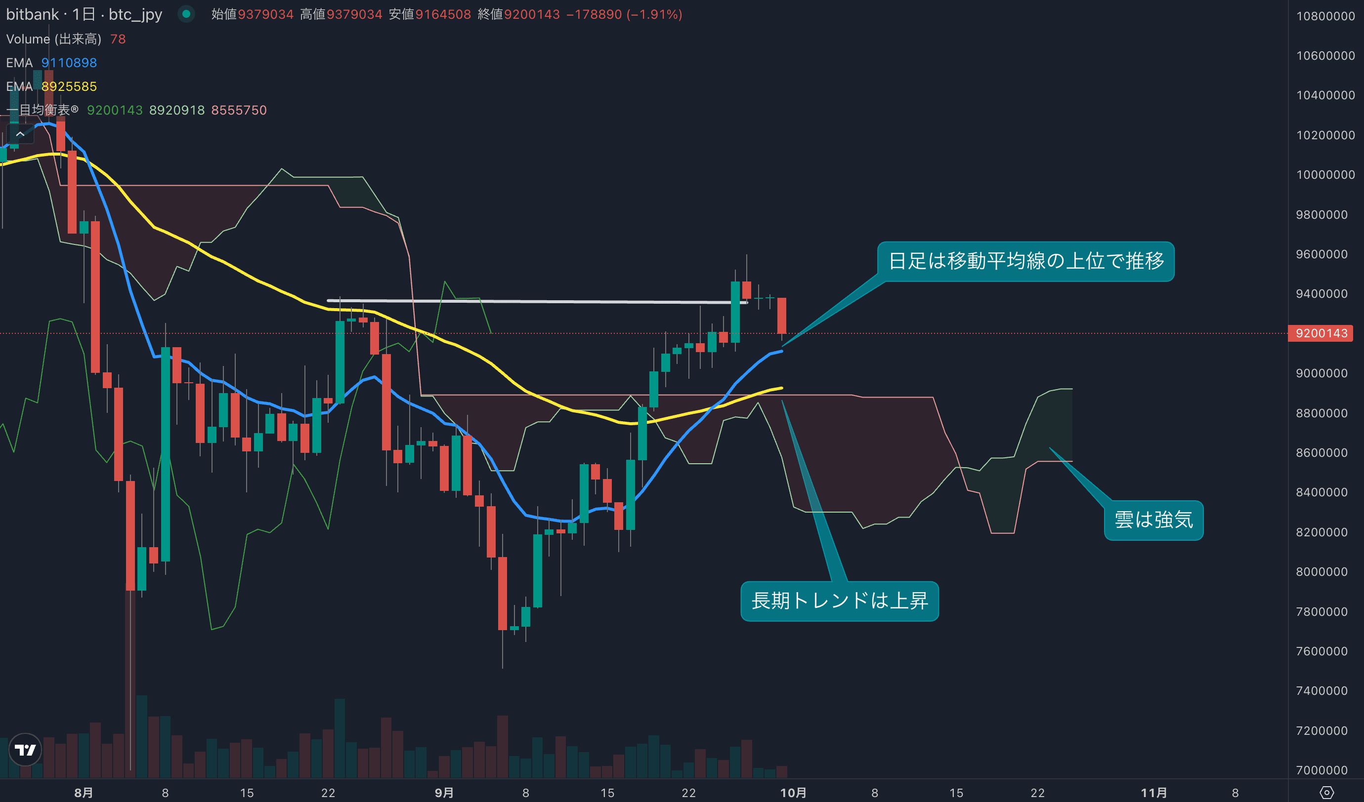 - 昨日のビットコインは0.02%上昇し、終値は937.9万円でした。週末は大きな動きがなく、ほぼ横ばいの動きとなりました。日足は移動平均線や一目均衡表の雲の上位で推移し、底堅い動きとなっています。
