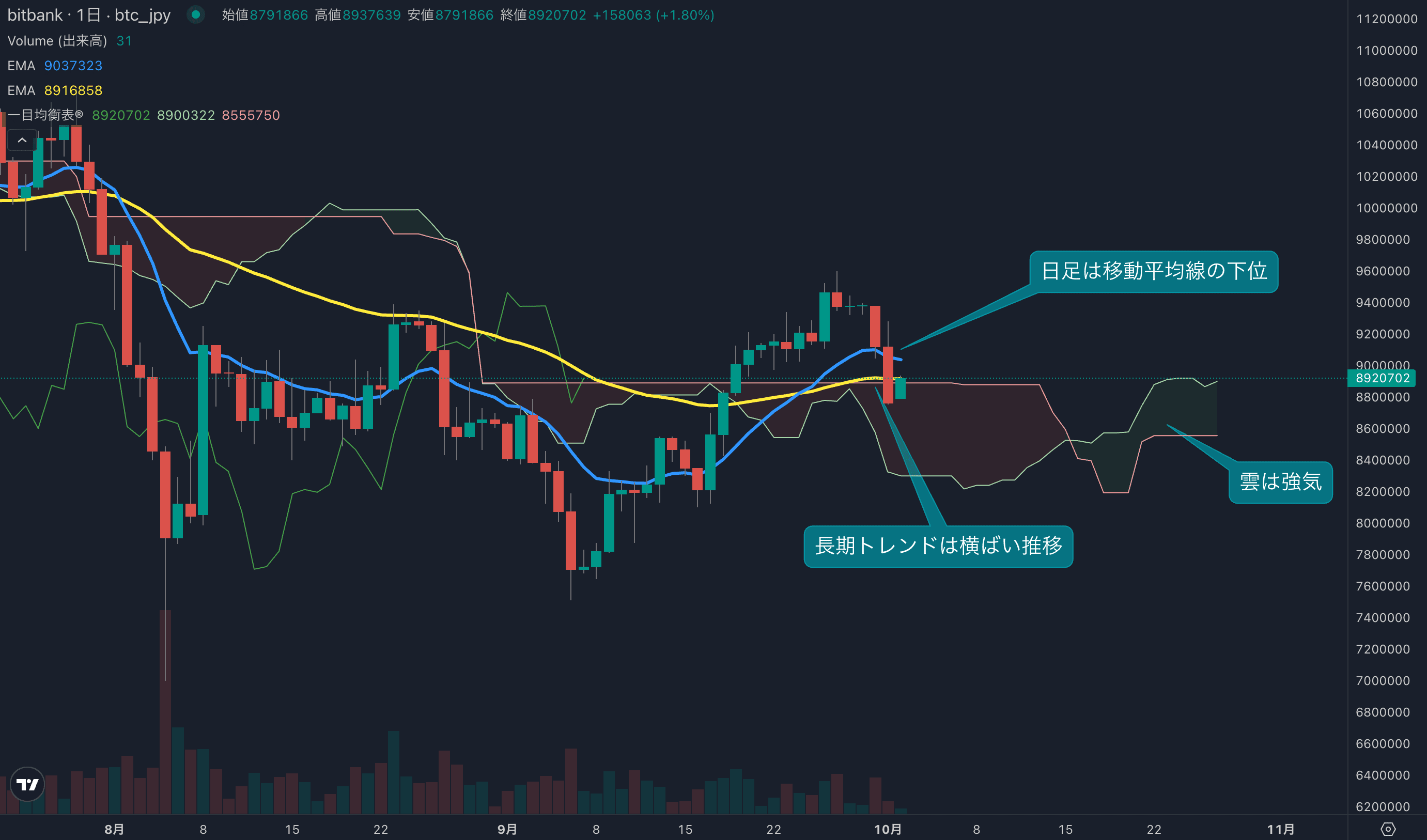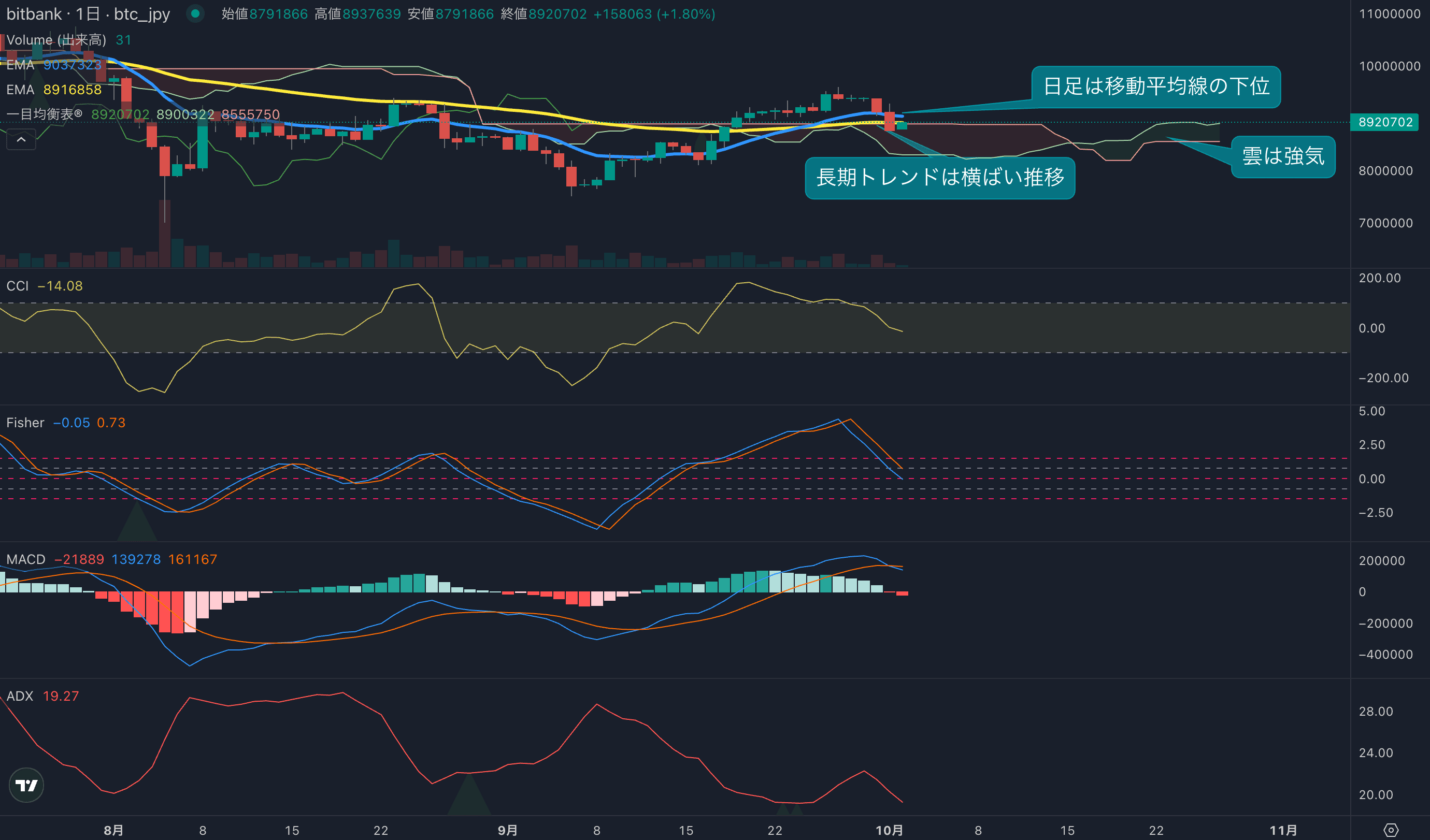 - 価格は14EMA(905.7万円)を下回り弱気示唆です。53EMA(891.7万円)は横ばいとなり、長期トレンドも強気です。一目均衡表の雲は先行スパン1(886.6万円)が先行スパン2(855.5万円)を上回り強気示唆です。