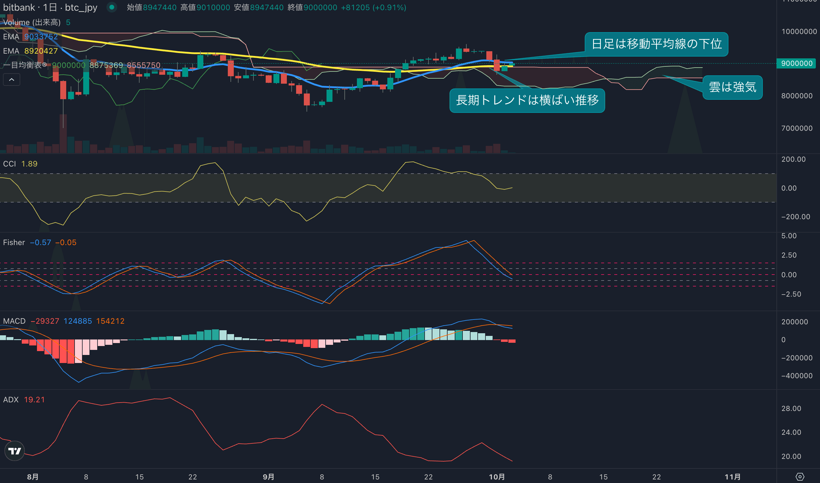 - 価格は14EMA(903.7万円)を下回り弱気示唆です。53EMA(891.7万円)は横ばいとなり、長期トレンドも強気です。一目均衡表の雲は先行スパン1(887.5万円)が先行スパン2(855.5万円)を上回り強気示唆です。