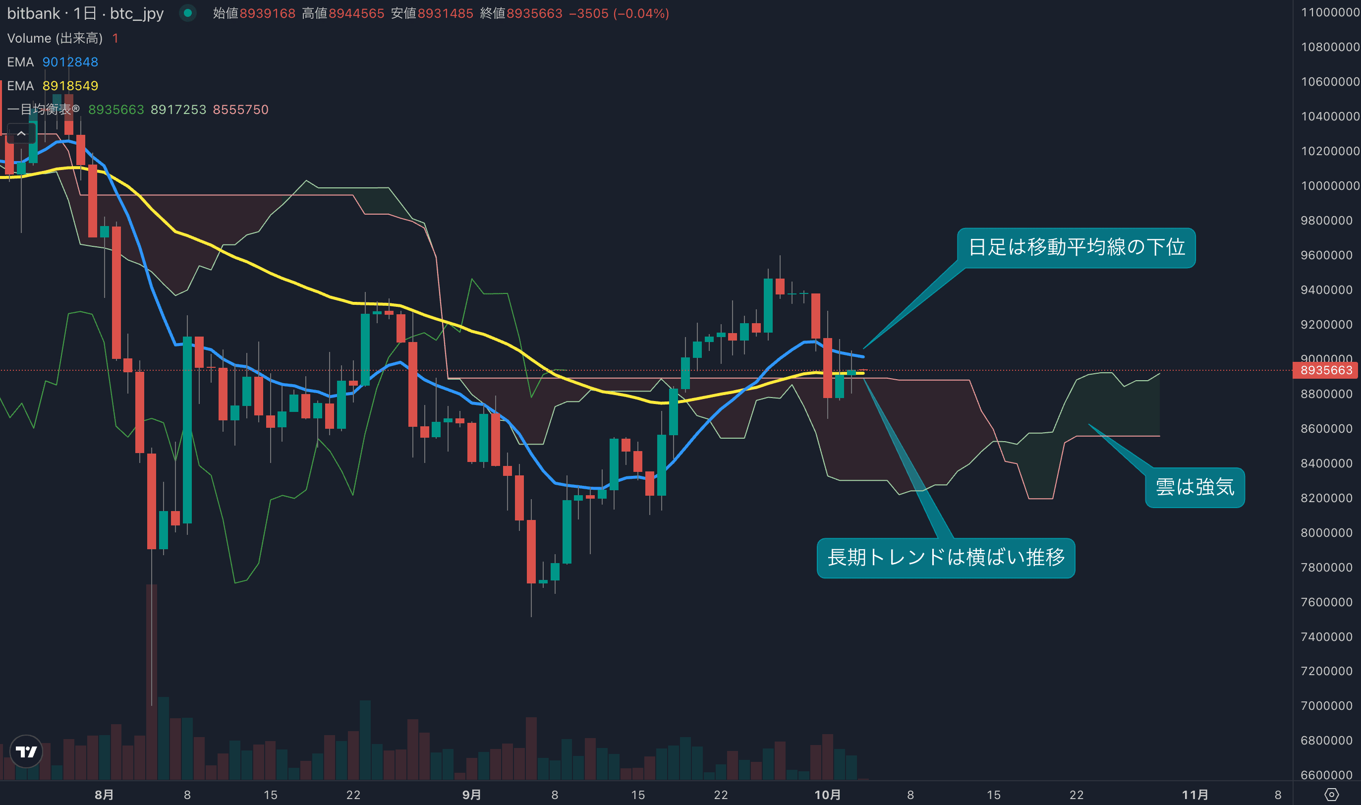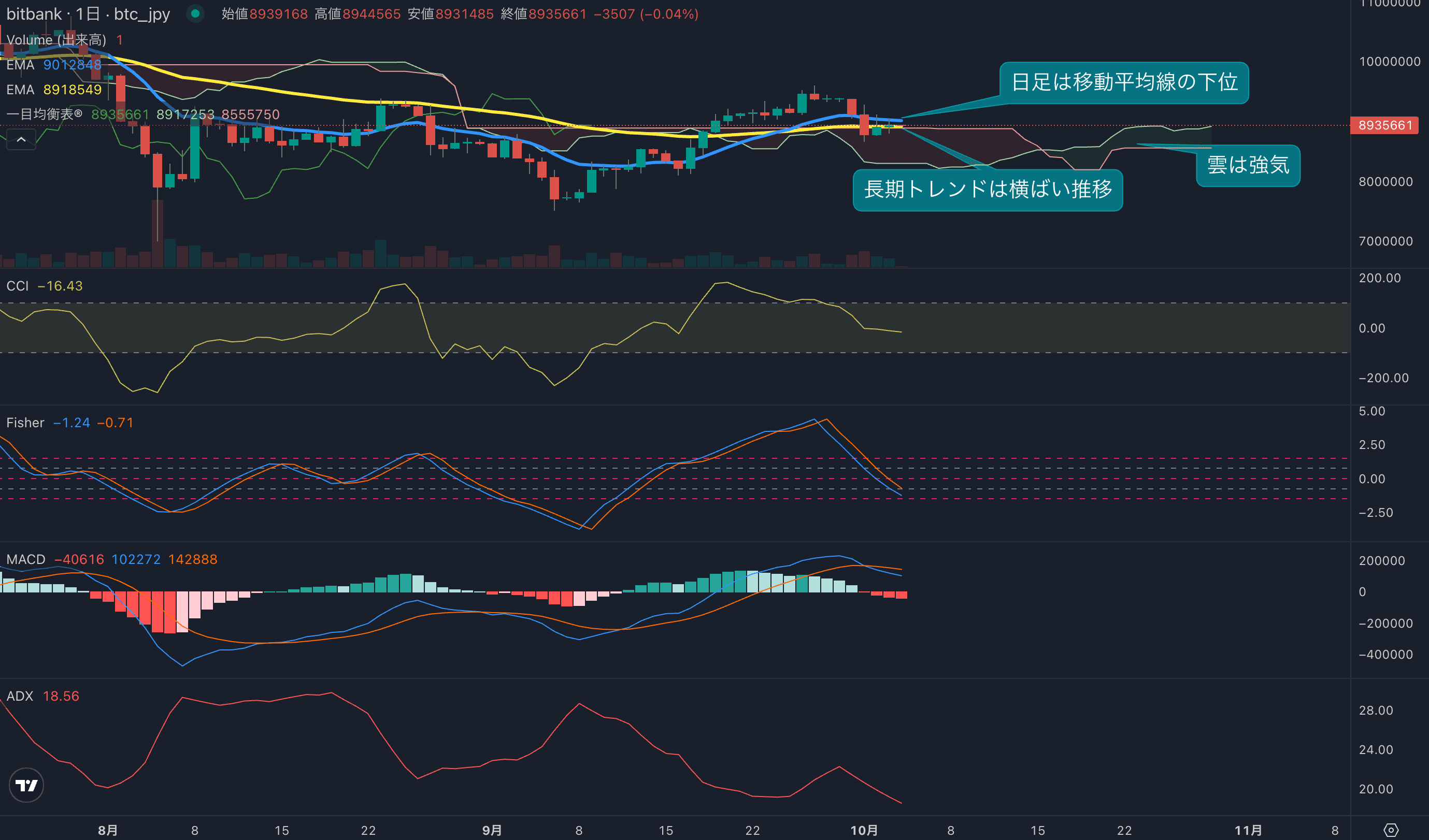 - 価格は14EMA(902.4万円)を下回り弱気示唆です。53EMA(891.7万円)は横ばいとなり、長期トレンドは中立です。一目均衡表の雲は先行スパン1(887.5万円)が先行スパン2(855.5万円)を上回り強気示唆です。