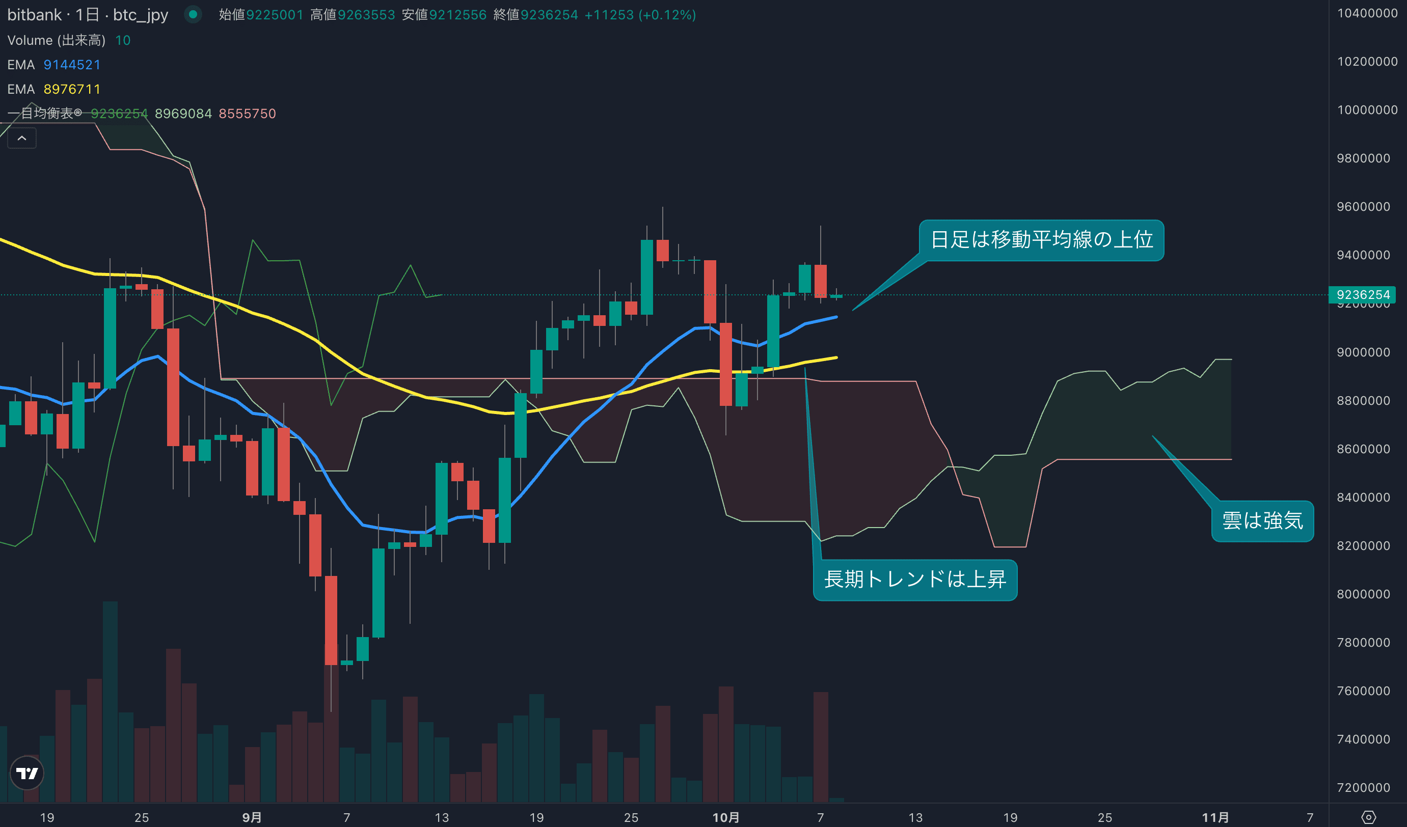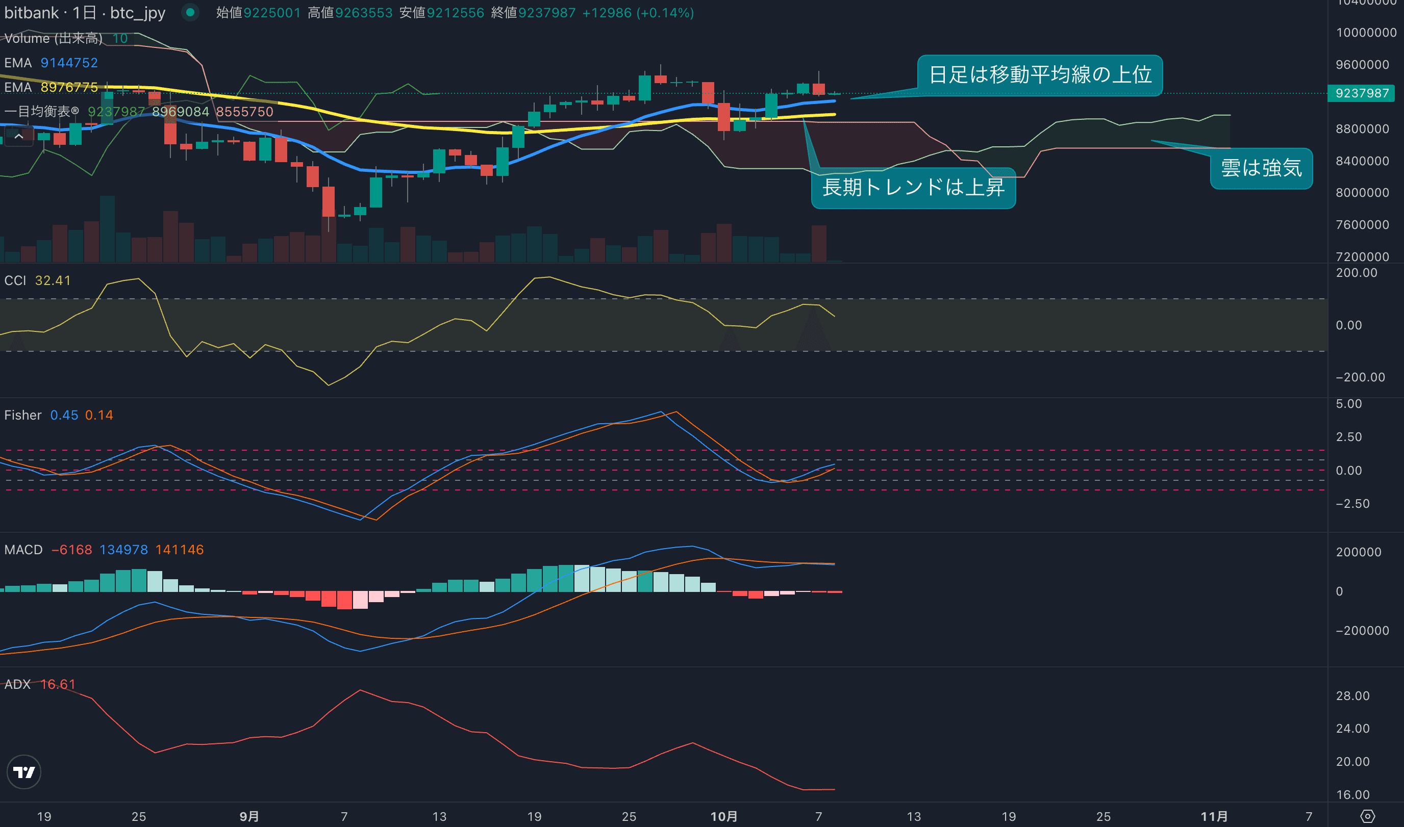 - 価格は14EMA(913.0万円)を上回り強気示唆です。53EMA(896.6万円)は上昇しており、長期トレンドも強気です。一目均衡表の雲は先行スパン1(896.9万円)が先行スパン2(855.5万円)を上回り強気示唆です。