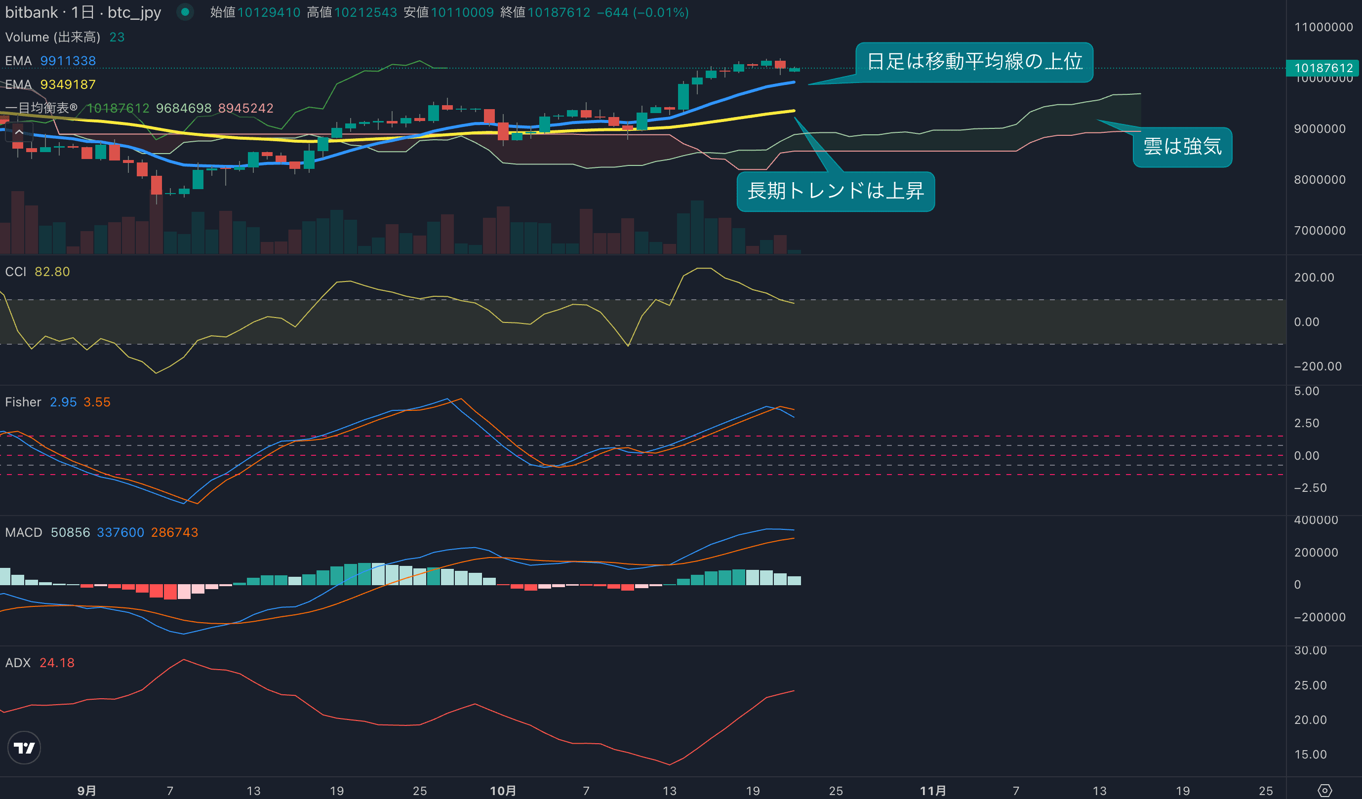 - オシレーター系インジケーターは、短期で下落し始めています。CCIは97まで下落Fisherではデッドクロスが発生しました。長期オシレーターのMACDは上昇傾向となっています。