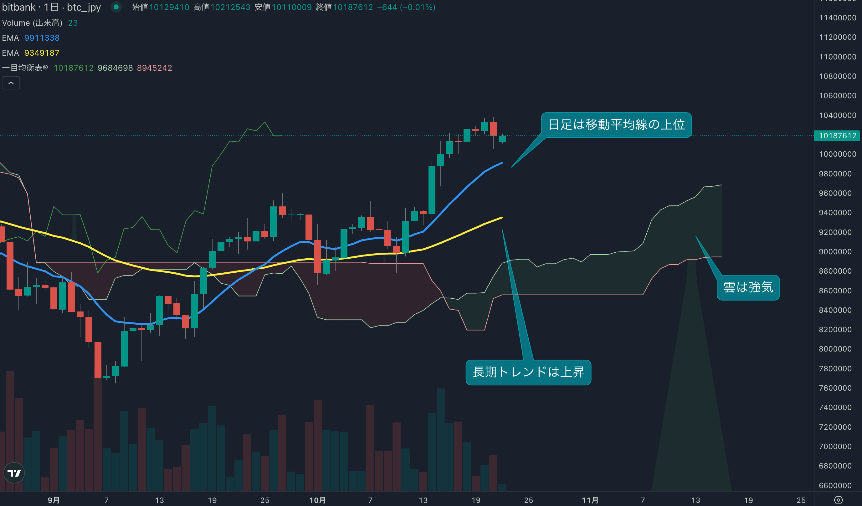 - 価格は14EMA(986.5万円)を上回り強気示唆です。53EMA(931.5万円)は上昇しており、長期トレンドも強気です。一目均衡表の雲は先行スパン1(966.9万円)が先行スパン2(894.5万円)を上回り強気示唆です。