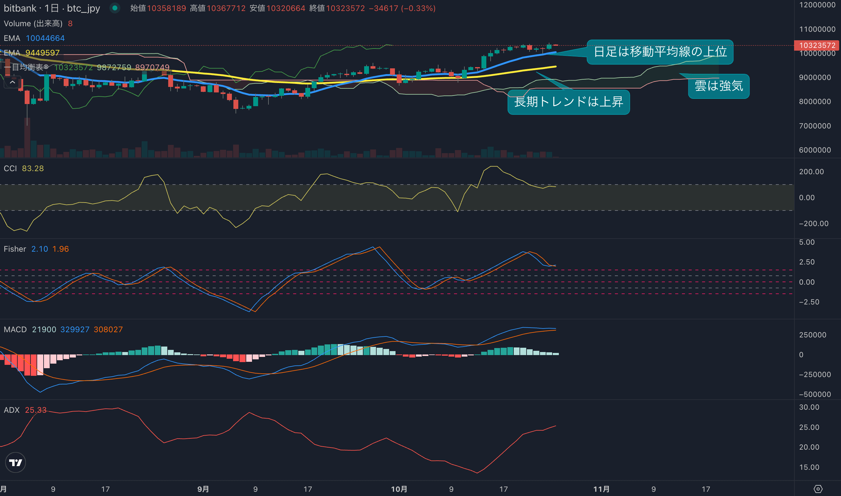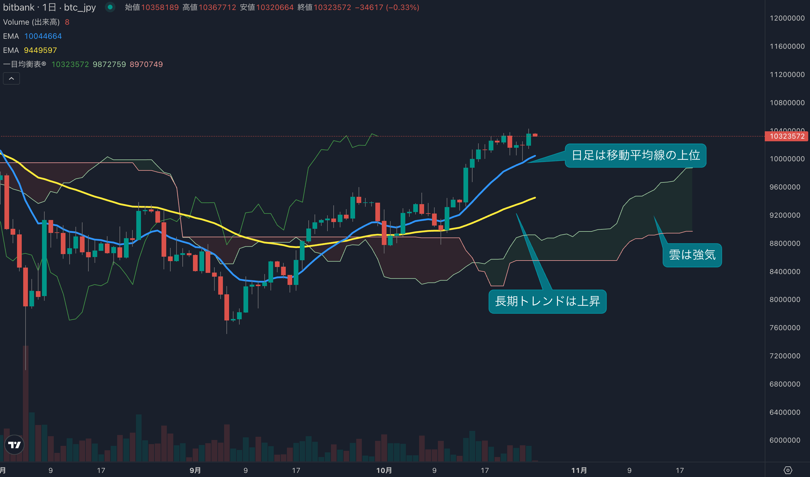 - 価格は14EMA(1000.1万円)を上回り強気示唆です。53EMA(941.5万円)は上昇しており、長期トレンドも強気です。一目均衡表の雲は先行スパン1(986.8万円)が先行スパン2(897.0万円)を上回り強気示唆です。