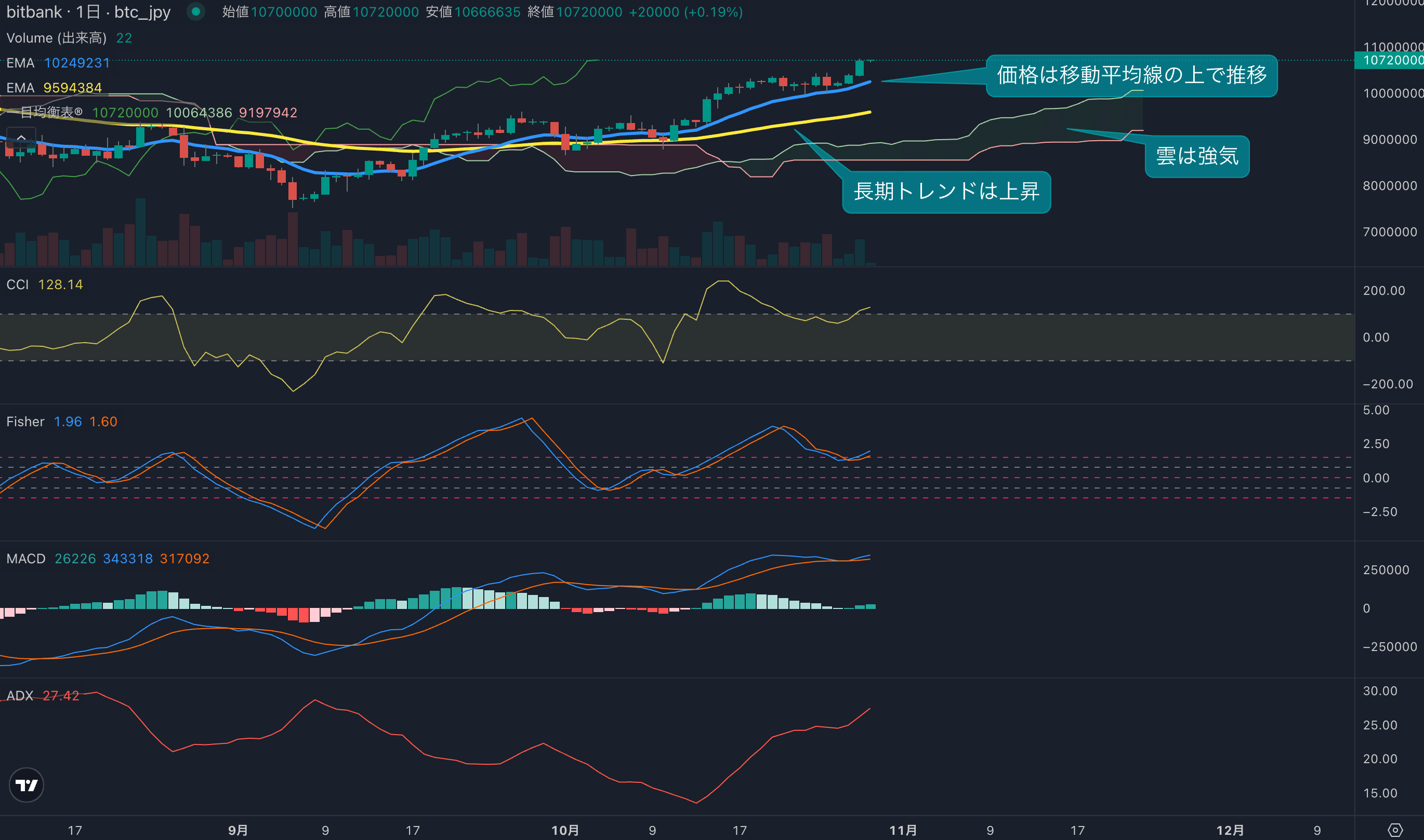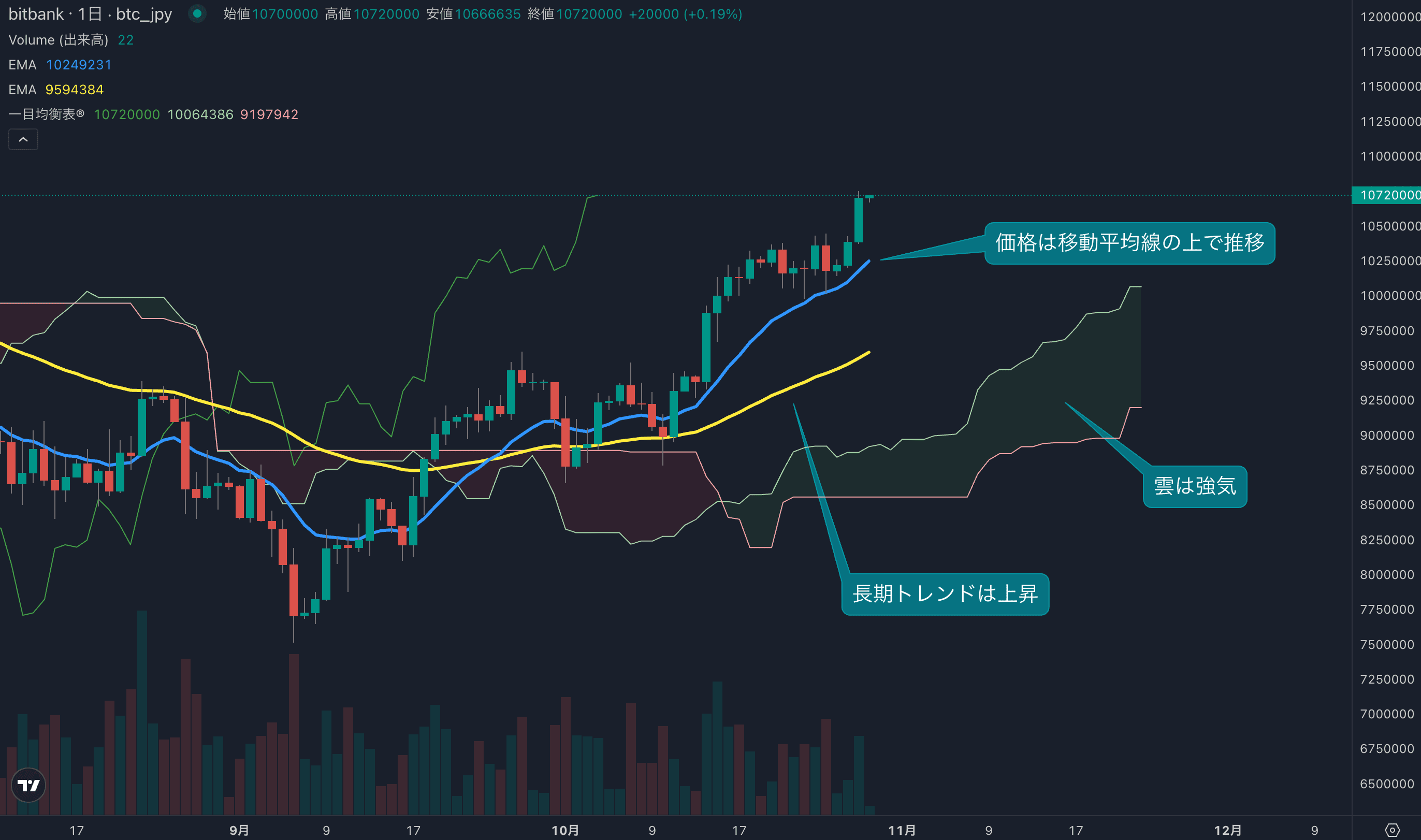 - 価格は14EMA(1017.6万円)を上回り強気示唆です。53EMA(955.1万円)は上昇しており、長期トレンドも強気です。一目均衡表の雲は先行スパン1(1006.4万円)が先行スパン2(919.7万円)を上回り強気示唆です。