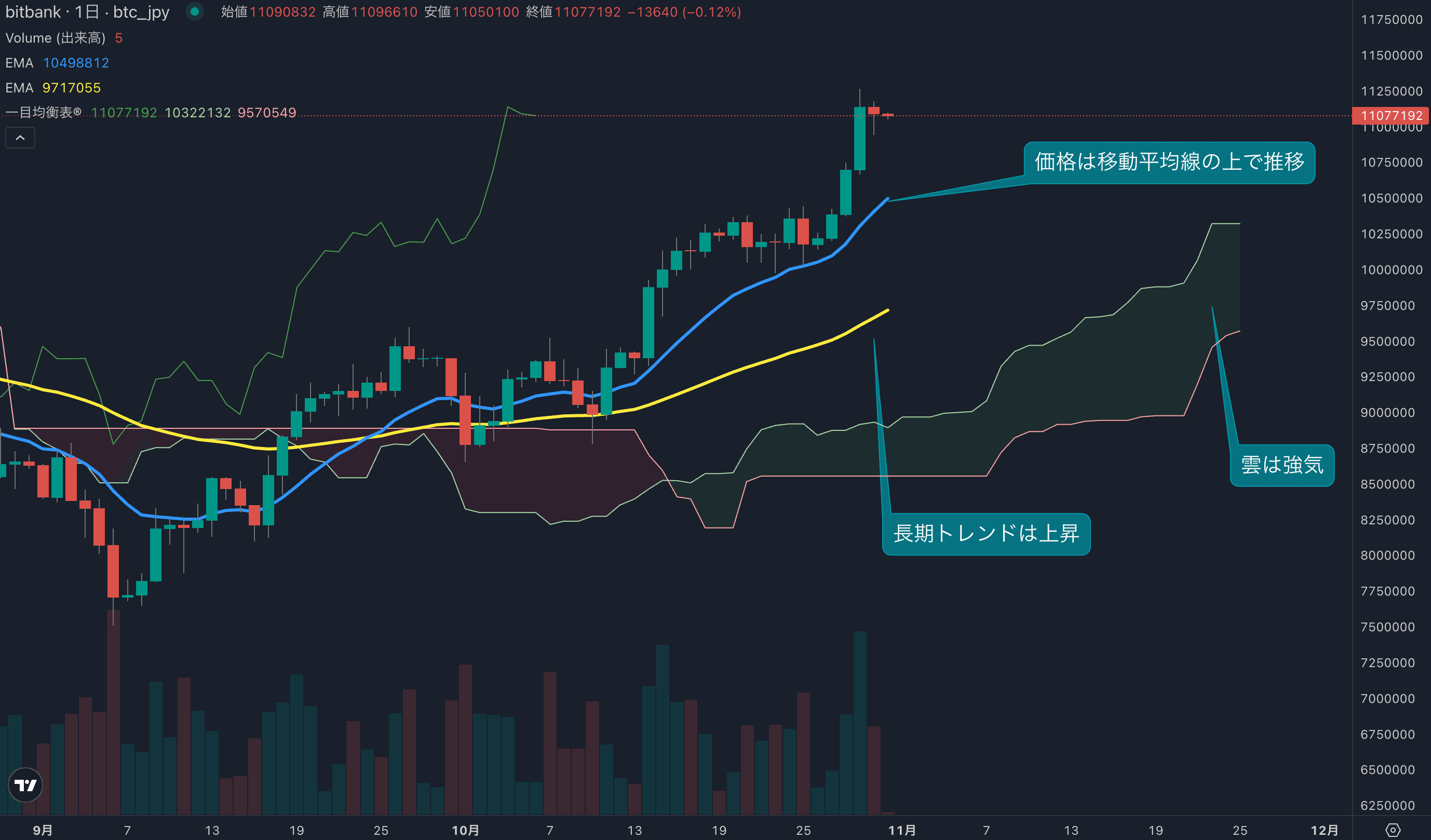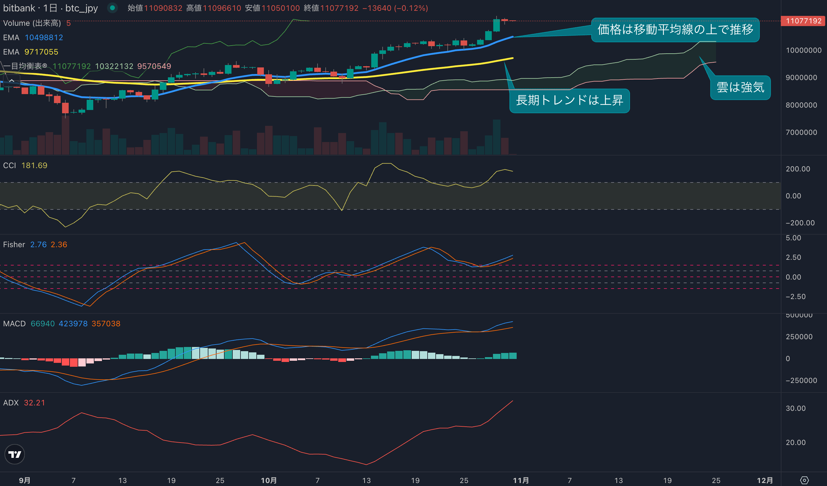 - 価格は14EMA(1040万円)を上回り強気示唆です。53EMA(966万円)は上昇しており、長期トレンドも強気です。一目均衡表の雲は先行スパン1(1032万円)が先行スパン2(953万円)を上回り強気示唆です。