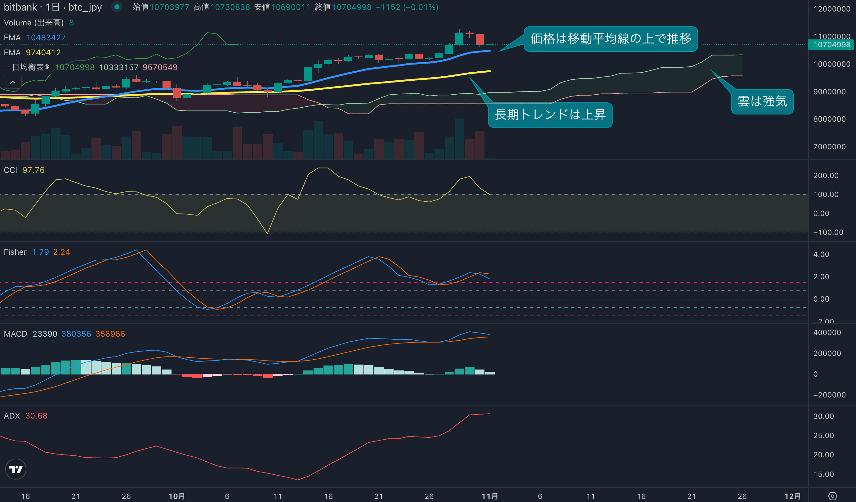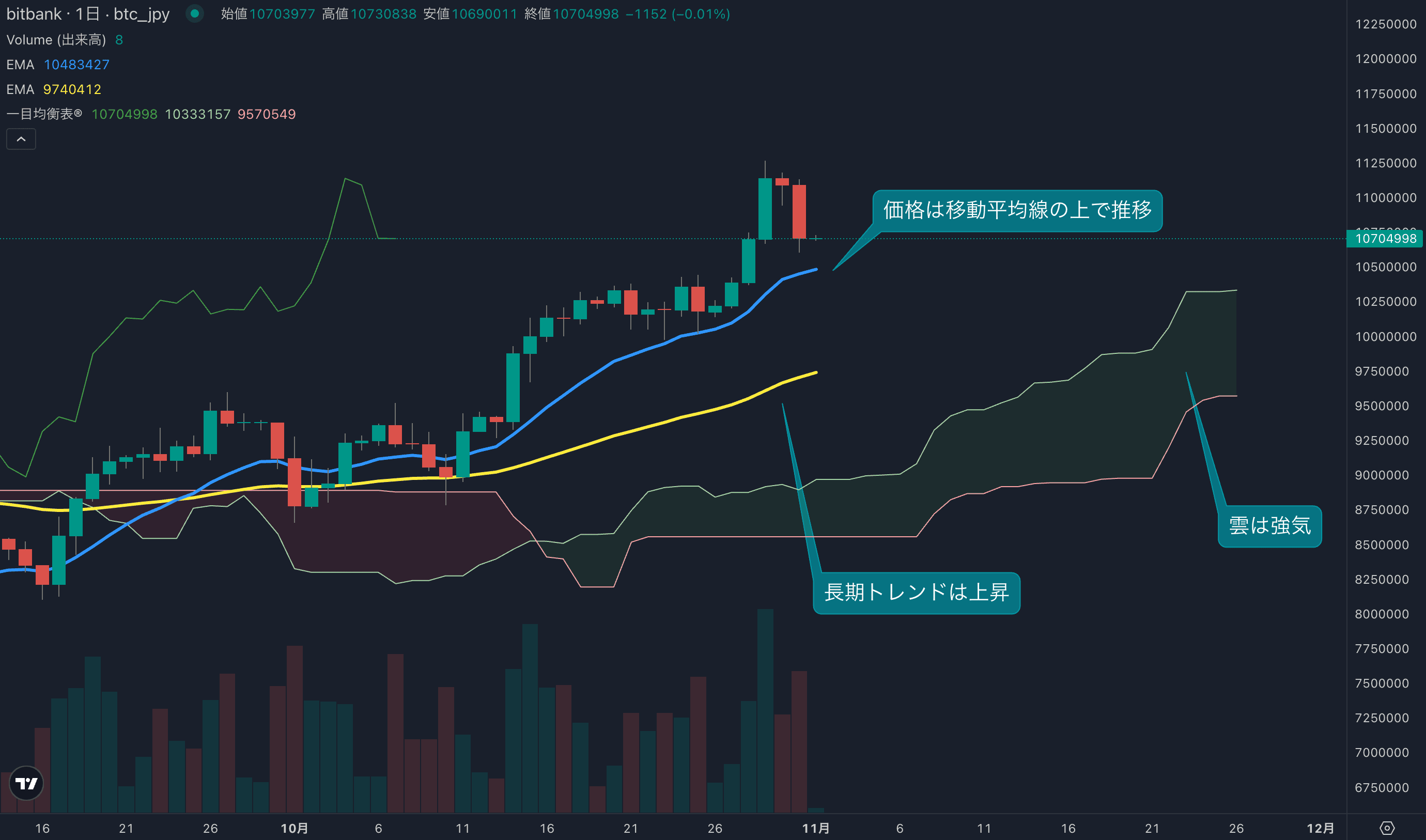 - 価格は14EMA(1044万円)を上回り強気示唆です。53EMA(970万円)は上昇しており、長期トレンドも強気です。一目均衡表の雲は先行スパン1(1032万円)が先行スパン2(957万円)を上回り強気示唆です。