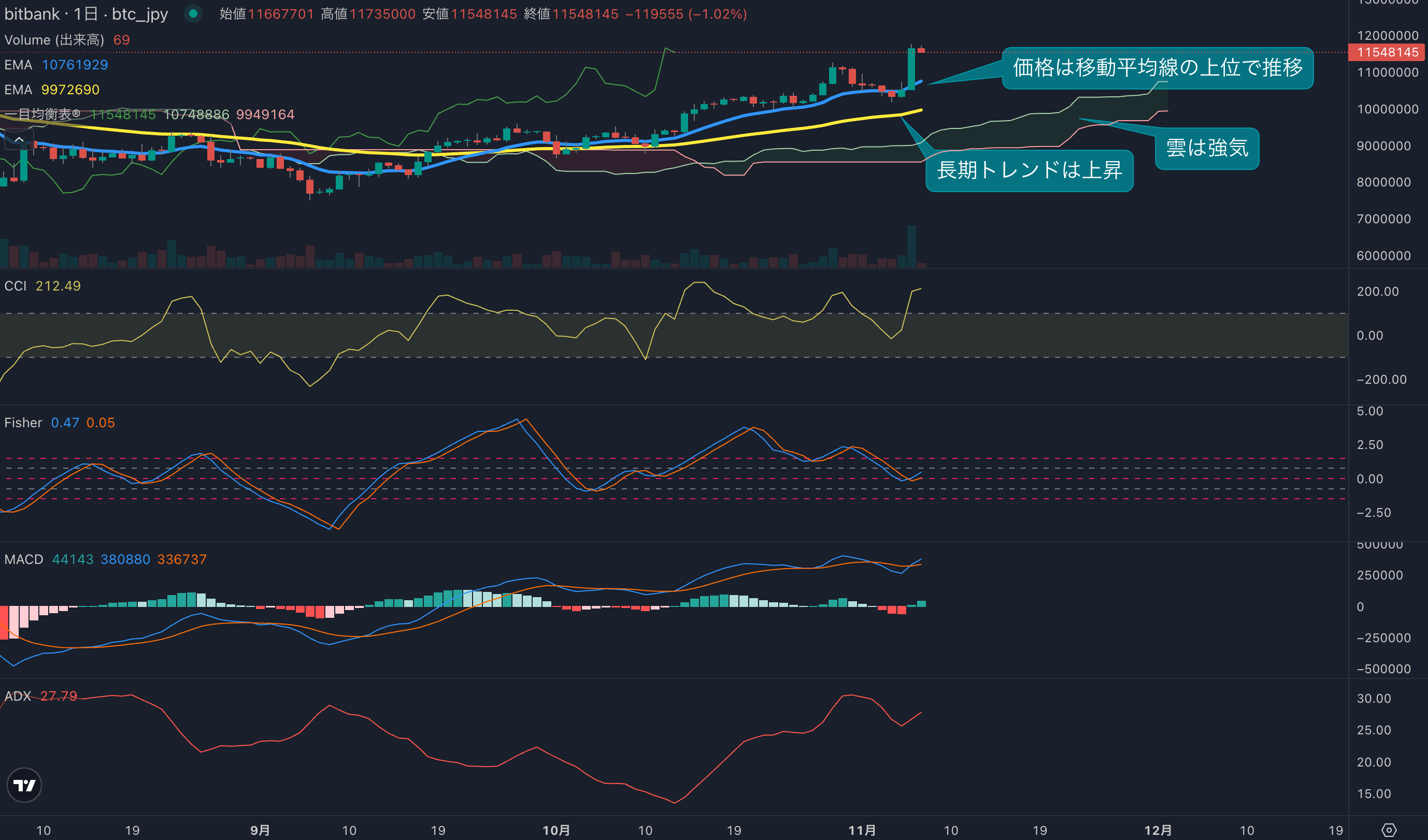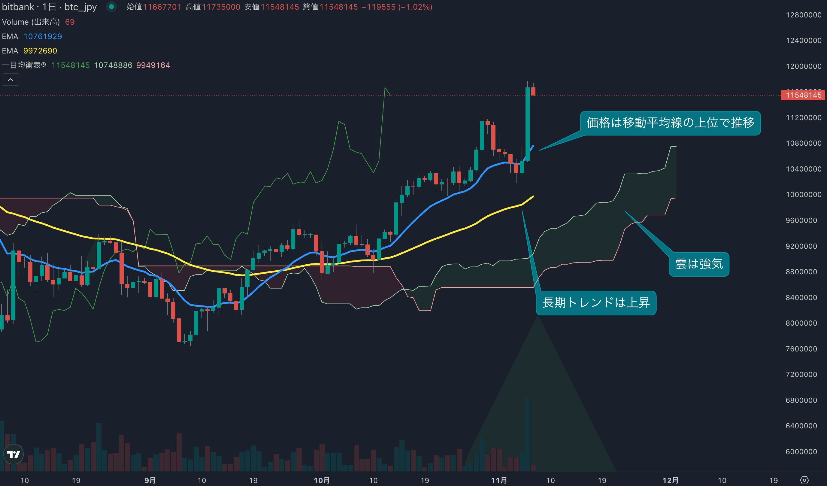 - 価格は14EMA(1064万円)を上回り強気示唆です。53EMA(991万円)は上昇しており、長期トレンドも強気です。一目均衡表の雲は先行スパン1(1074万円)が先行スパン2(993万円)を上回り強気示唆です。