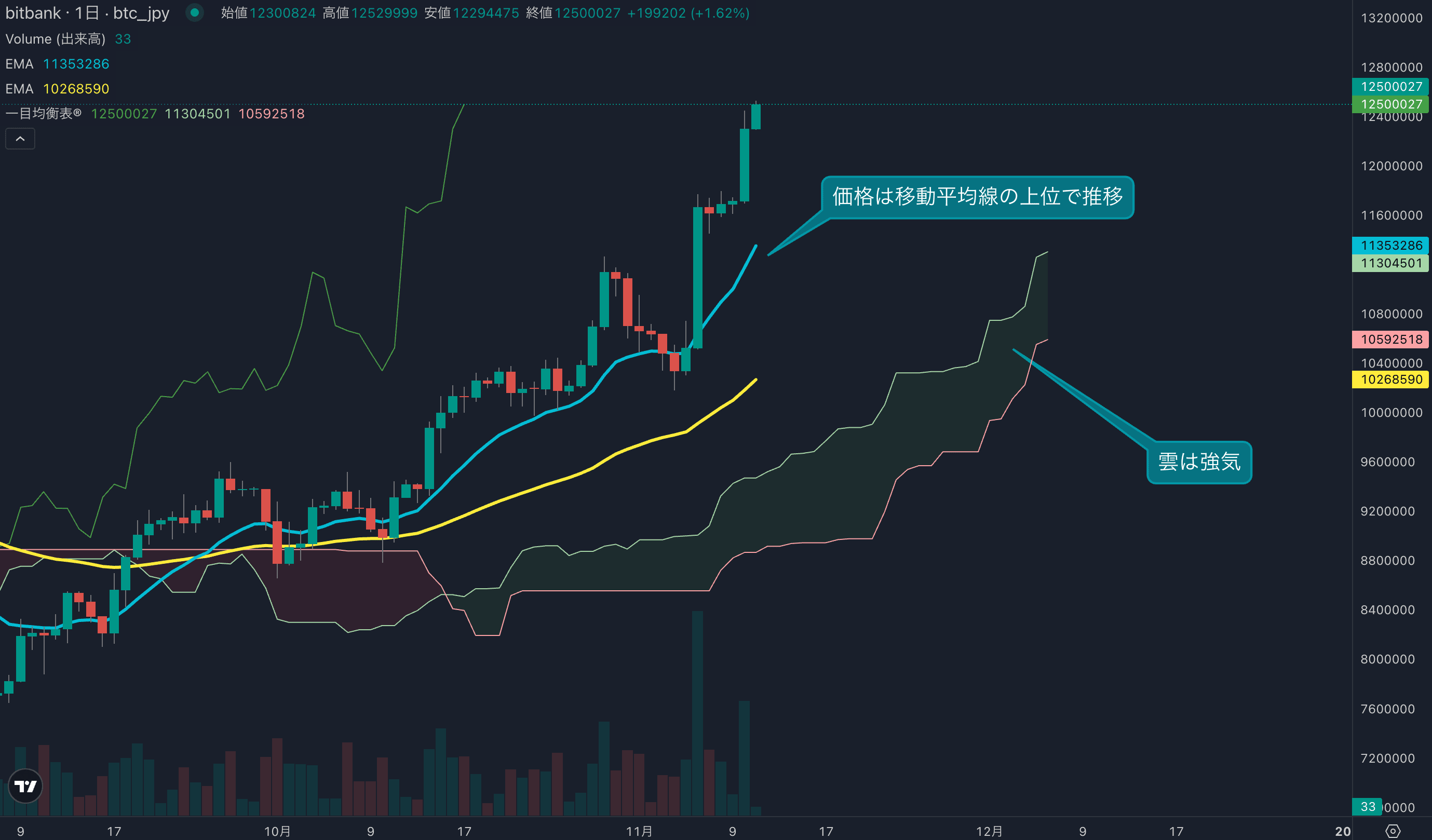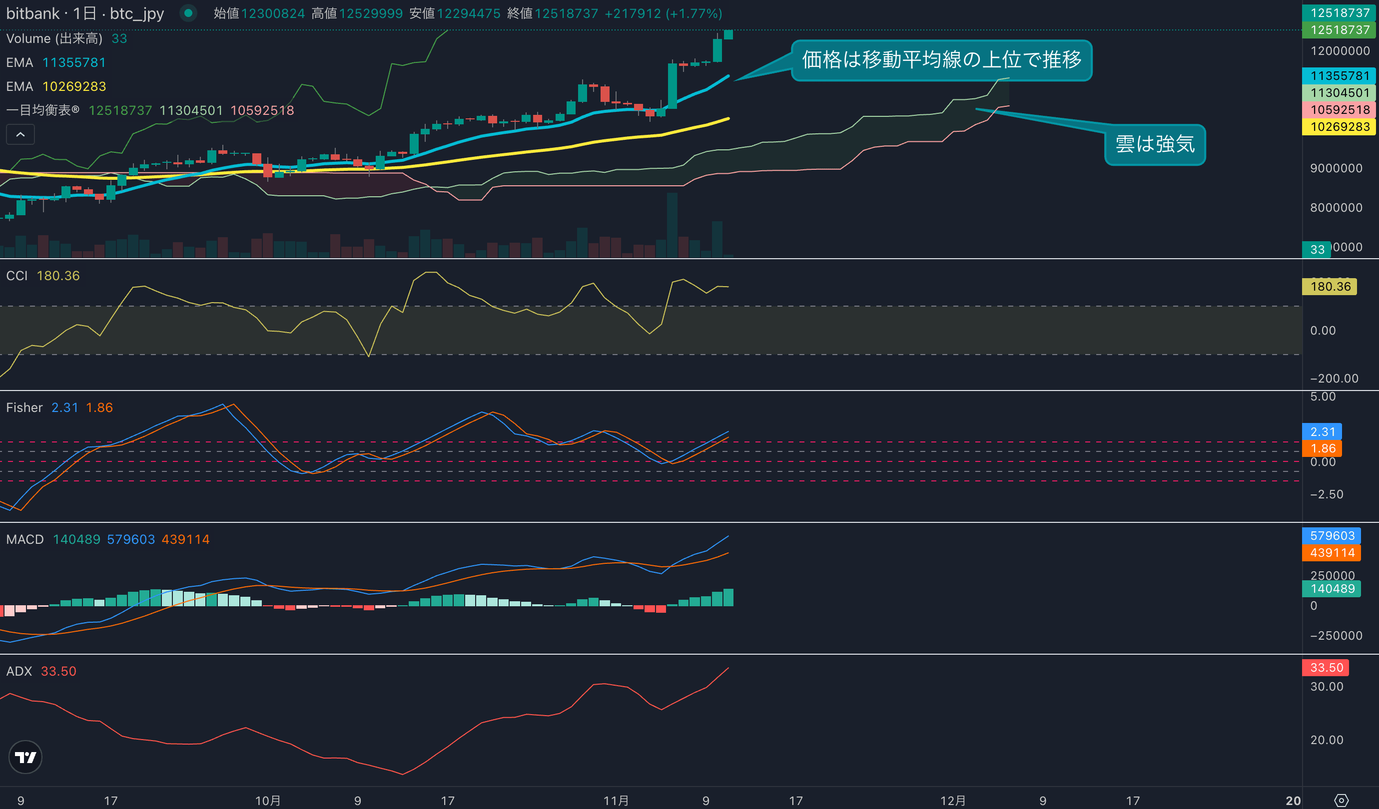 - 価格は14EMA(1117万円)を上回り強気示唆です。53EMA(1018万円)は上昇しており、長期トレンドも強気です。一目均衡表の雲は先行スパン1(1126万円)が先行スパン2(1055万円)を上回り強気示唆です。