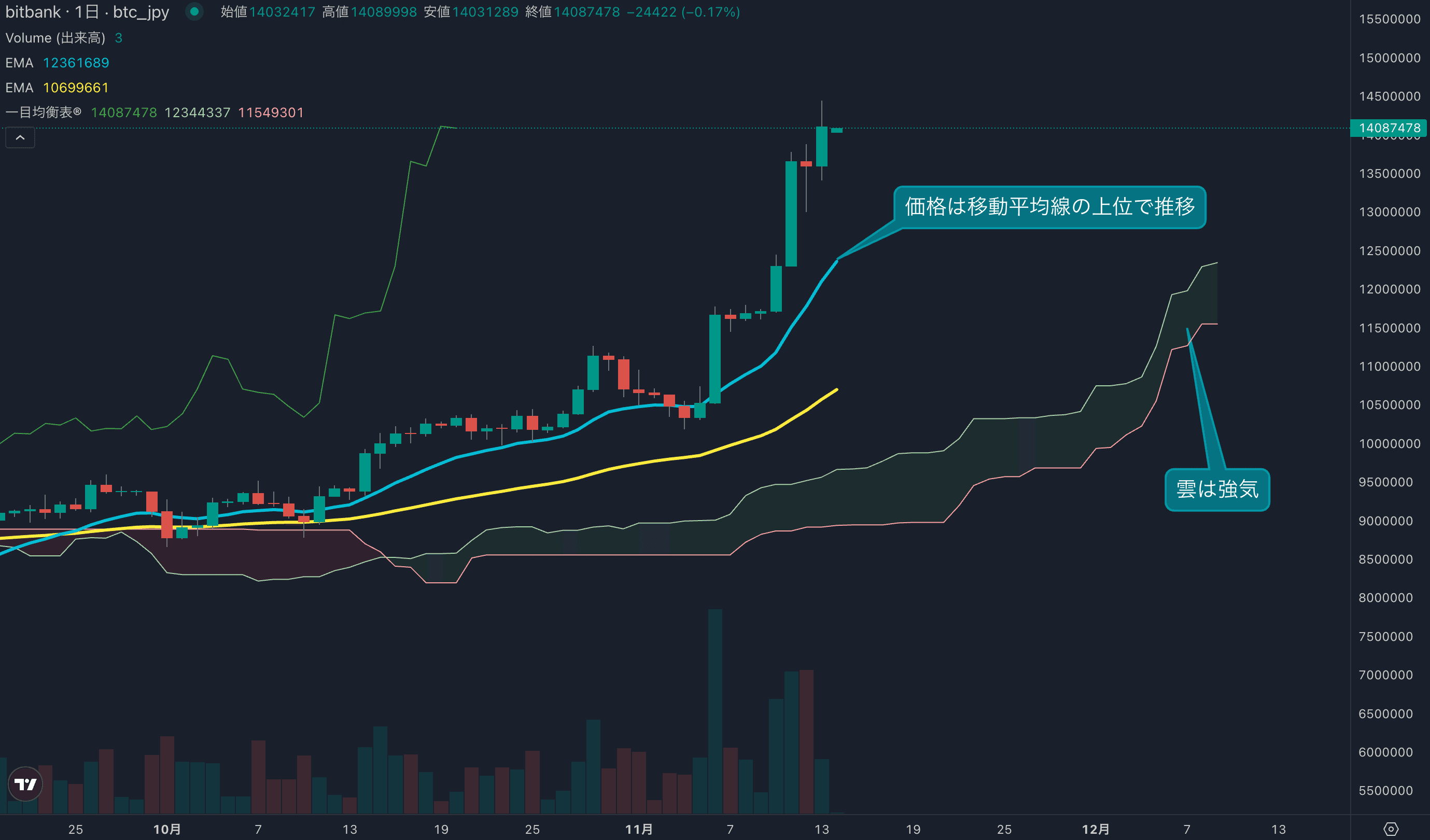 - 価格は14EMA(1209万円)を上回り強気示唆です。53EMA(1056万円)は上昇しており、長期トレンドも強気です。一目均衡表の雲は先行スパン1(1229万円)が先行スパン2(1154万円)を上回り強気示唆です。