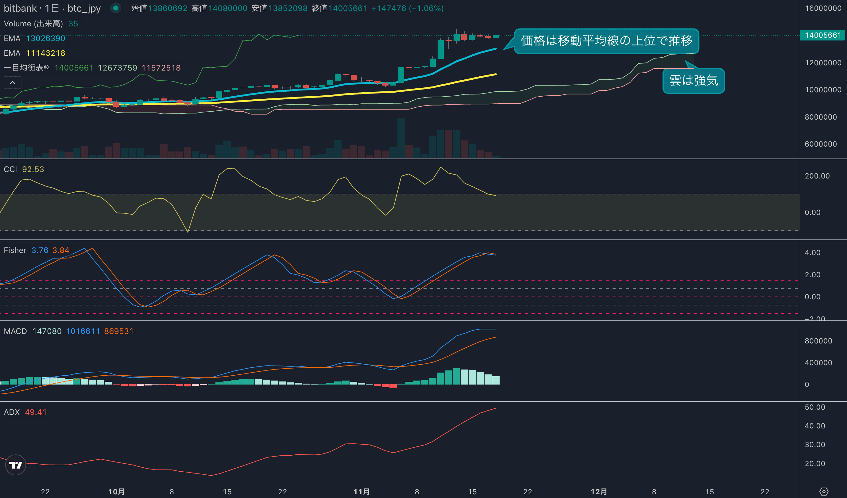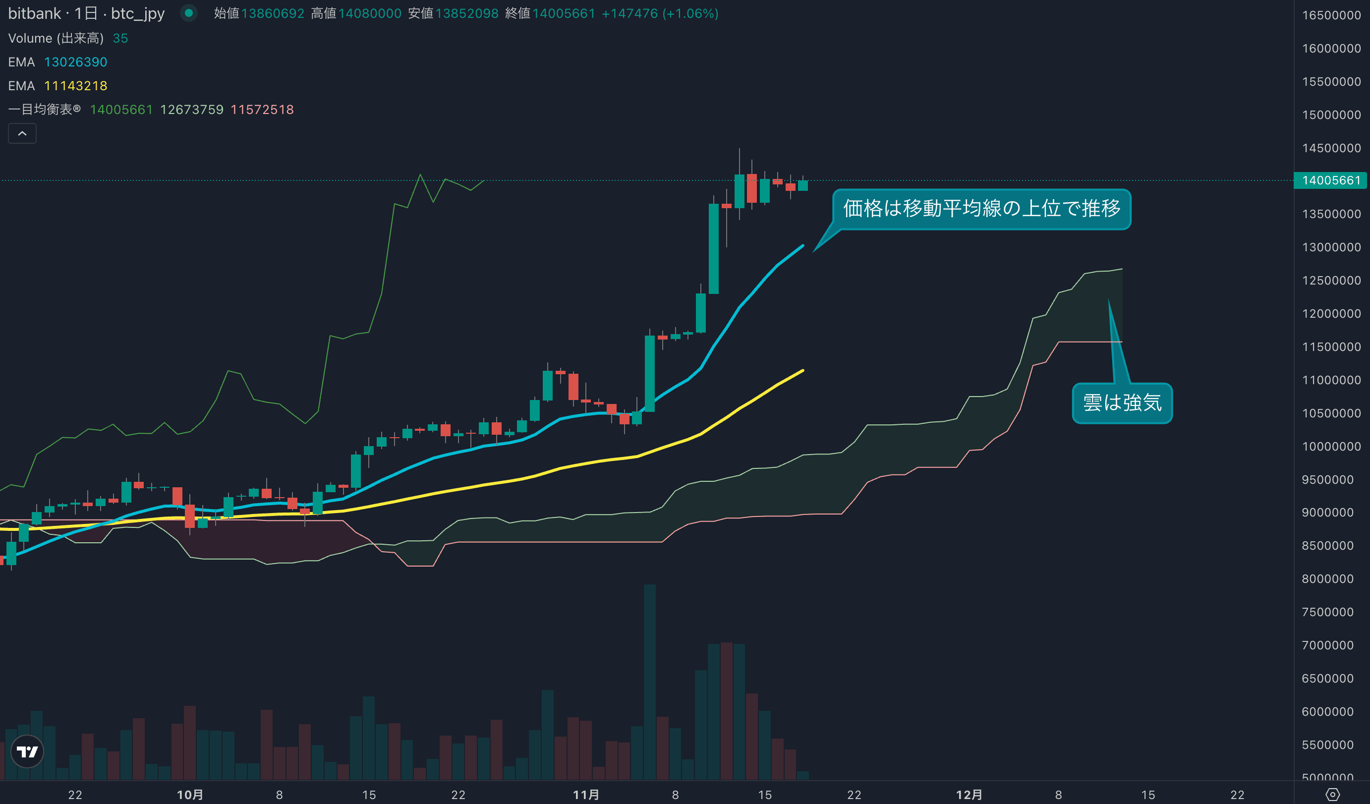 - 価格は14EMA(1288万円)を上回り強気示唆です。53EMA(1103万円)は上昇しており、長期トレンドも強気です。一目均衡表の雲は先行スパン1(1264万円)が先行スパン2(1157万円)を上回り強気示唆です。