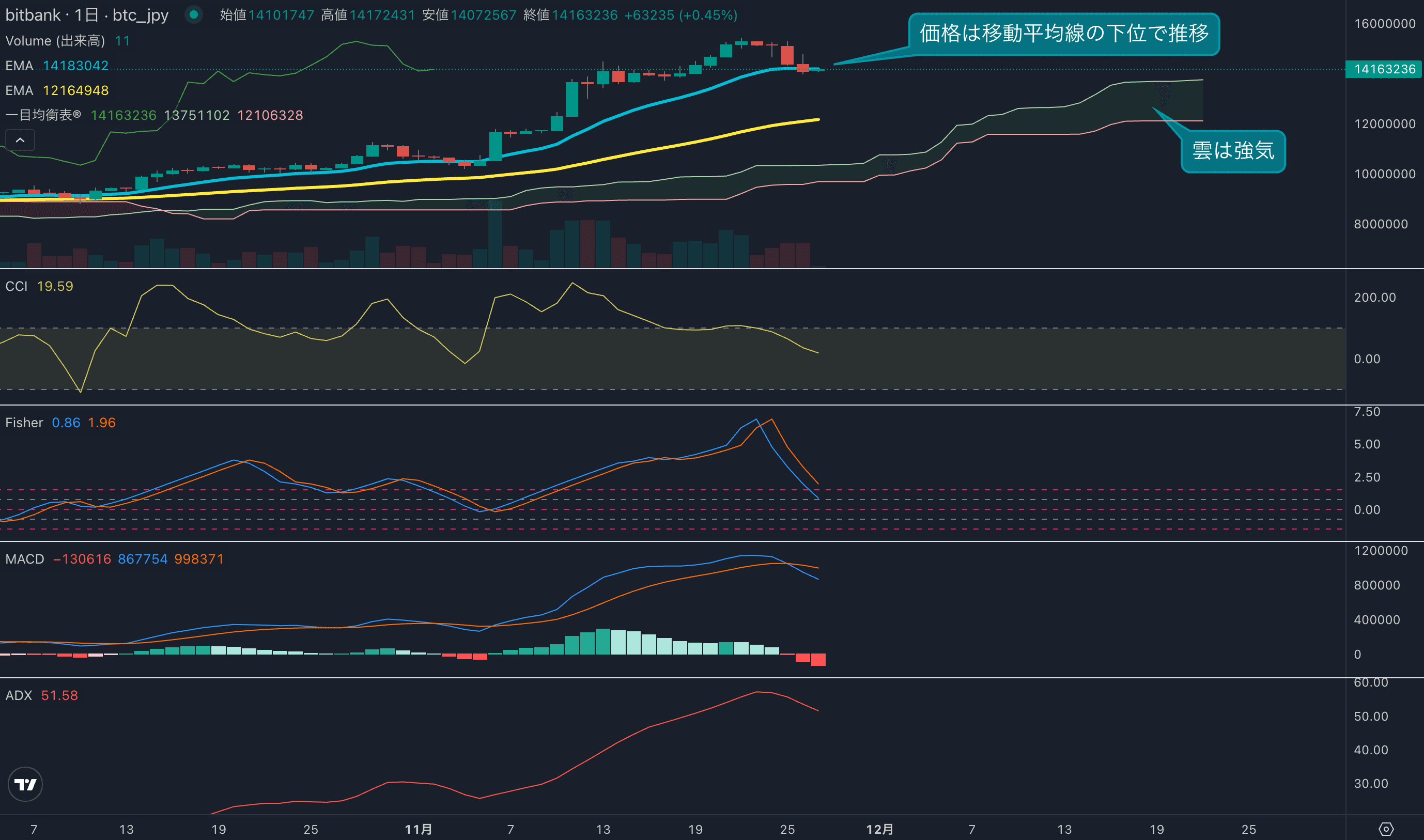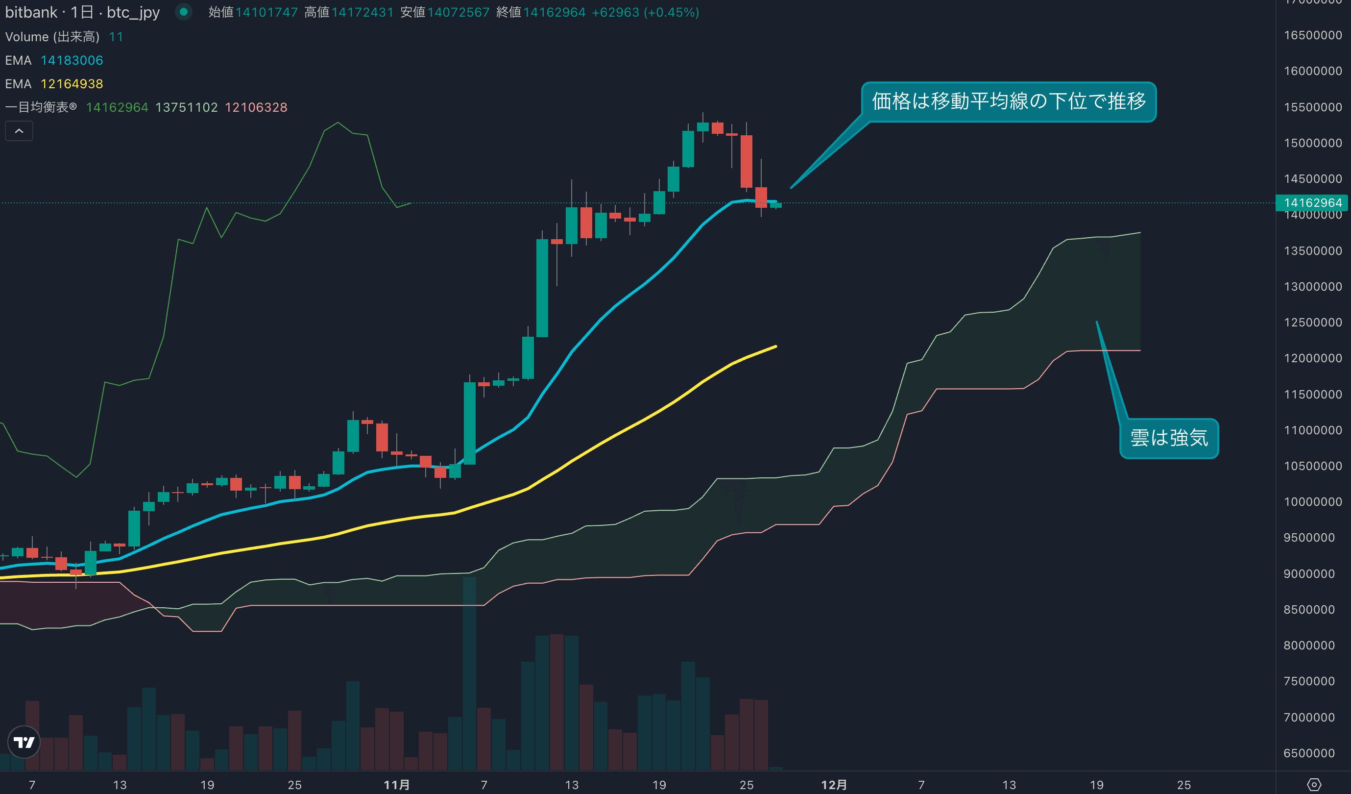 - 価格は14EMA(1418万円)を下回り弱気示唆です。53EMA(1208万円)は上昇しており、長期トレンドは強気です。一目均衡表の雲は先行スパン1(1371万円)が先行スパン2(1210万円)を上回り強気示唆です。