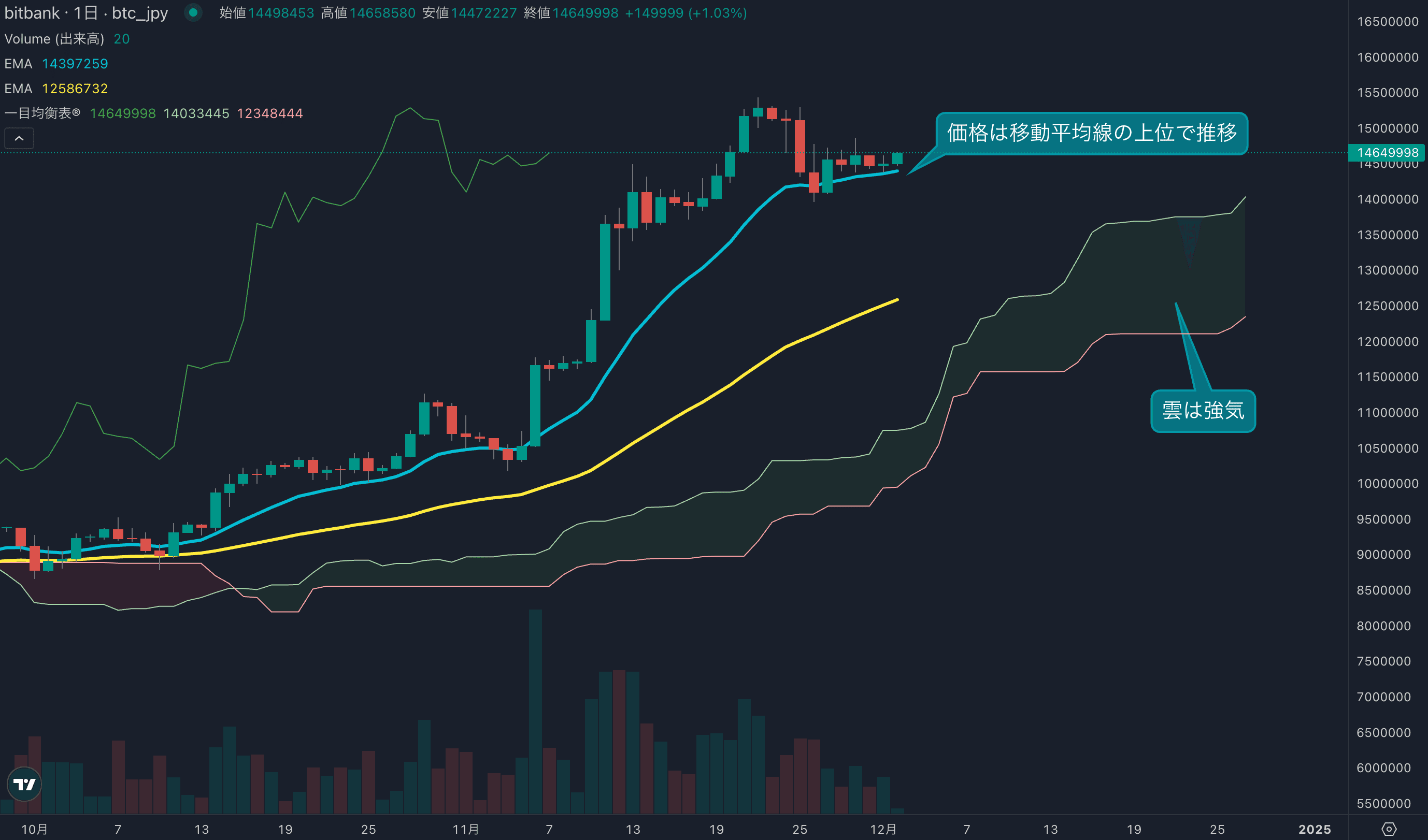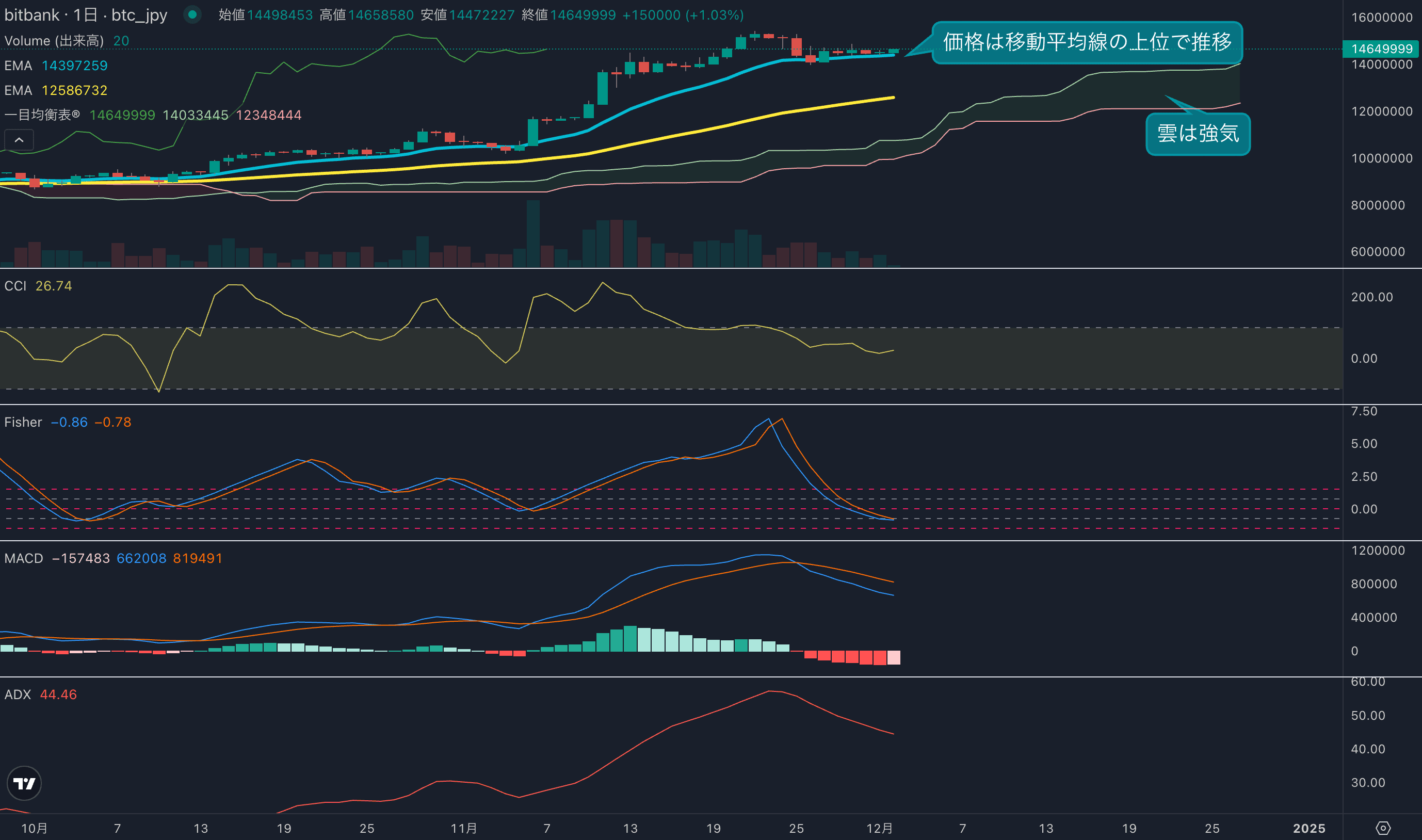 - 価格は14EMA(1435万円)を上回り強気示唆です。53EMA(1250万円)は上昇しており、長期トレンドも強気です。一目均衡表の雲は先行スパン1(1380万円)が先行スパン2(1218万円)を上回り強気示唆です。