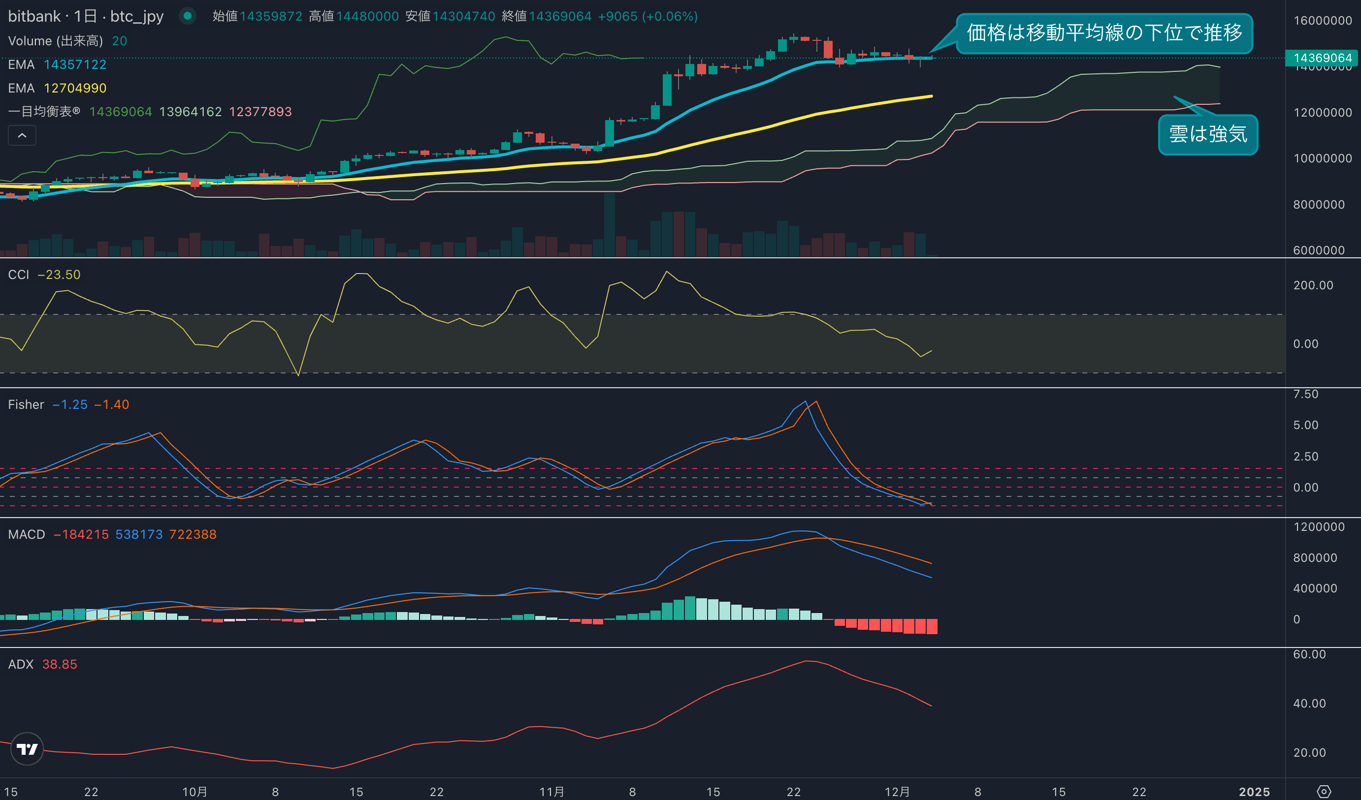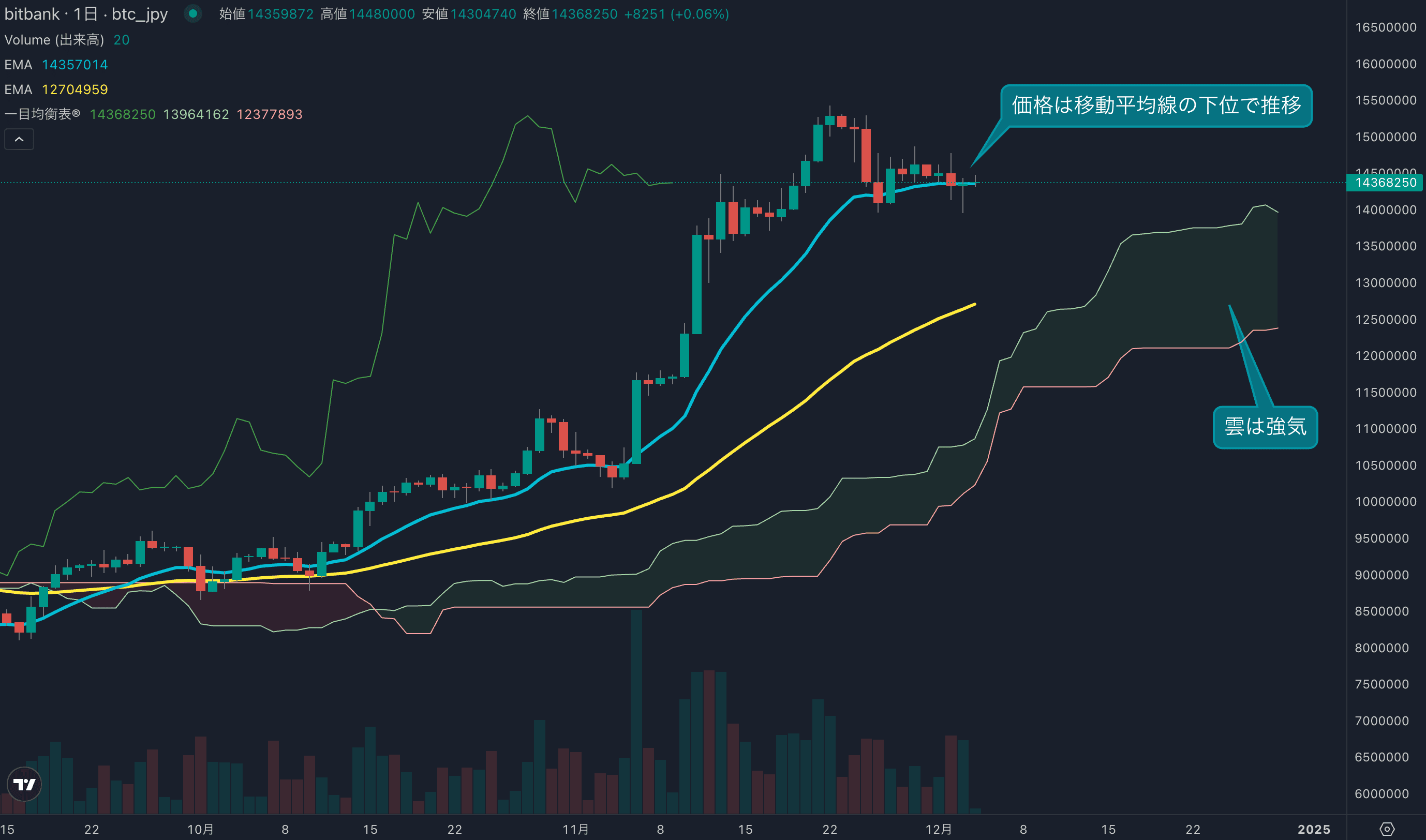 - 価格は14EMA(1435万円)を上回り強気示唆です。53EMA(1264万円)は上昇しており、長期トレンドも強気です。一目均衡表の雲は先行スパン1(1406万円)が先行スパン2(1234万円)を上回り強気示唆です。