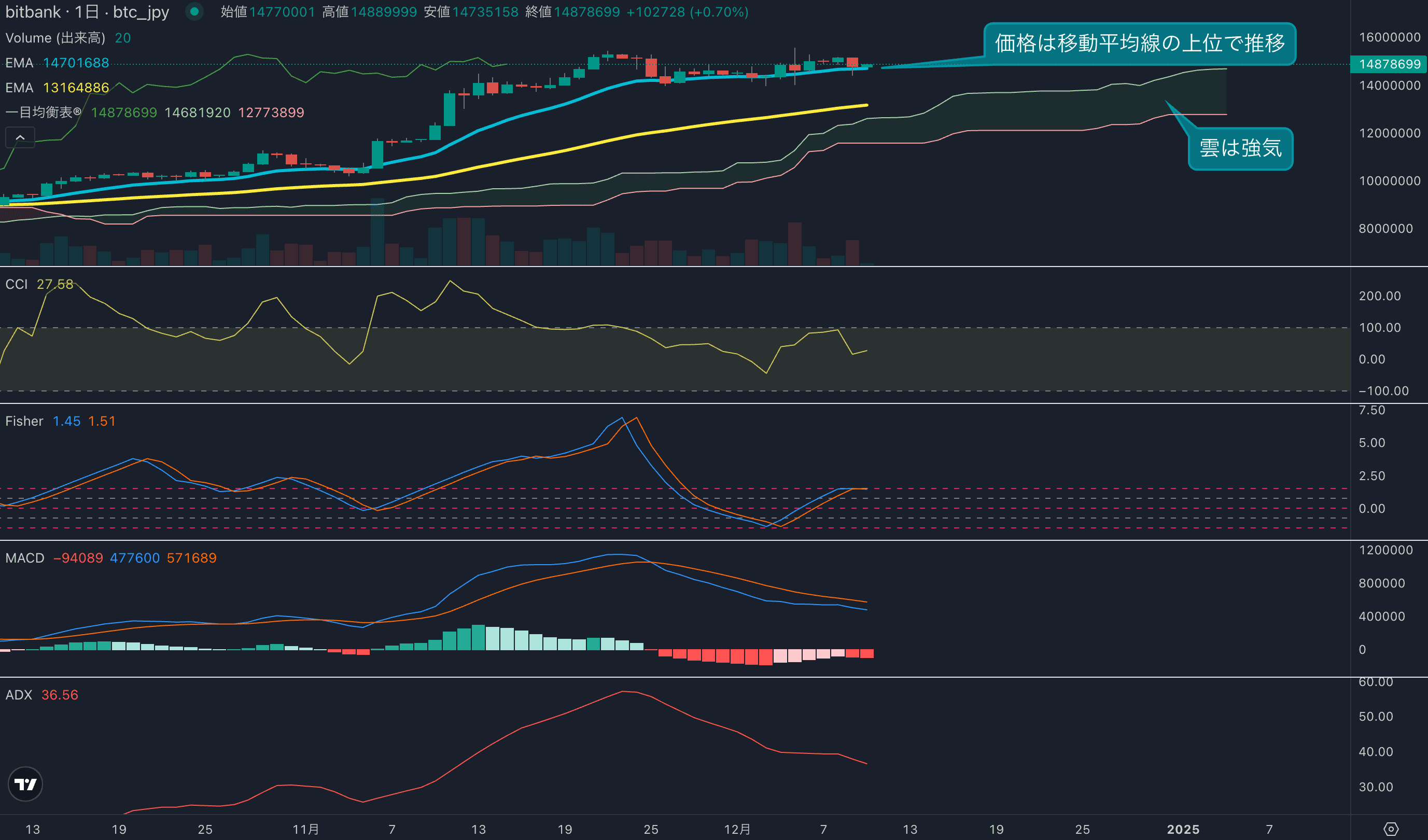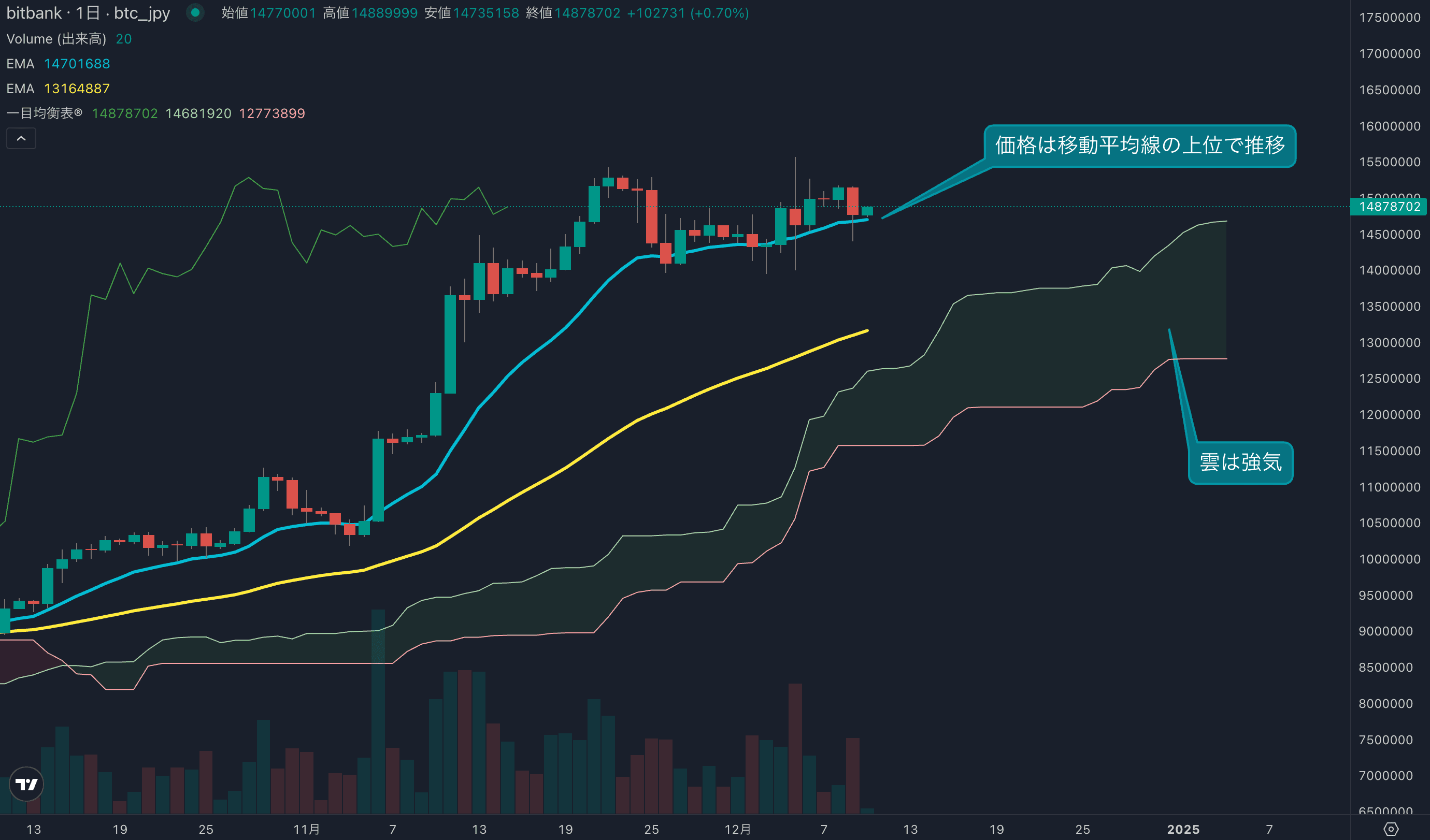 - 価格は14EMA(1467万円)を上回り強気示唆です。53EMA(1309万円)は上昇しており、長期トレンドも強気です。一目均衡表の雲は先行スパン1(1466万円)が先行スパン2(1277万円)を上回り強気示唆です。