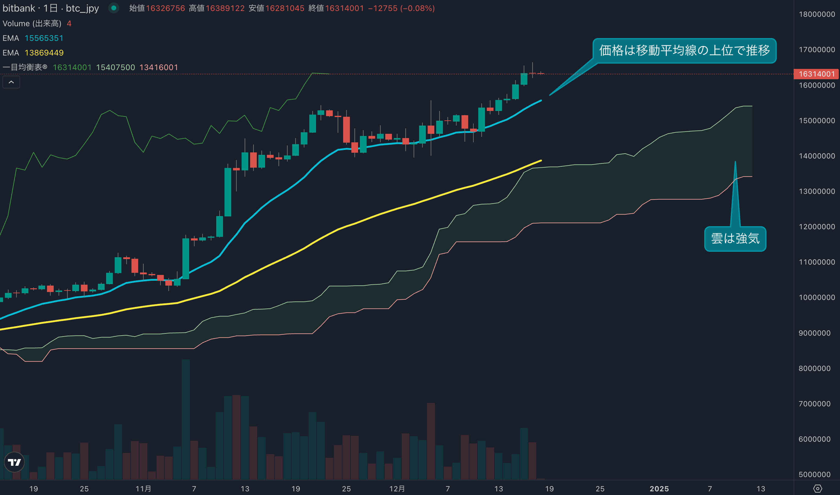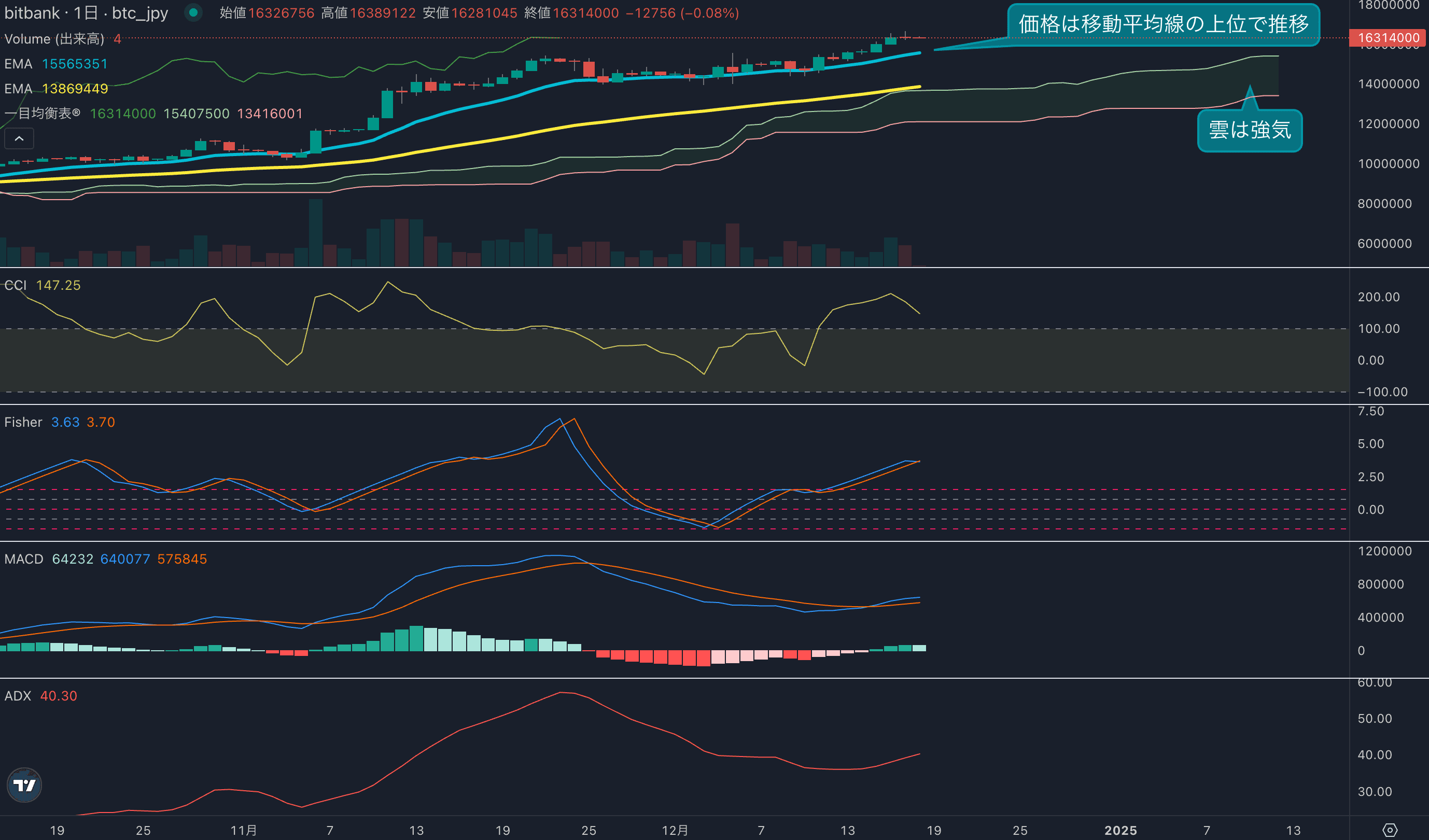 - 価格は14EMA(1545万円)を上回り強気示唆です。53EMA(1377万円)は上昇しており、長期トレンドも強気です。一目均衡表の雲は先行スパン1(1540万円)が先行スパン2(1341万円)を上回り強気示唆です。