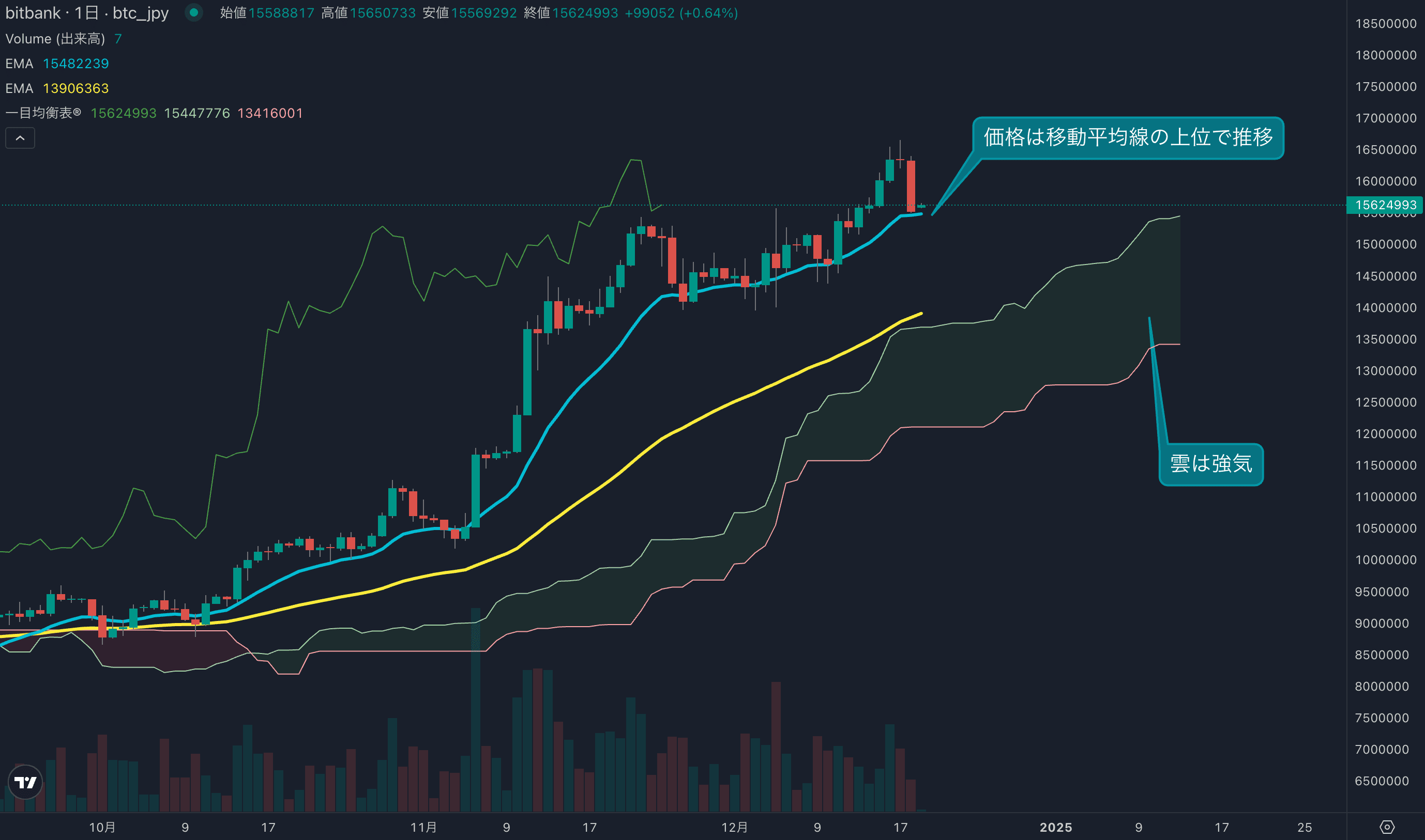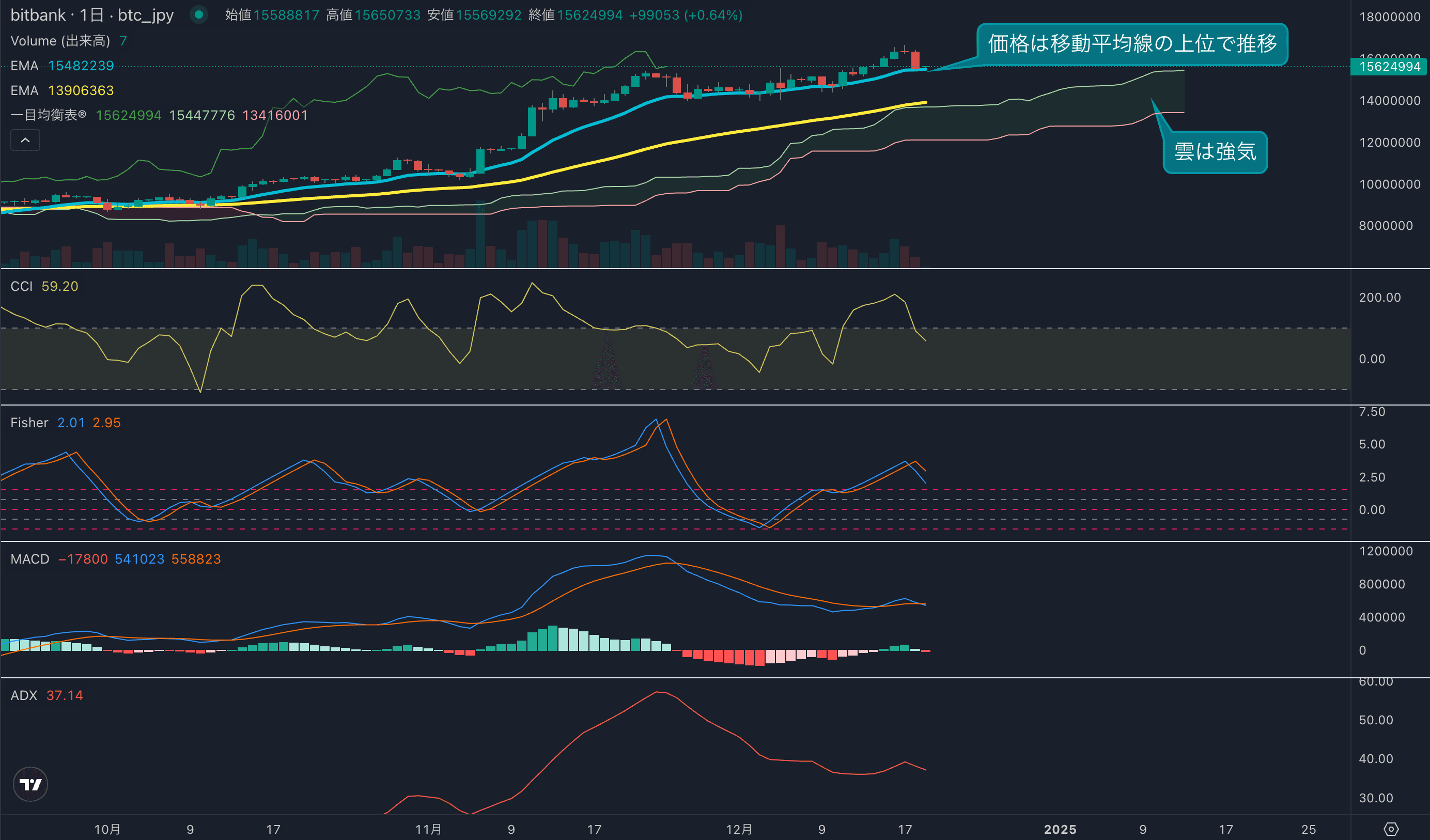 - 価格は14EMA(1545万円)を上回り強気示唆です。53EMA(1384万円)は上昇しており、長期トレンドも強気です。一目均衡表の雲は先行スパン1(1540万円)が先行スパン2(1341万円)を上回り強気示唆です。