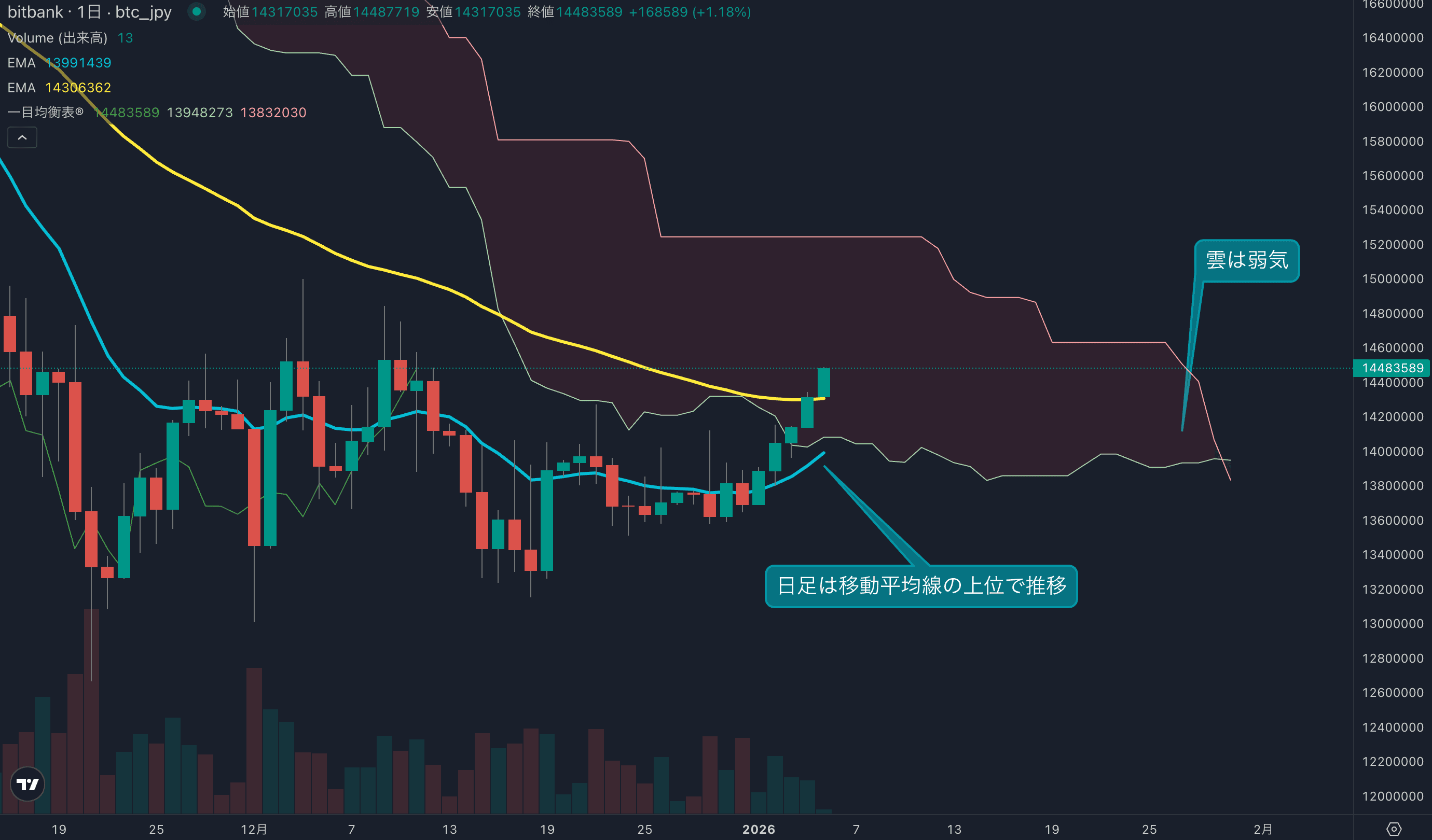 - 昨日のビットコインは1.2%上昇し、終値は1431万円でした。日足は4日連続の陽線を記録しています。価格は長期移動平均線(53EMA)近辺まで戻しており、足元では強い値動きが見られます。