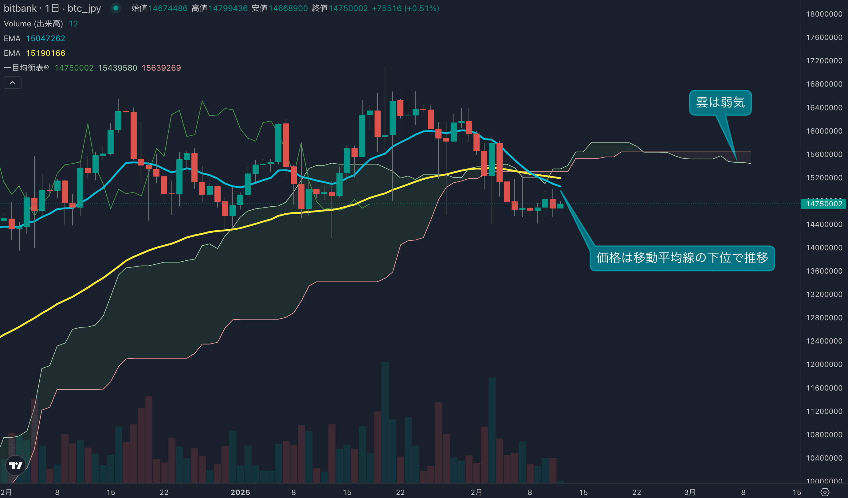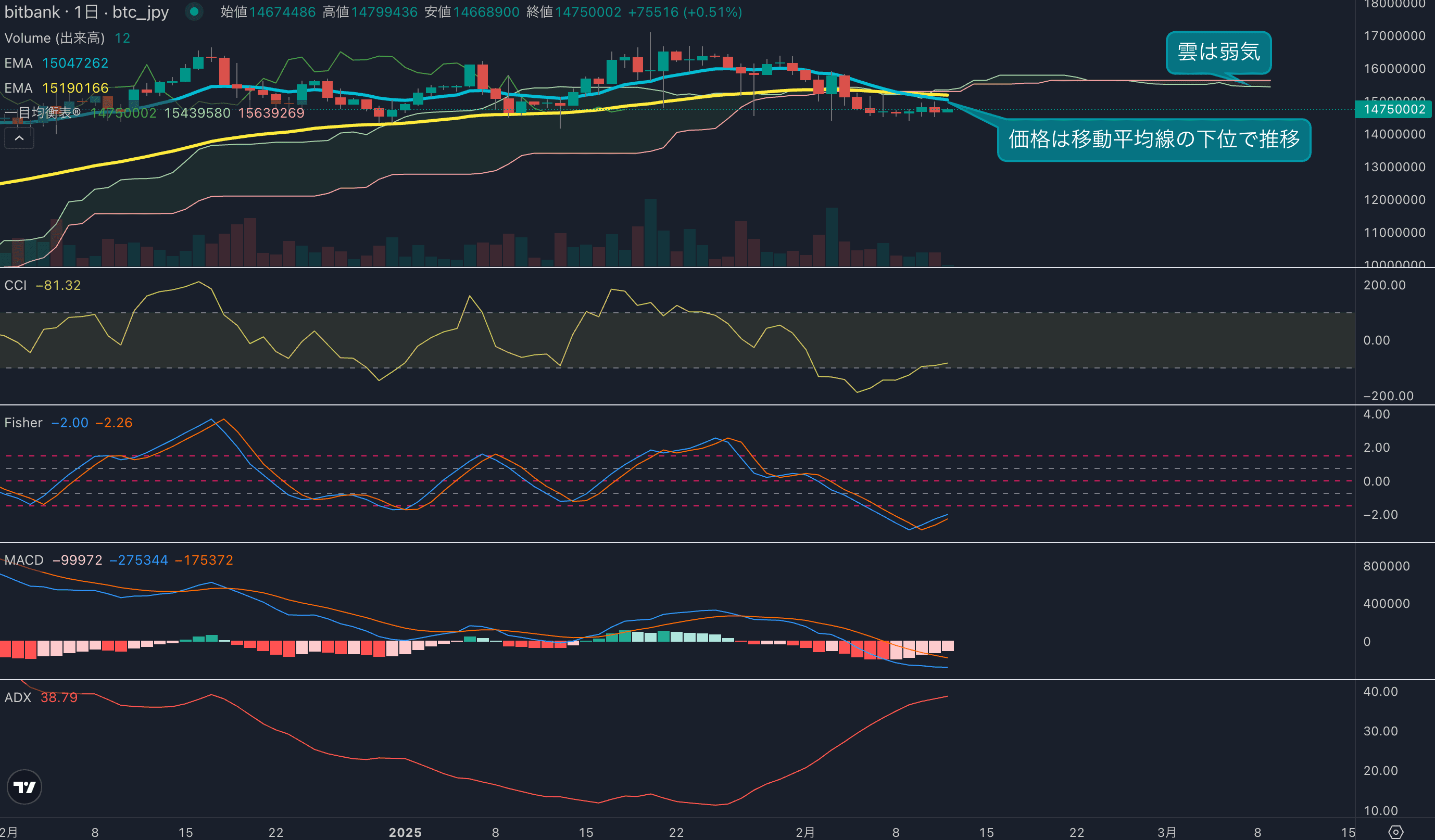 - 価格は14EMA(1509万円)を下回り弱気示唆です。53EMA(1520万円)は下落しており、長期トレンドも弱気です。一目均衡表の雲は先行スパン1(1548万円)が先行スパン2(1563万円)を下回り弱気示唆です。