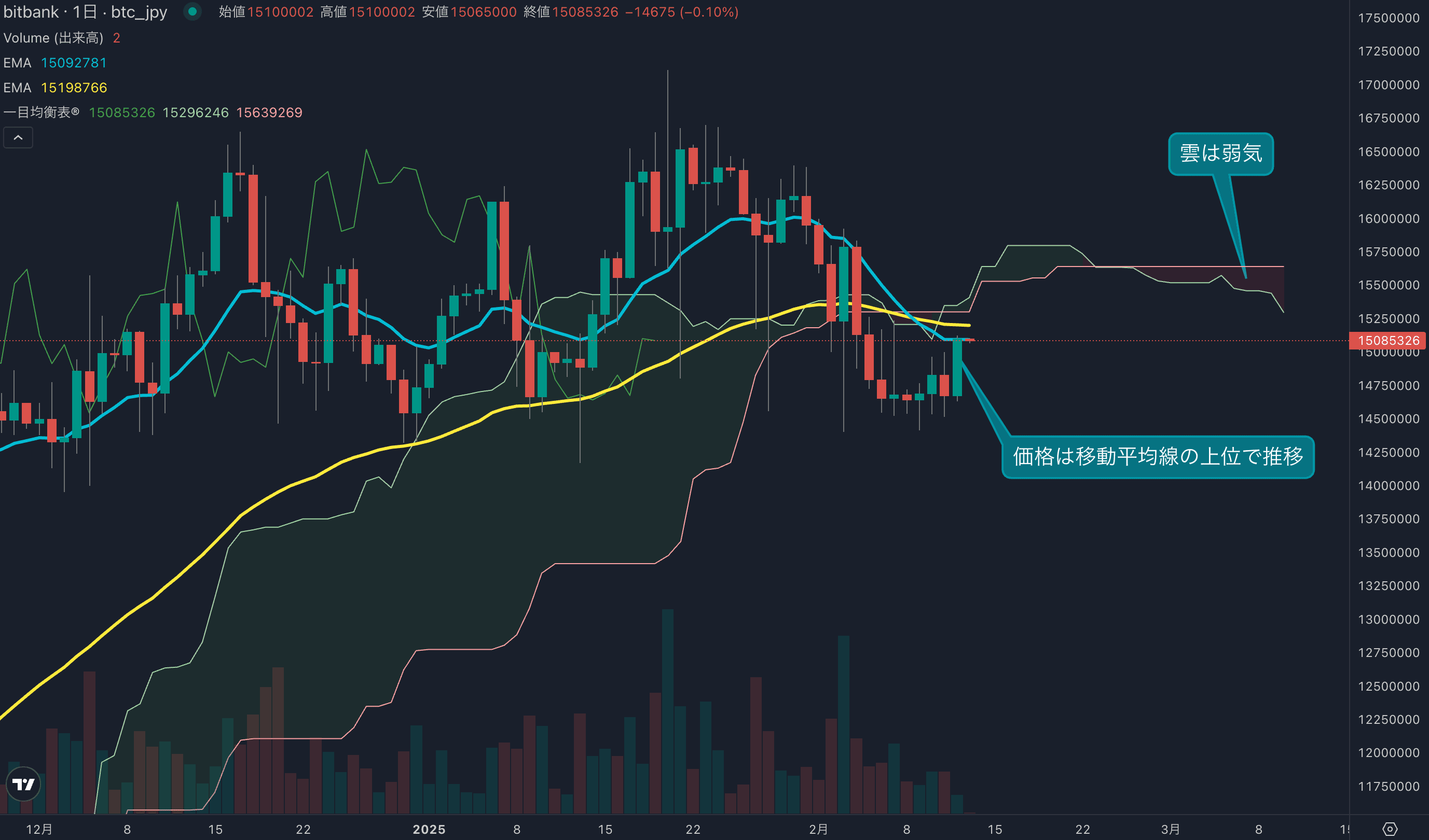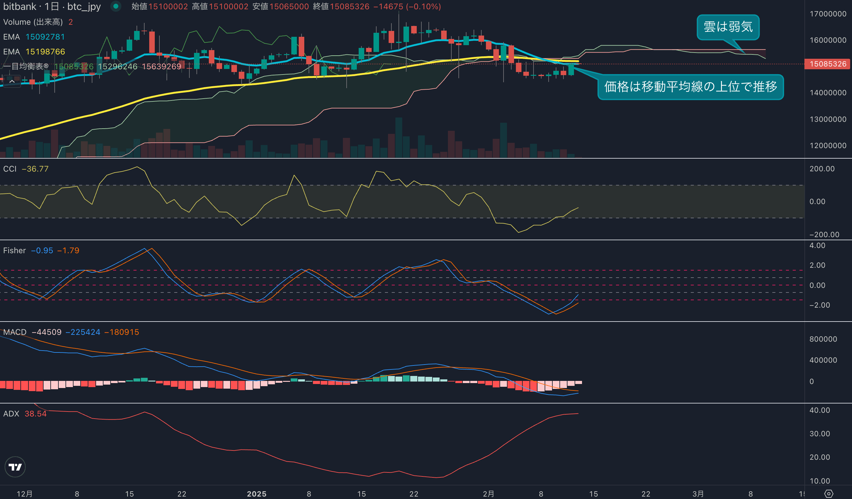 - 価格は14EMA(1509万円)を上回り強気示唆です。53EMA(1520万円)は下落しており、長期トレンドは弱気です。一目均衡表の雲は先行スパン1(1543万円)が先行スパン2(1563万円)を下回り弱気示唆です。