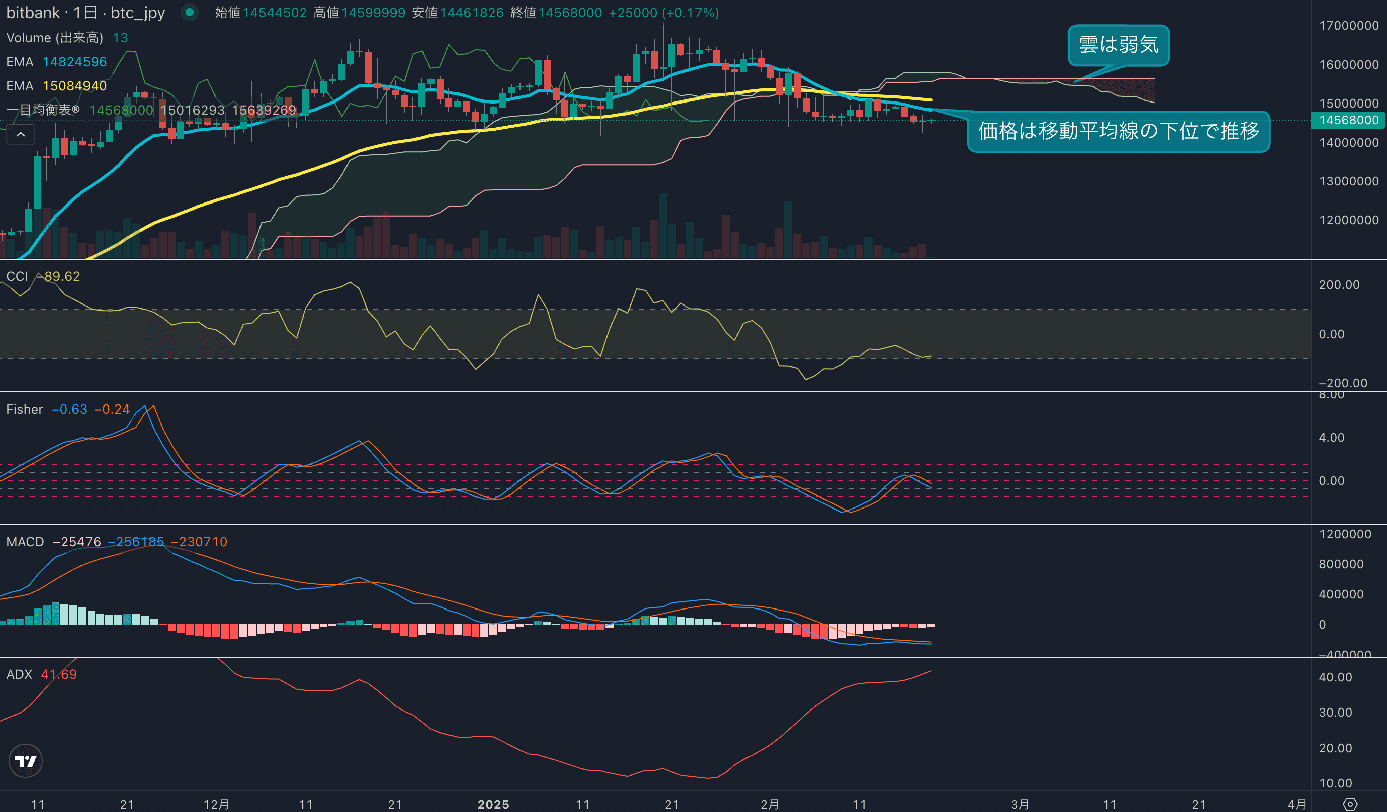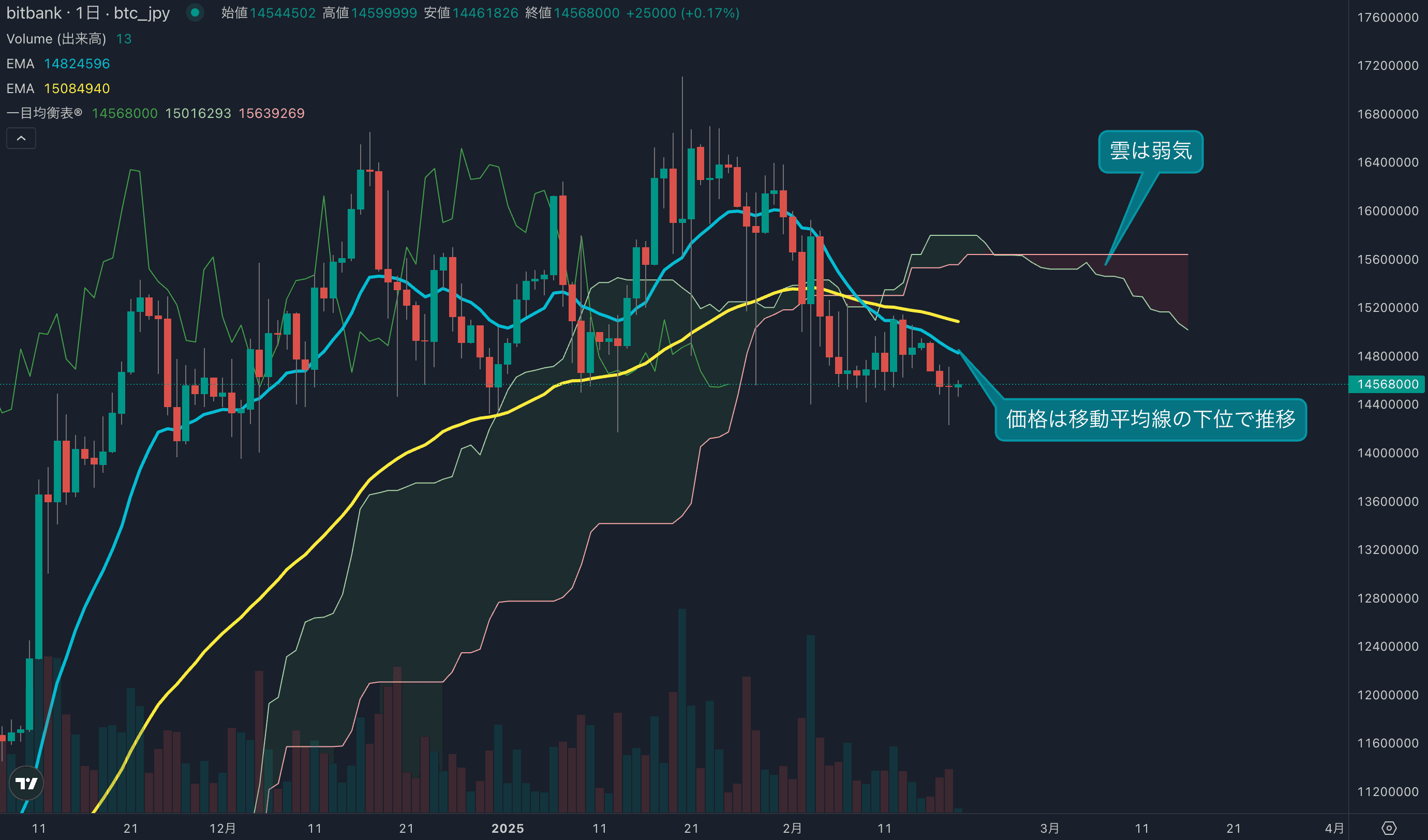 - 価格は14EMA(1486万円)を下回り弱気示唆です。53EMA(1510万円)は下落しており、長期トレンドも弱気です。一目均衡表の雲は先行スパン1(1507万円)が先行スパン2(1563万円)を下回り弱気示唆です。