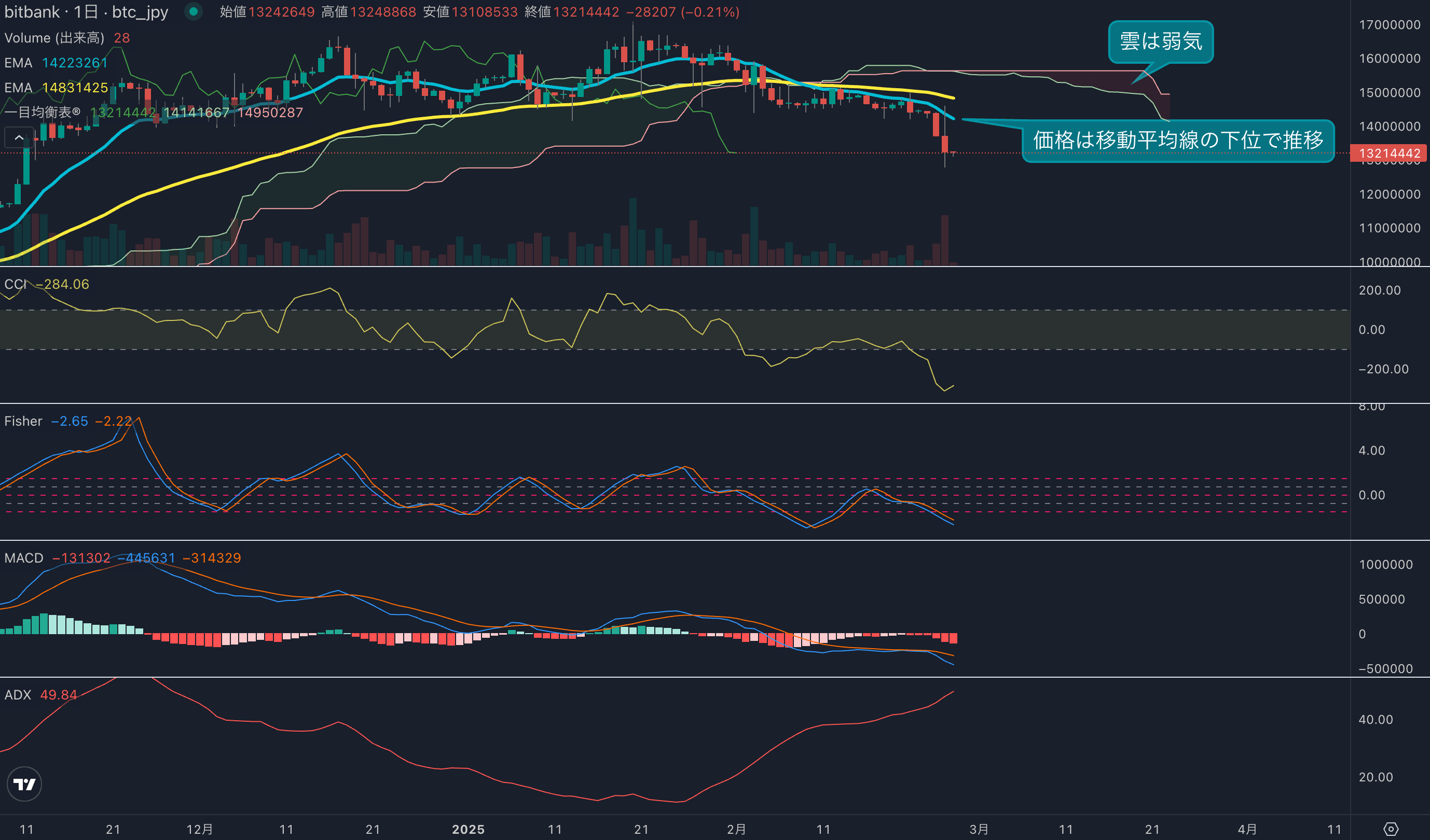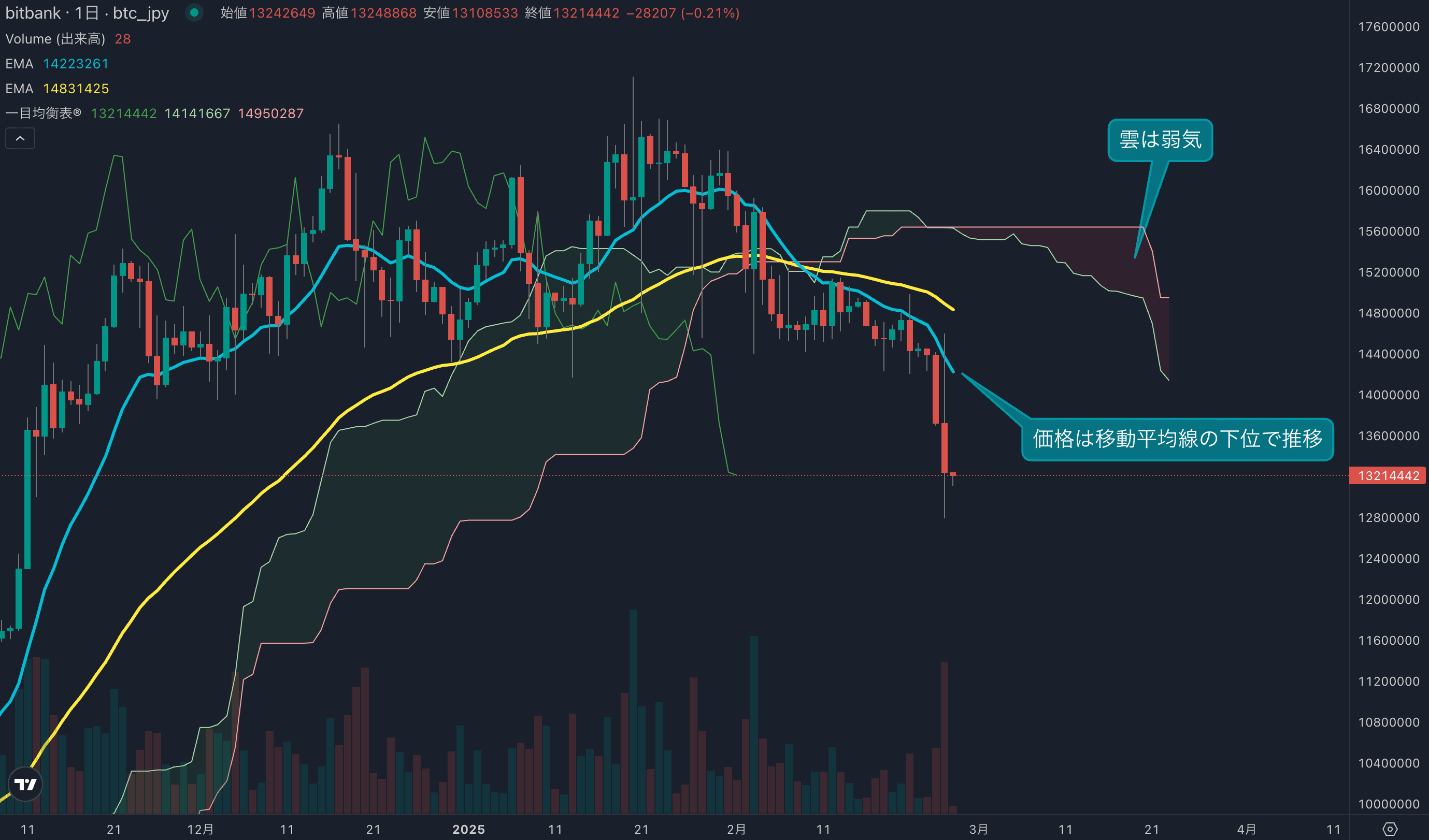 - 価格は14EMA(1437万円)を下回り弱気示唆です。53EMA(1489万円)は下落しており、長期トレンドも弱気です。一目均衡表の雲は先行スパン1(1422万円)が先行スパン2(1495万円)を下回り弱気示唆です。