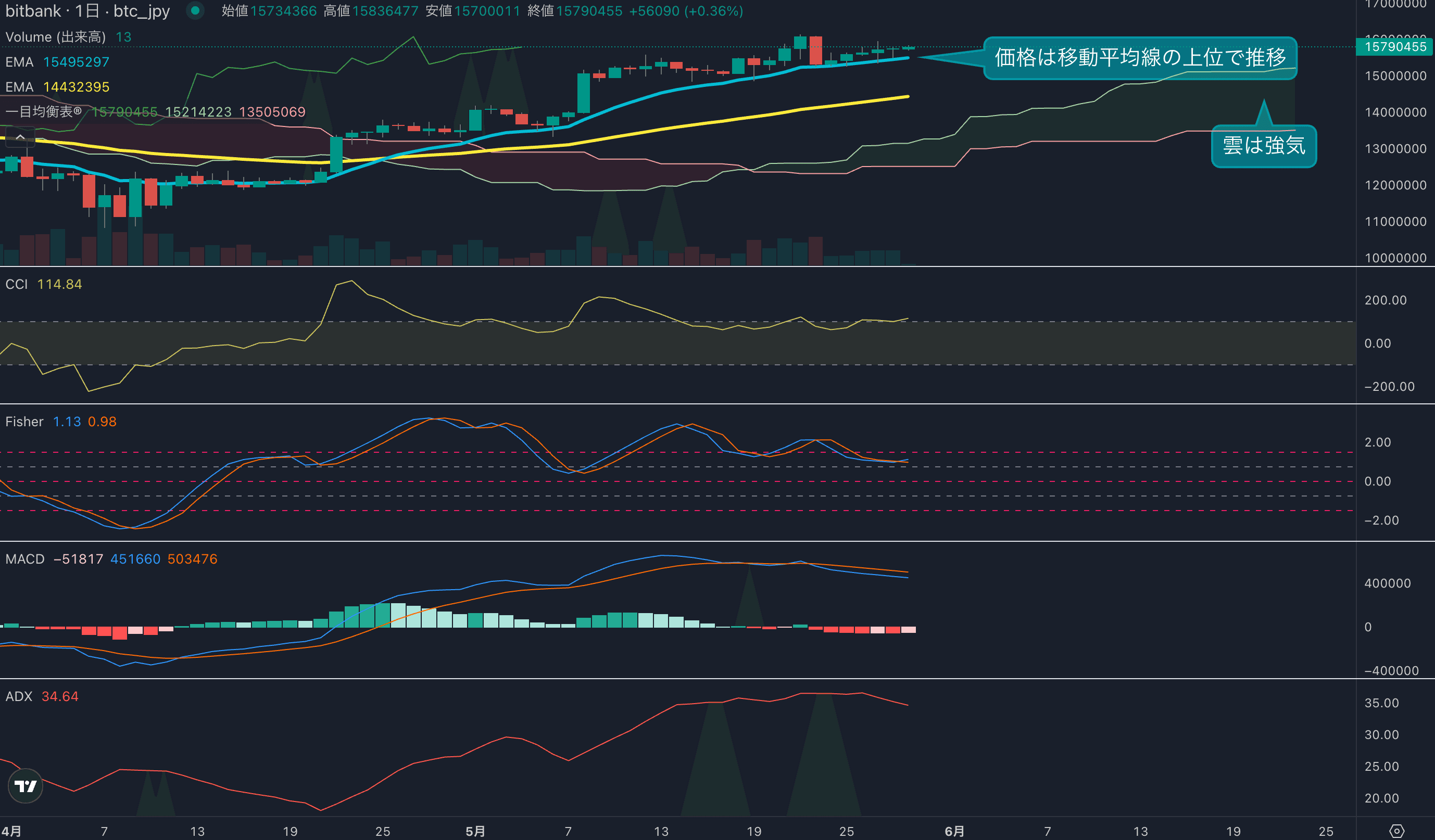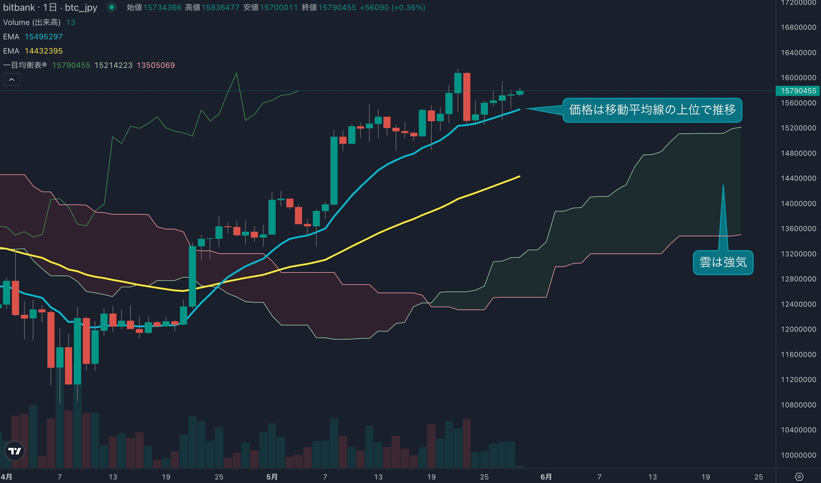 - 昨日のビットコインは0.08%上昇し、終値は1573万円でした。日足は移動平均線の上位で底堅く推移し、5日連続の陽線を記録しています。