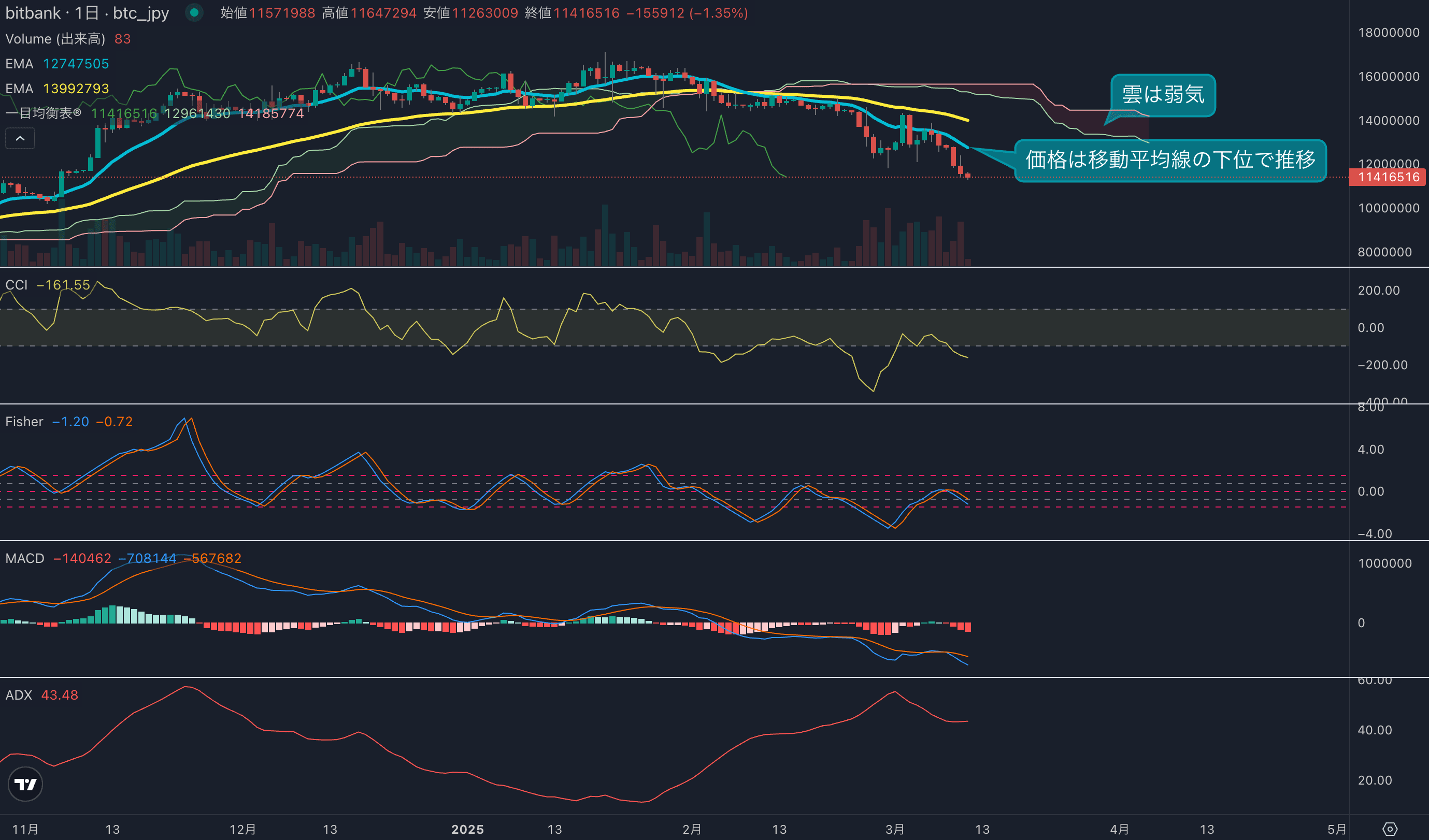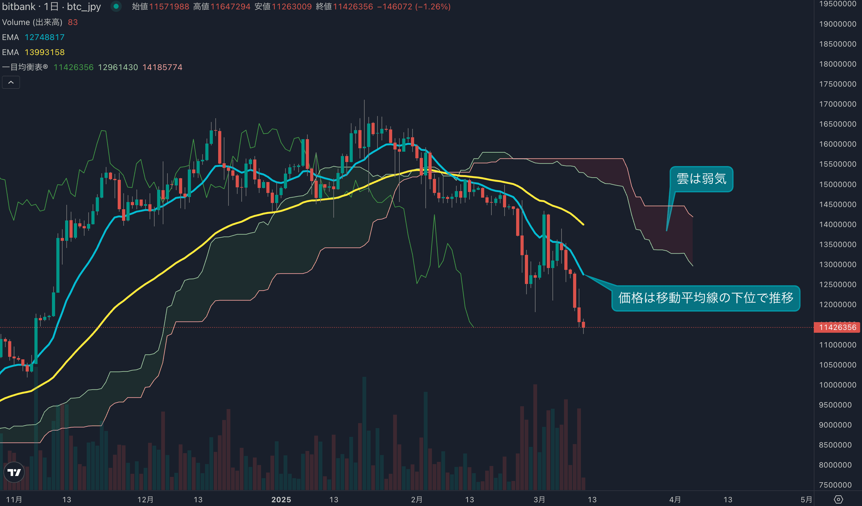 - 価格は14EMA(1295万円)を下回り弱気示唆です。53EMA(1409万円)は下落しており、長期トレンドも弱気です。一目均衡表の雲は先行スパン1(1308万円)が先行スパン2(1427万円)を下回り弱気示唆です。
