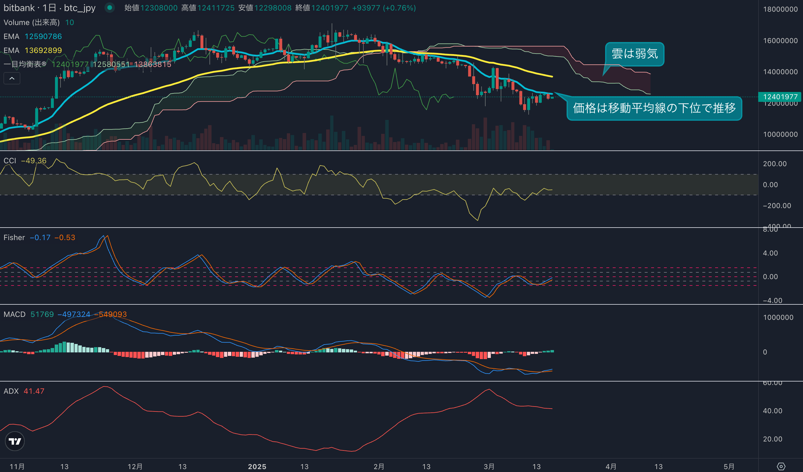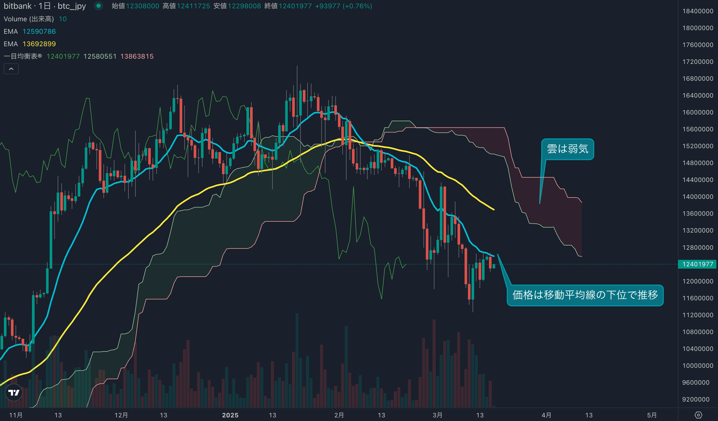 - 価格は14EMA(1261万円)を下回り弱気示唆です。53EMA(1374万円)は下落しており、長期トレンドも弱気です。一目均衡表の雲は先行スパン1(1260万円)が先行スパン2(1397万円)を下回り弱気示唆です。