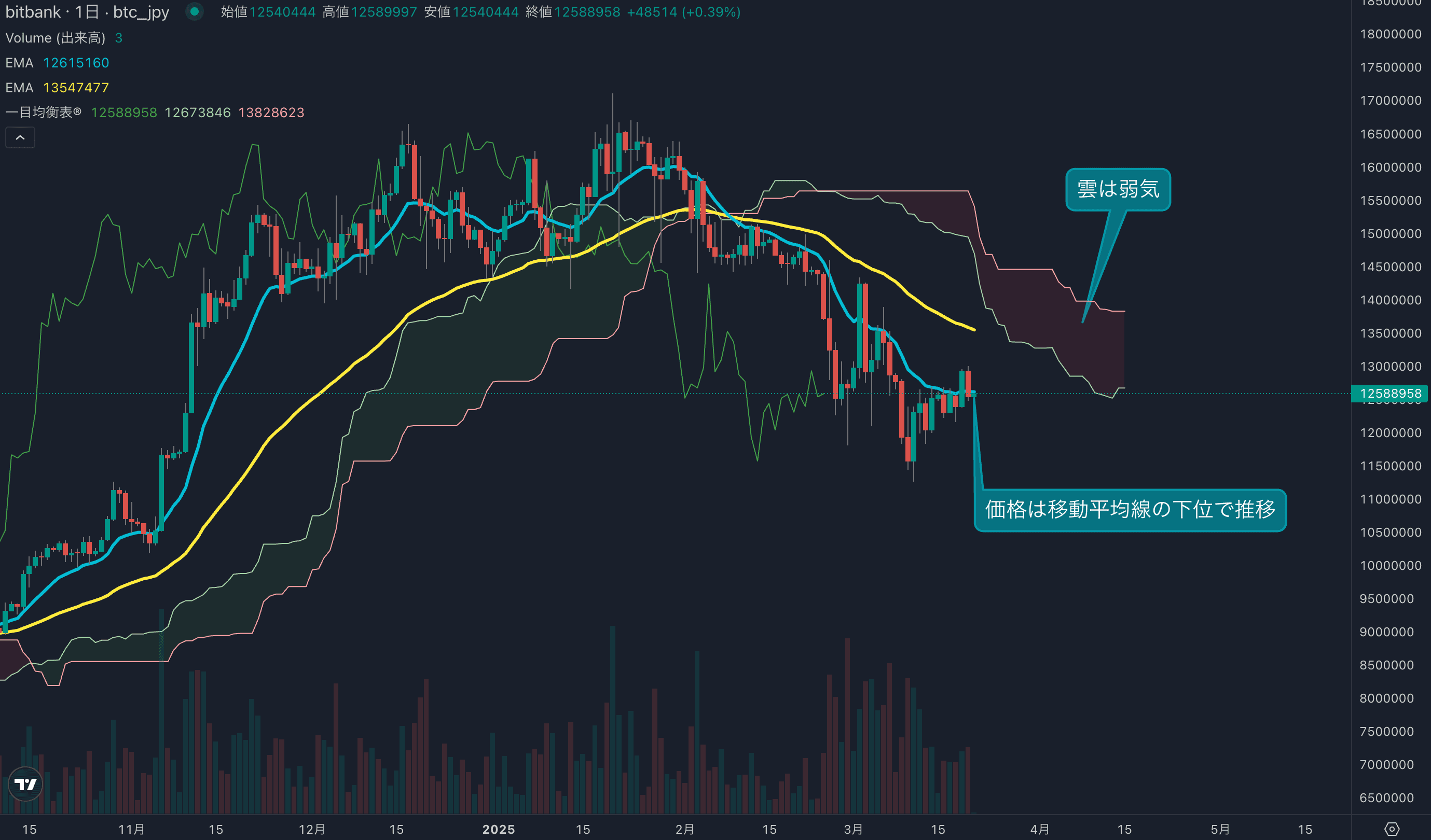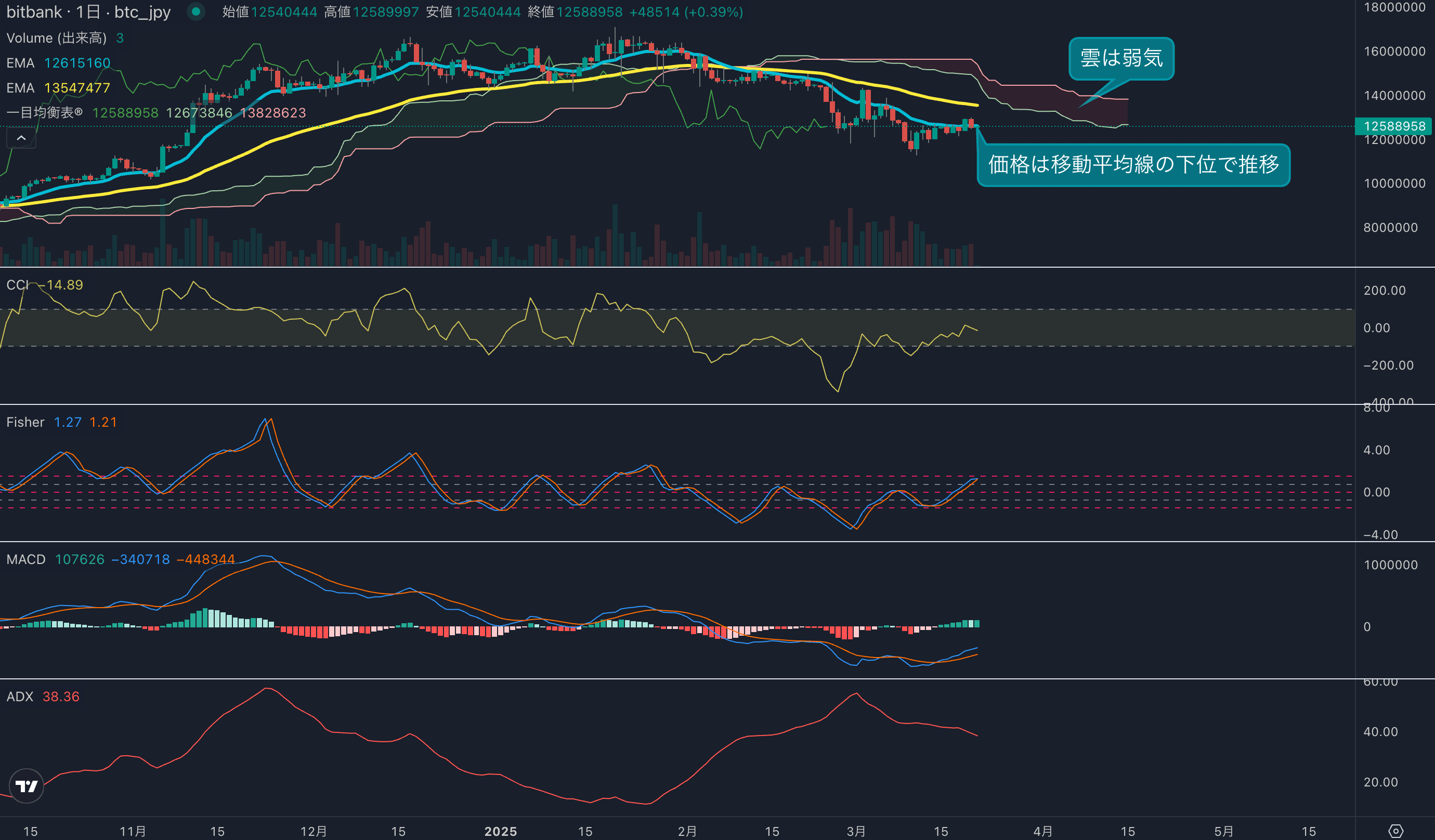 - 価格は14EMA(1261万円)を下回り弱気示唆です。53EMA(1358万円)は下落しており、長期トレンドも弱気です。一目均衡表の雲は先行スパン1(1267万円)が先行スパン2(1382万円)を下回り弱気示唆です。