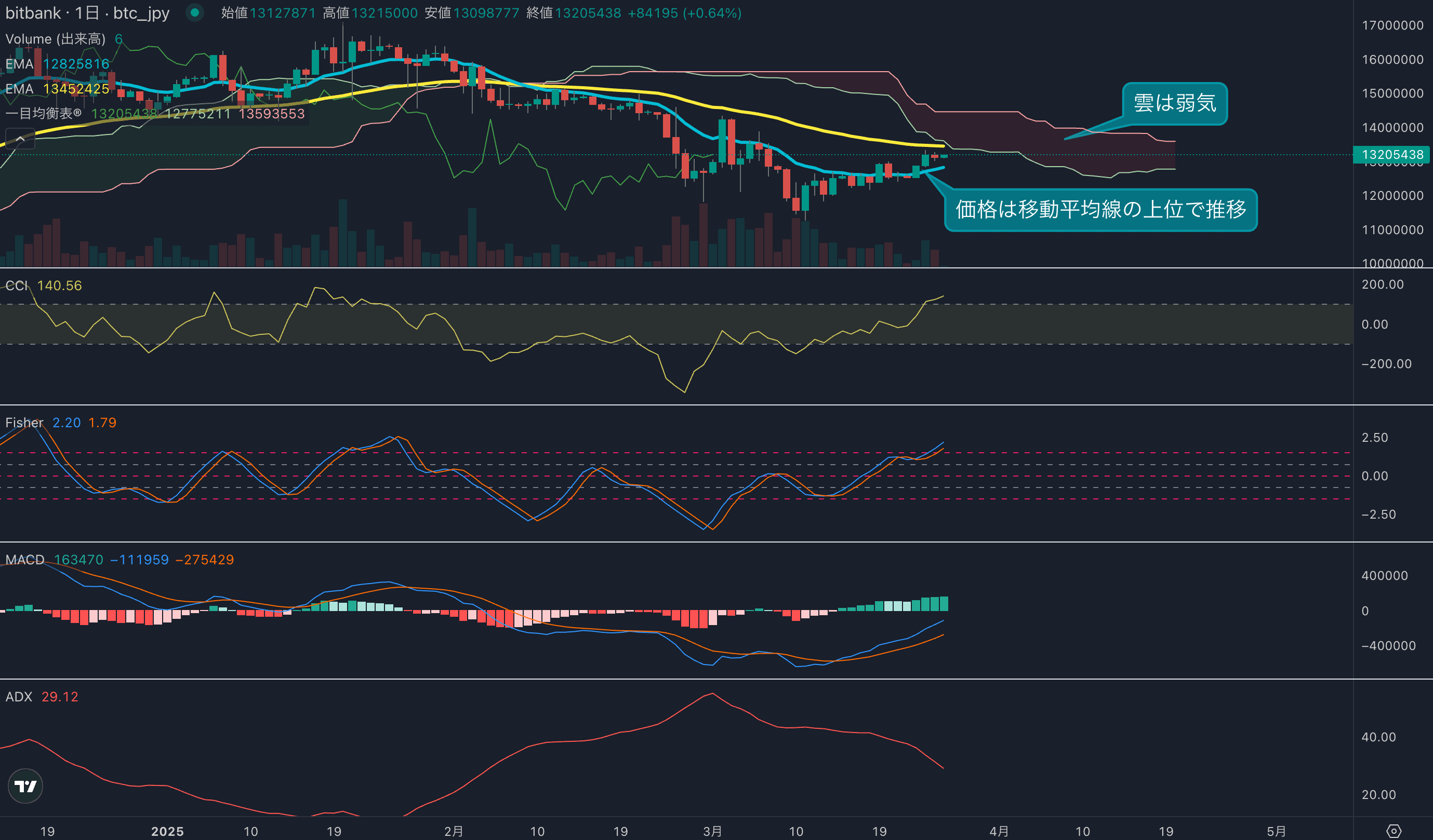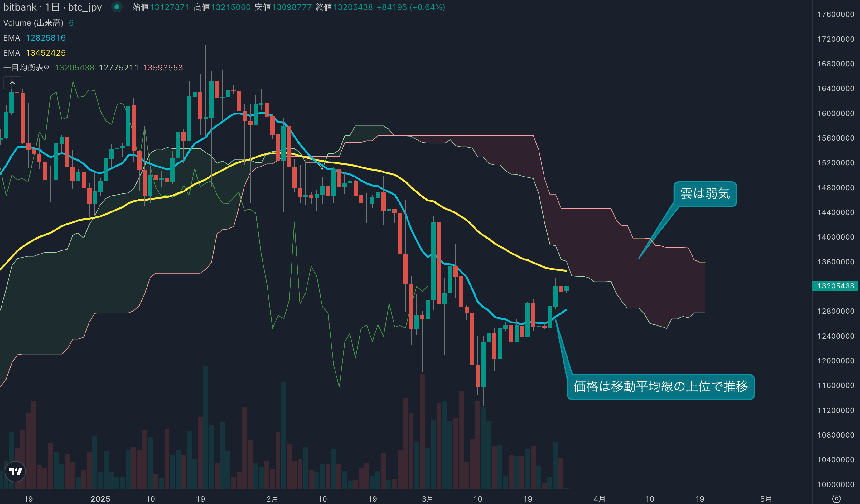 - 価格は14EMA(1276万円)を上回り強気示唆です。53EMA(1346万円)は下落しており、長期トレンドも弱気です。一目均衡表の雲は先行スパン1(1277万円)が先行スパン2(1359万円)を下回り弱気示唆です。