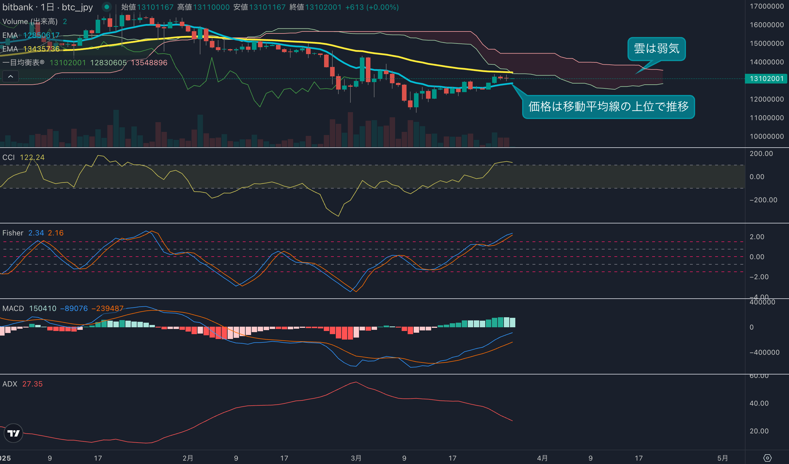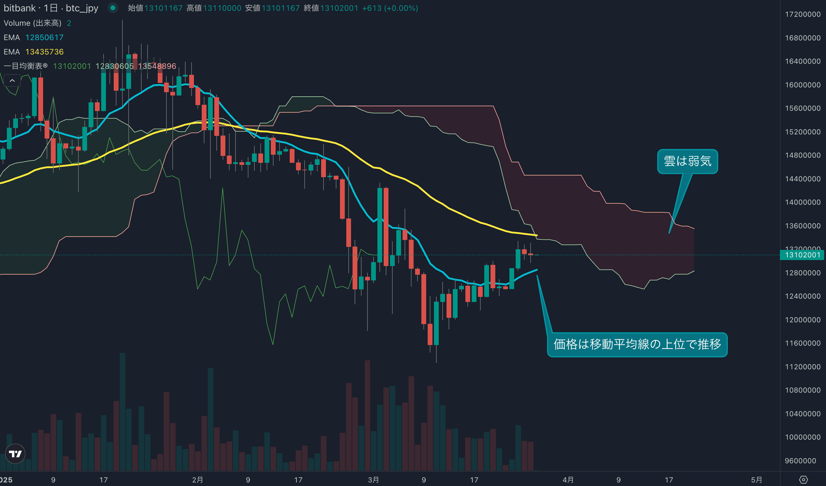 - 価格は14EMA(1281万円)を上回り強気示唆です。53EMA(1344万円)は下落しており、長期トレンドも弱気です。一目均衡表の雲は先行スパン1(1277万円)が先行スパン2(1359万円)を下回り弱気示唆です。