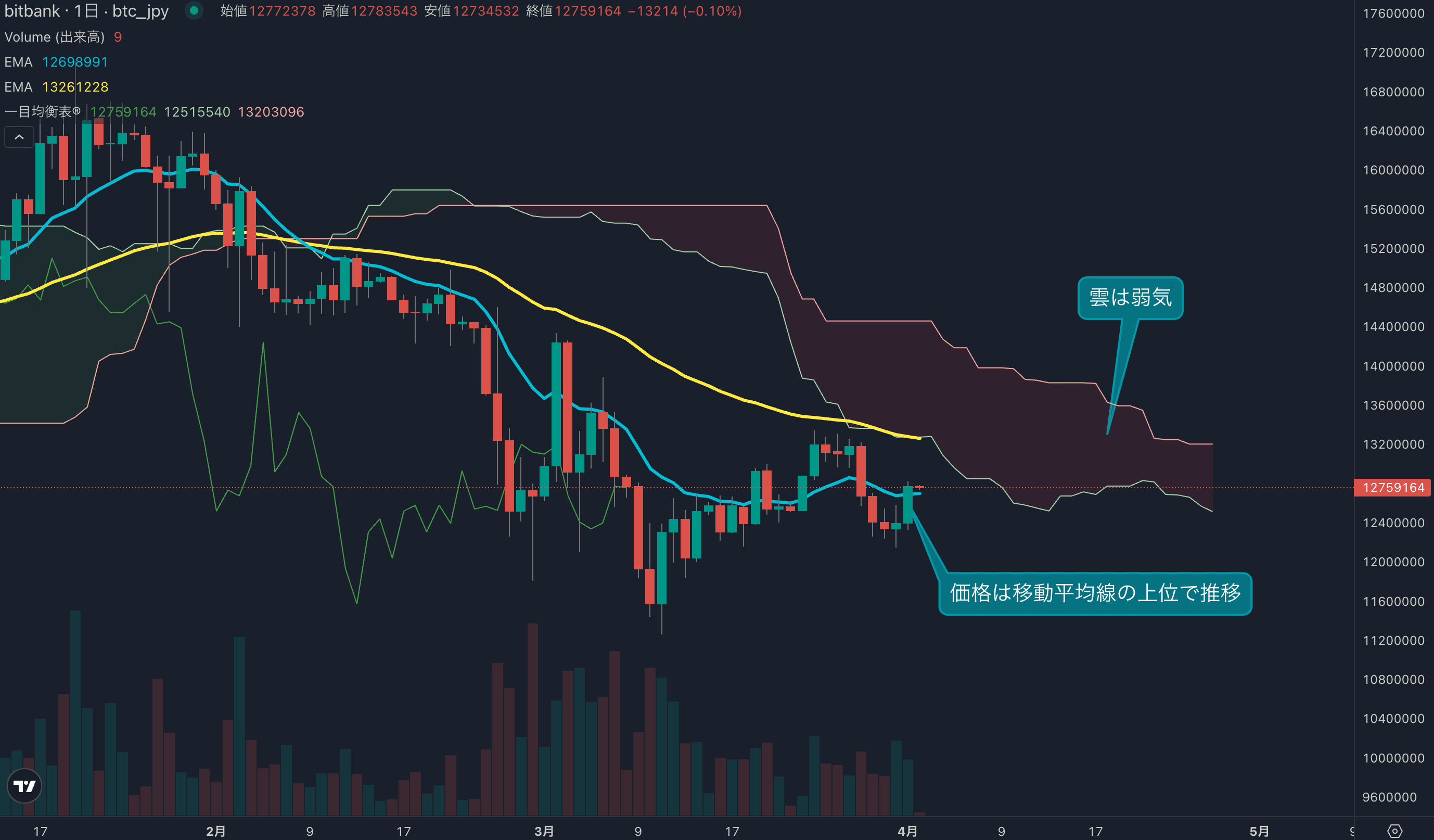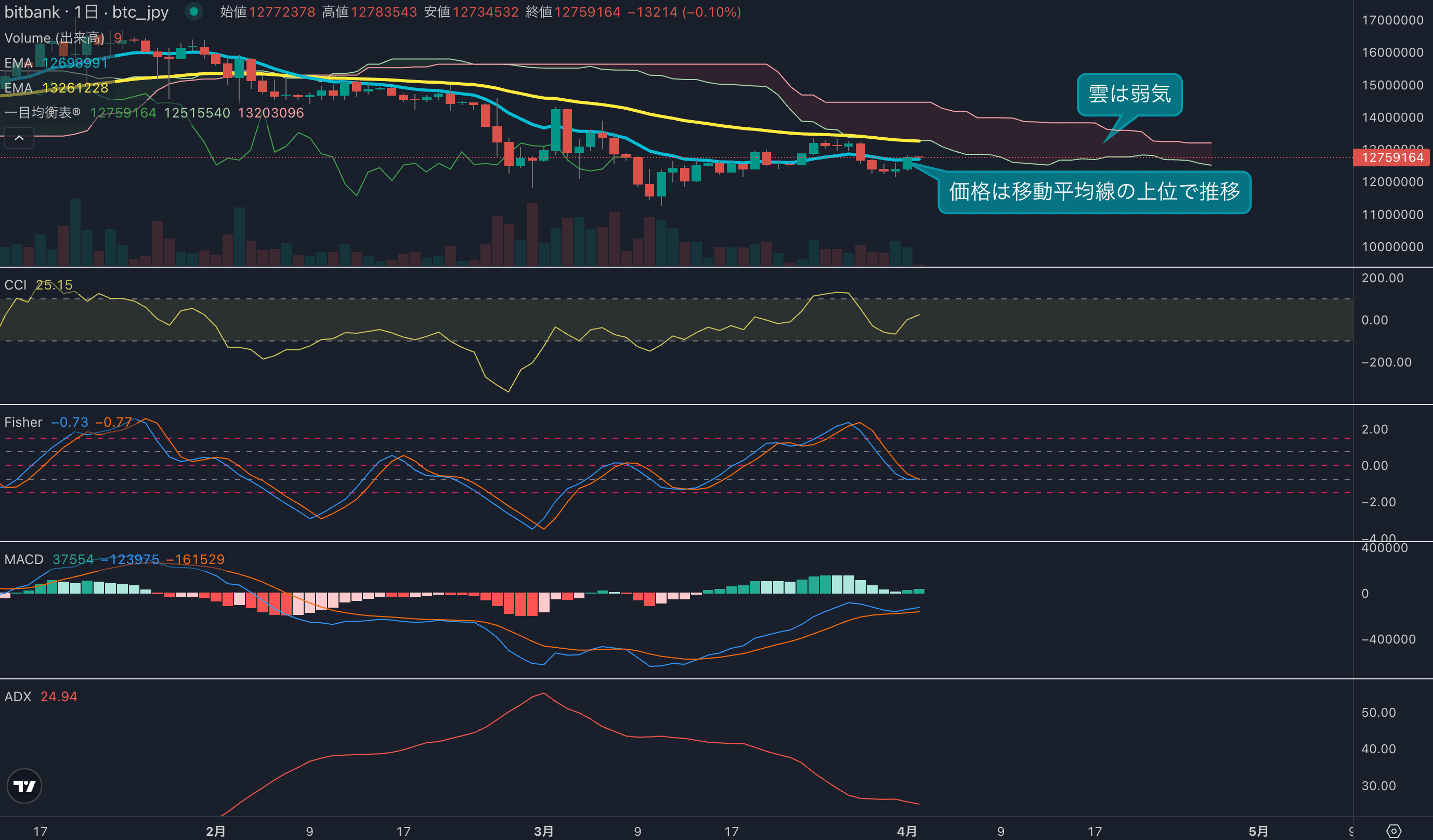 - ビットコイン相場は4月初日から買いが入る動きとなり、テクニカル面が改善しました。オシレーターも反転する動きを見せており、短期では底堅く推移しています。長期では弱気なチャートに変わりはないものの、底打ちした可能性も上がっています。これまでは短期移動平均線の上位を維持することに苦労していましたが、新しい月に入り高値を維持できるか注目です。