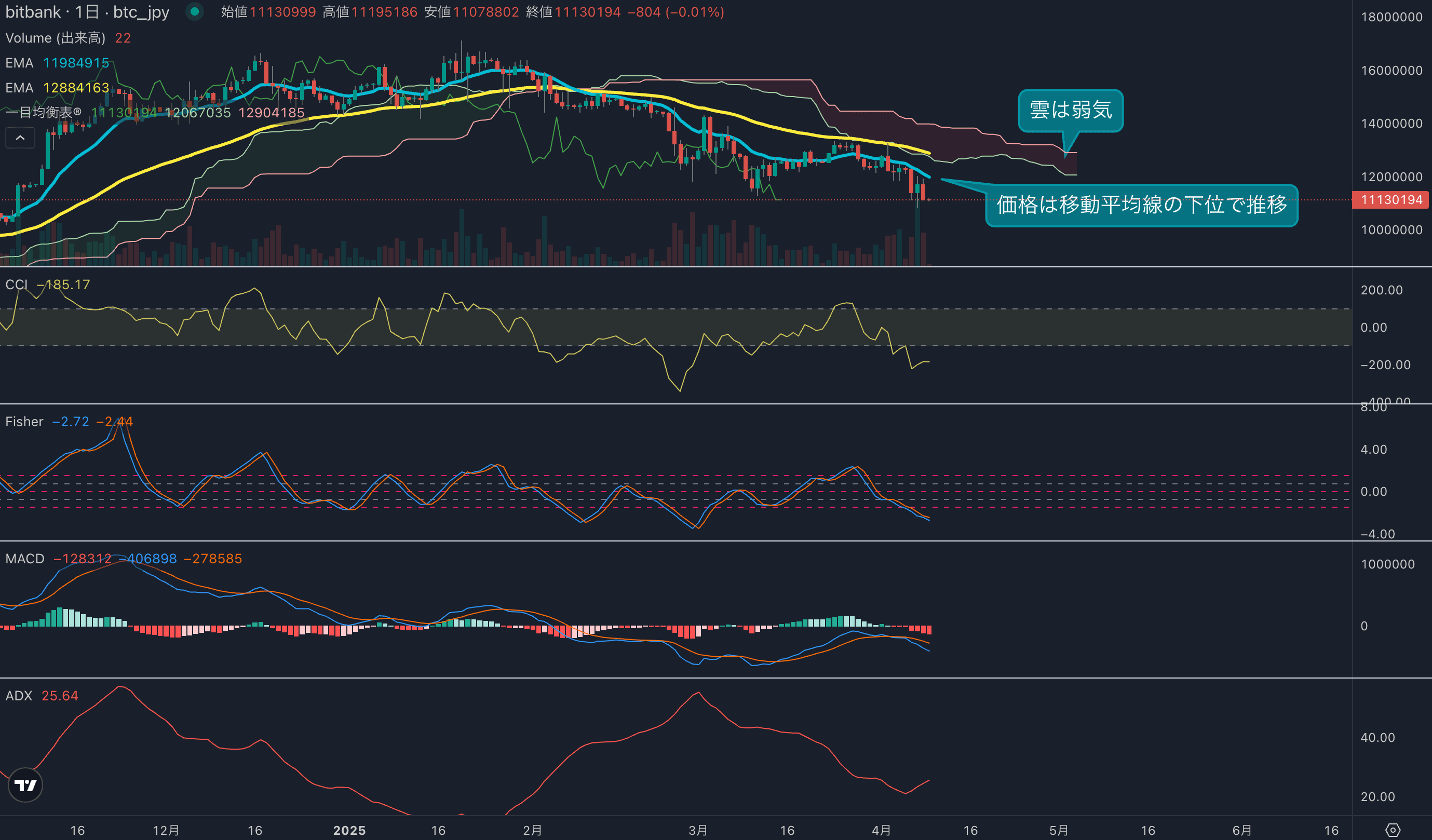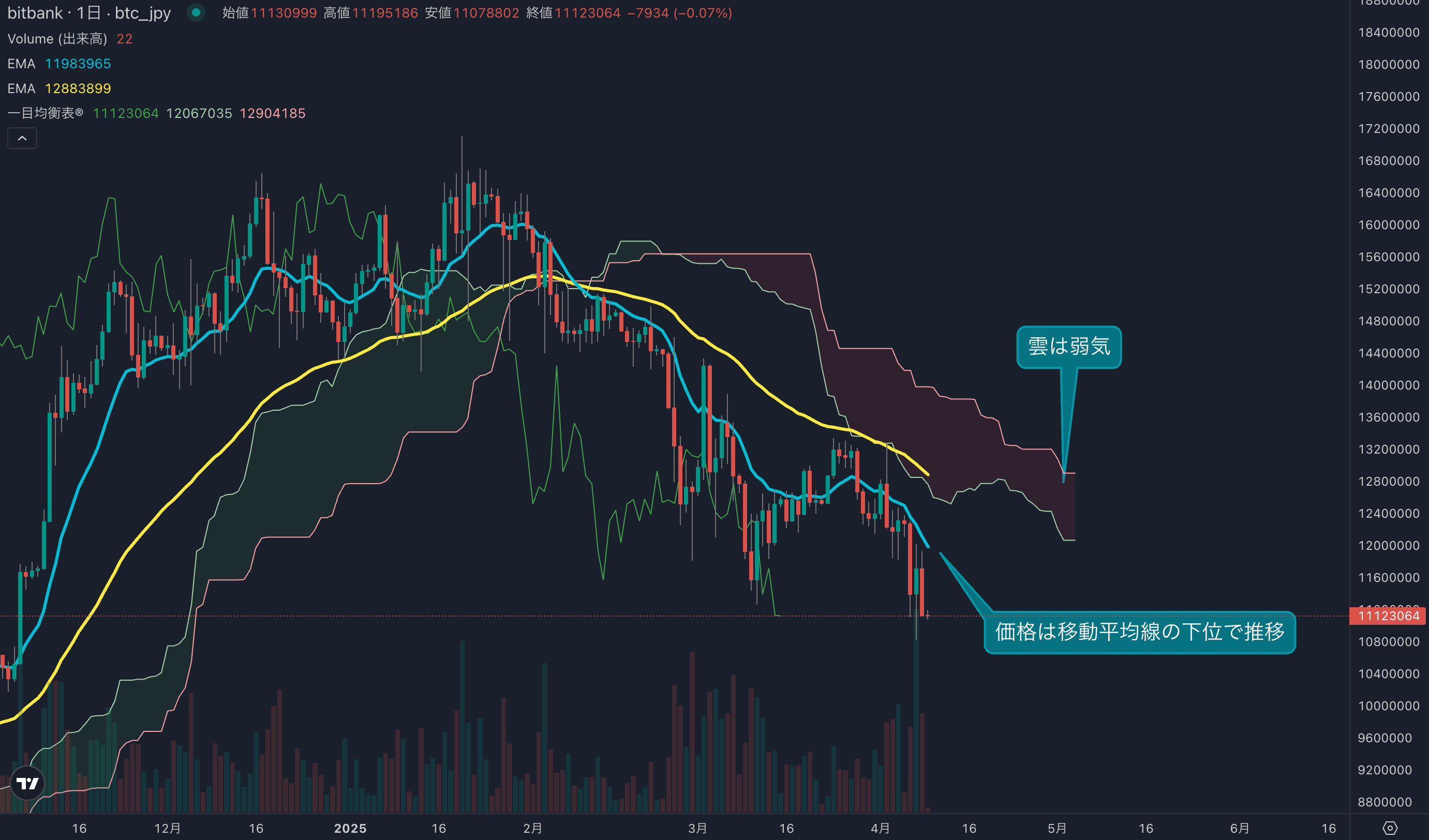 - 価格は14EMA(1211万円)を下回り弱気示唆です。53EMA(1295万円)は下落しており、長期トレンドも弱気です。一目均衡表の雲は先行スパン1(1206万円)が先行スパン2(1290万円)を下回り弱気示唆です。