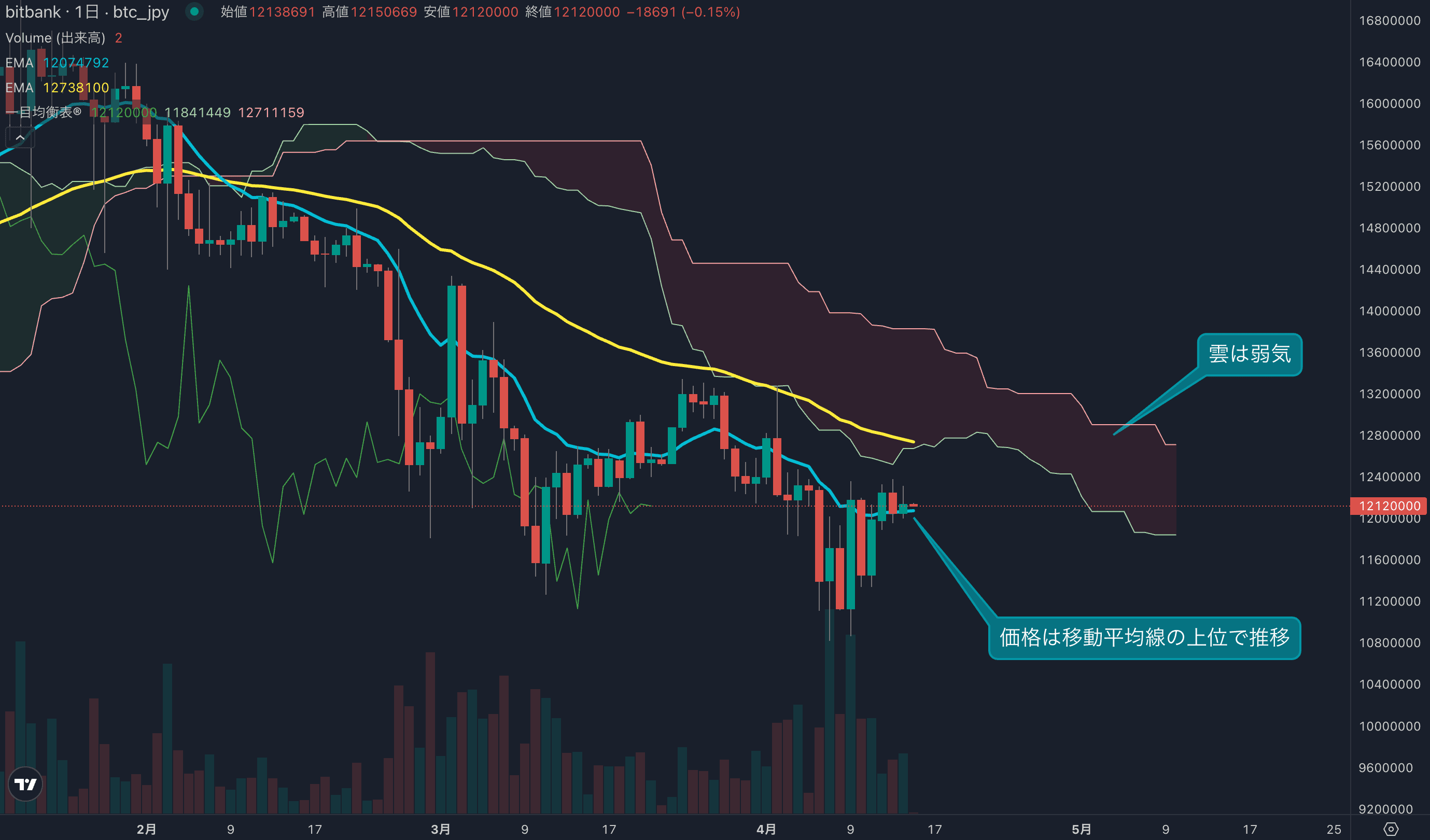 - 価格は14EMA(1206万円)を下回り弱気示唆です。53EMA(1276万円)は下落しており、長期トレンドも弱気です。一目均衡表の雲は先行スパン1(1184万円)が先行スパン2(1271万円)を下回り弱気示唆です。