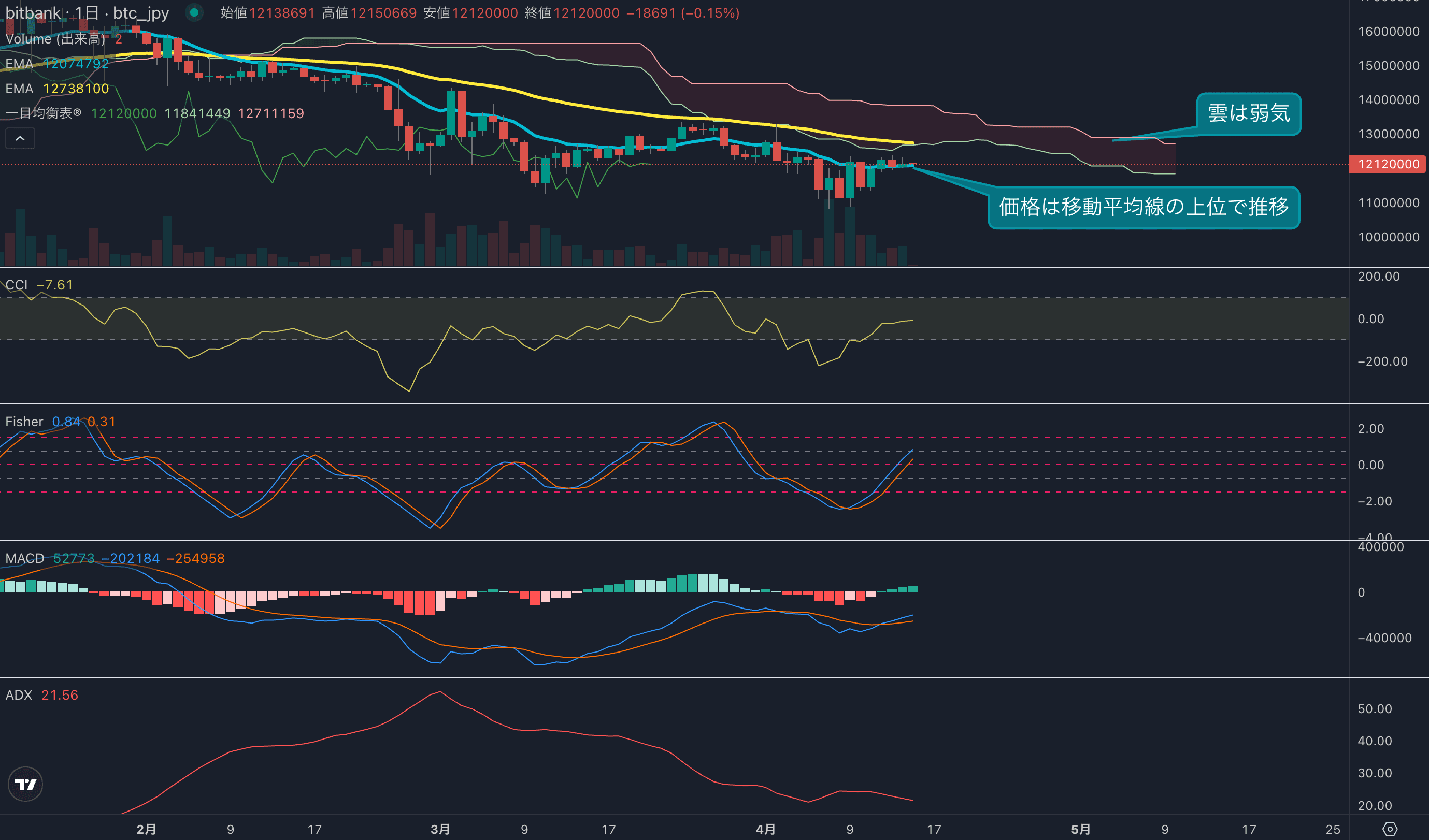 - 今週のビットコインは底堅い取引から相場が始まりました。価格は1200万円近辺で推移し、先週の安値からは100万円ほど買われて取引されています。短期のテクニカルでは、日足が移動平均線を上回り、オシレーターも上昇していることから上値期待がある相場となっています。短期のオシレーターはまだ中立水準で推移しており、こちらでもまだ買われる余地があると考えられます。先週下落した反動から今週は底堅い動きに期待ができる状態です。