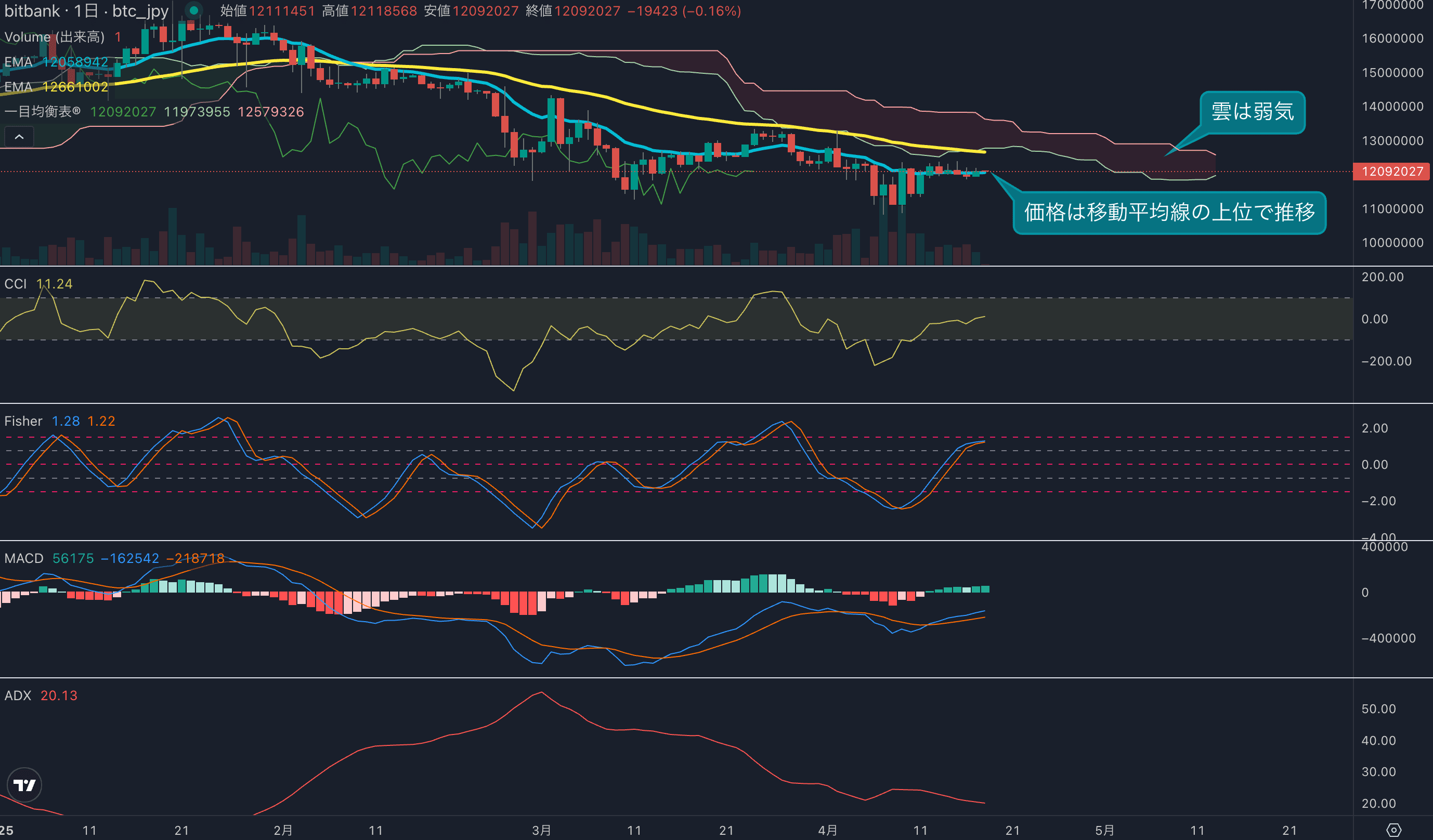 - 価格は14EMA(1205万円)を上回り強気示唆です。53EMA(1268万円)は下落しており、長期トレンドも弱気です。一目均衡表の雲は先行スパン1(1185万円)が先行スパン2(1271万円)を下回り弱気示唆です。