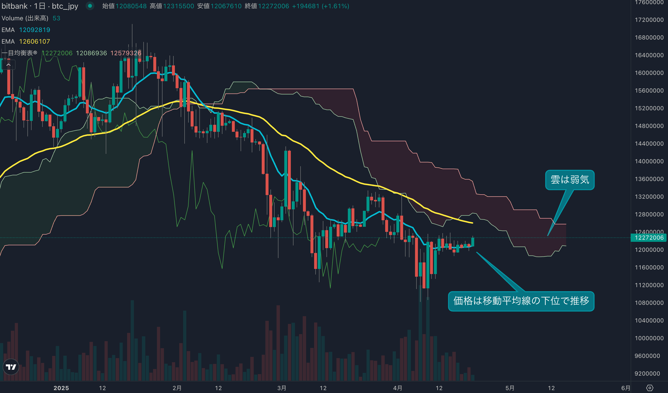 - 価格は14EMA(1210万円)を上回り強気示唆です。53EMA(1260万円)は下落しており、長期トレンドは弱気です。一目均衡表の雲は先行スパン1(1210万円)が先行スパン2(1257万円)を下回り弱気示唆です。