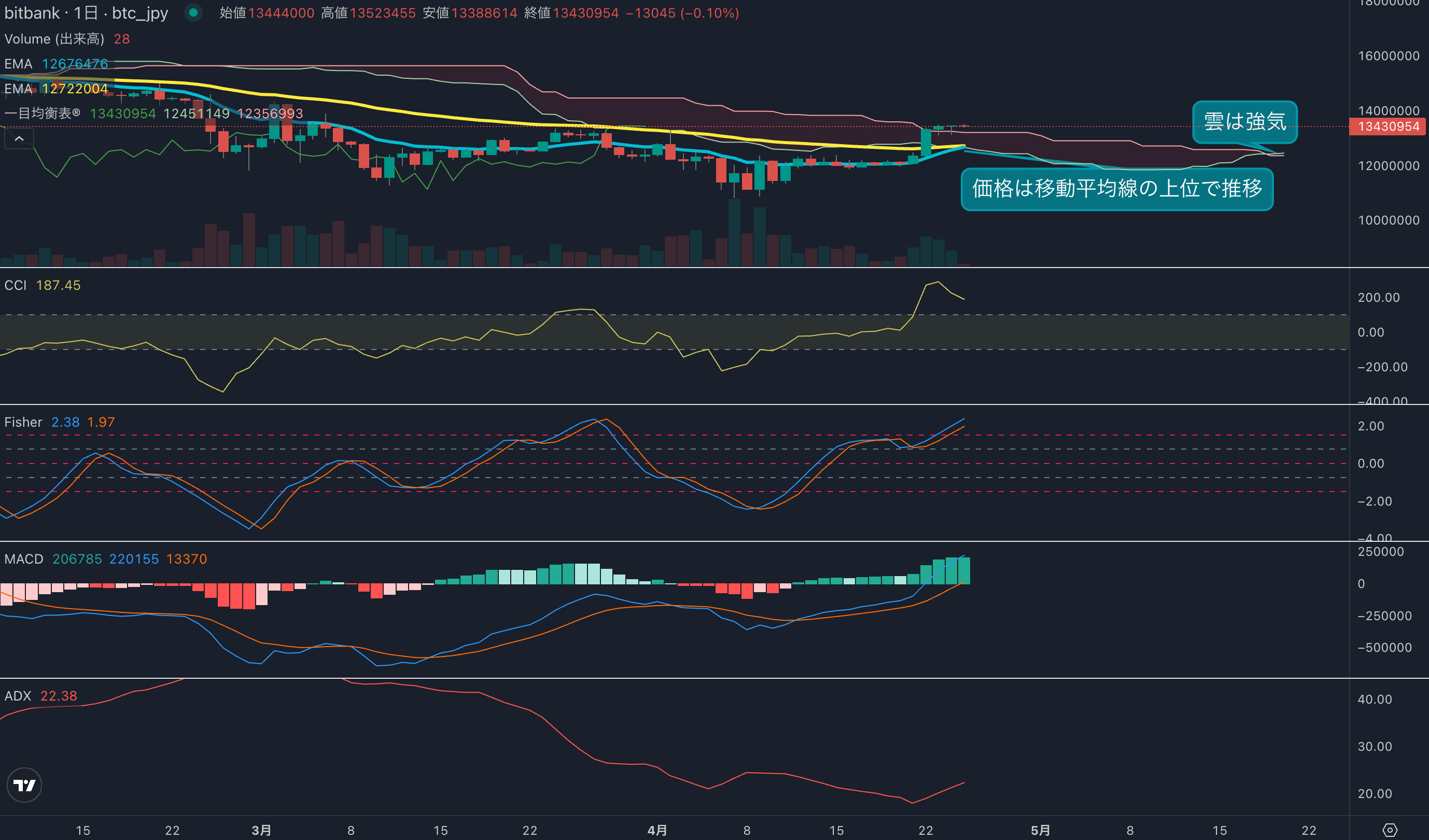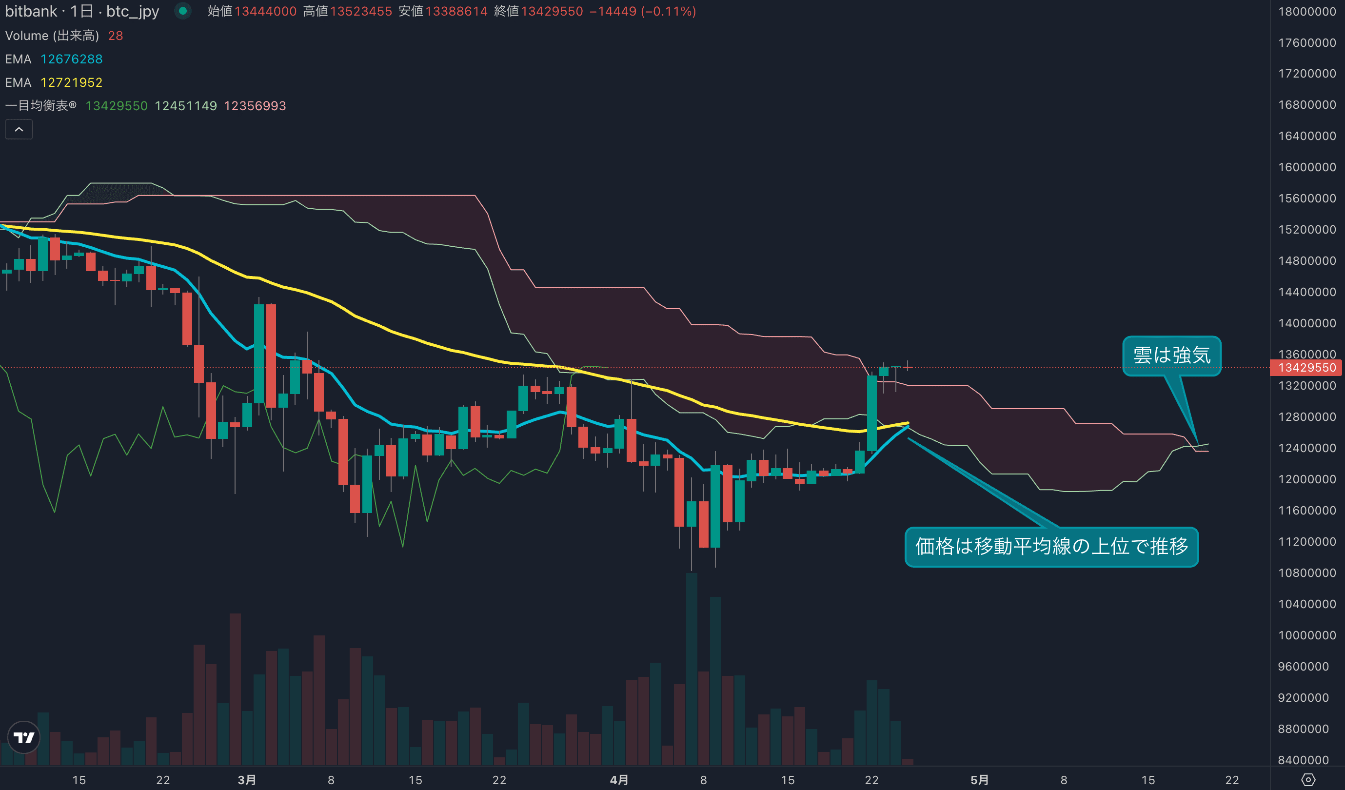 日足は雲の上位で底堅い動き、ビットコインの長期チャートが好転