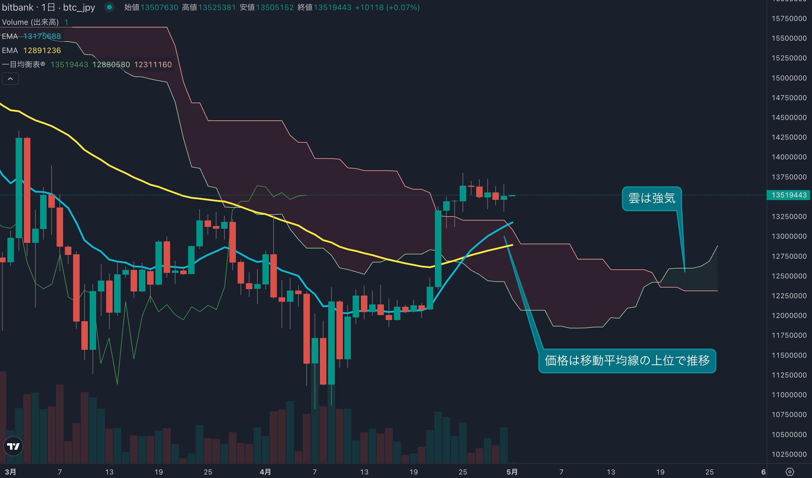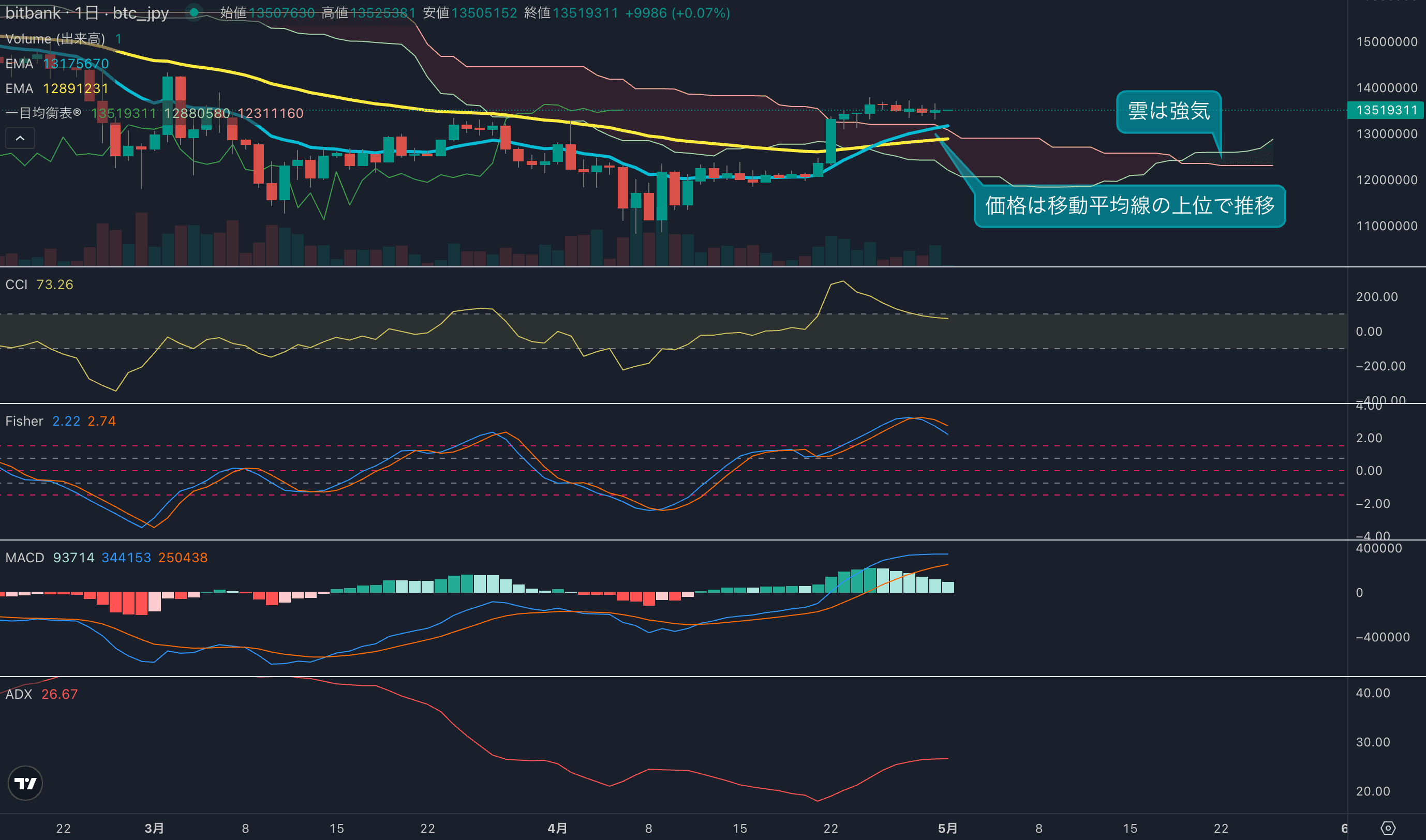 - 昨日のビットコインは0.3%上昇し、終値は1350万円でした。ほぼ横ばいの動きとなり、今週は小幅な値動きとなっています。日足は移動平均線の上位で揉み合う展開です。