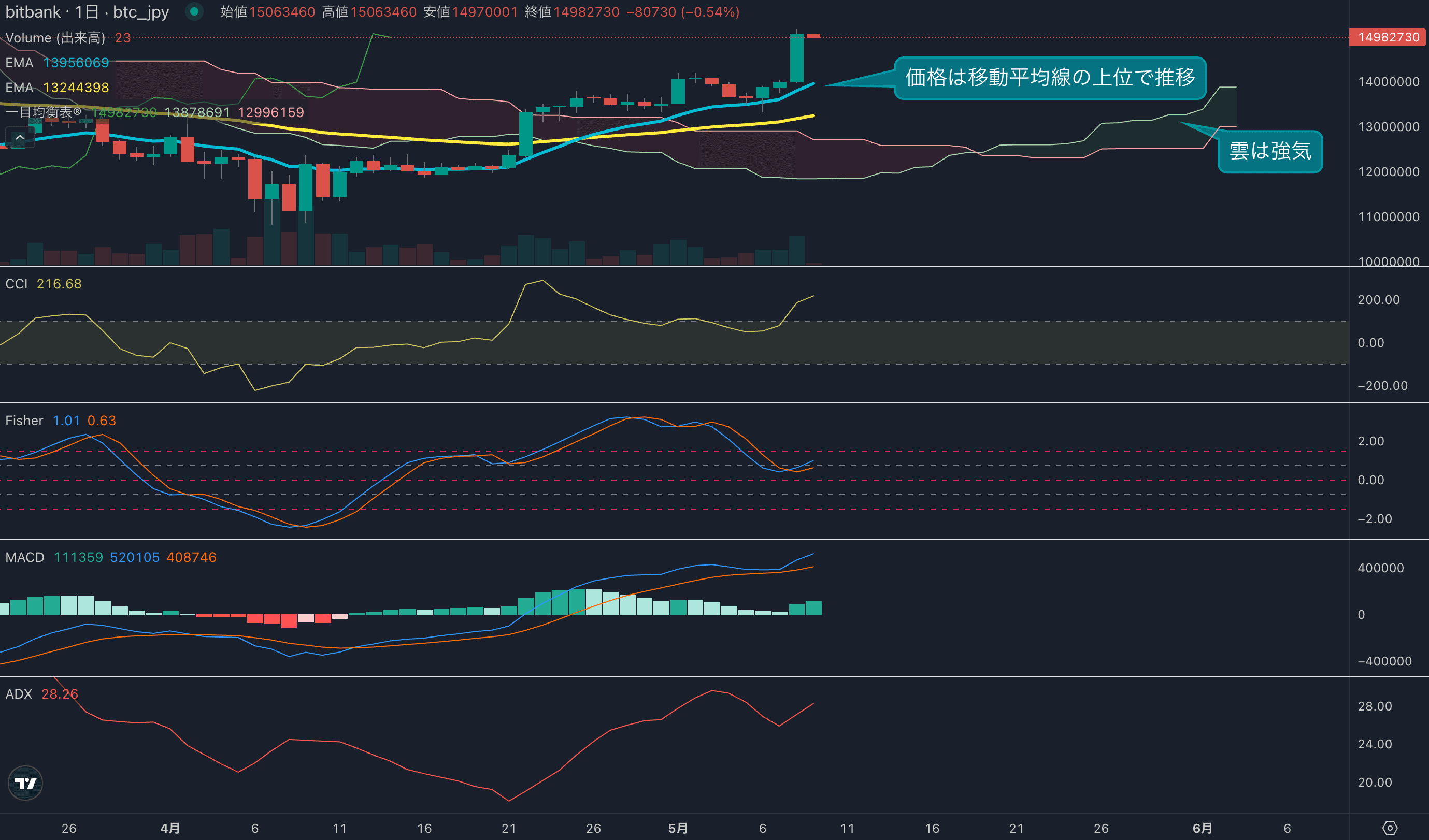 - 昨日のビットコインは7.6%上昇し、終値は1506万円でした。日足は3日連続の陽線を記録しました。価格は2月初旬の水準まで戻し、強気の値動きとなっています。