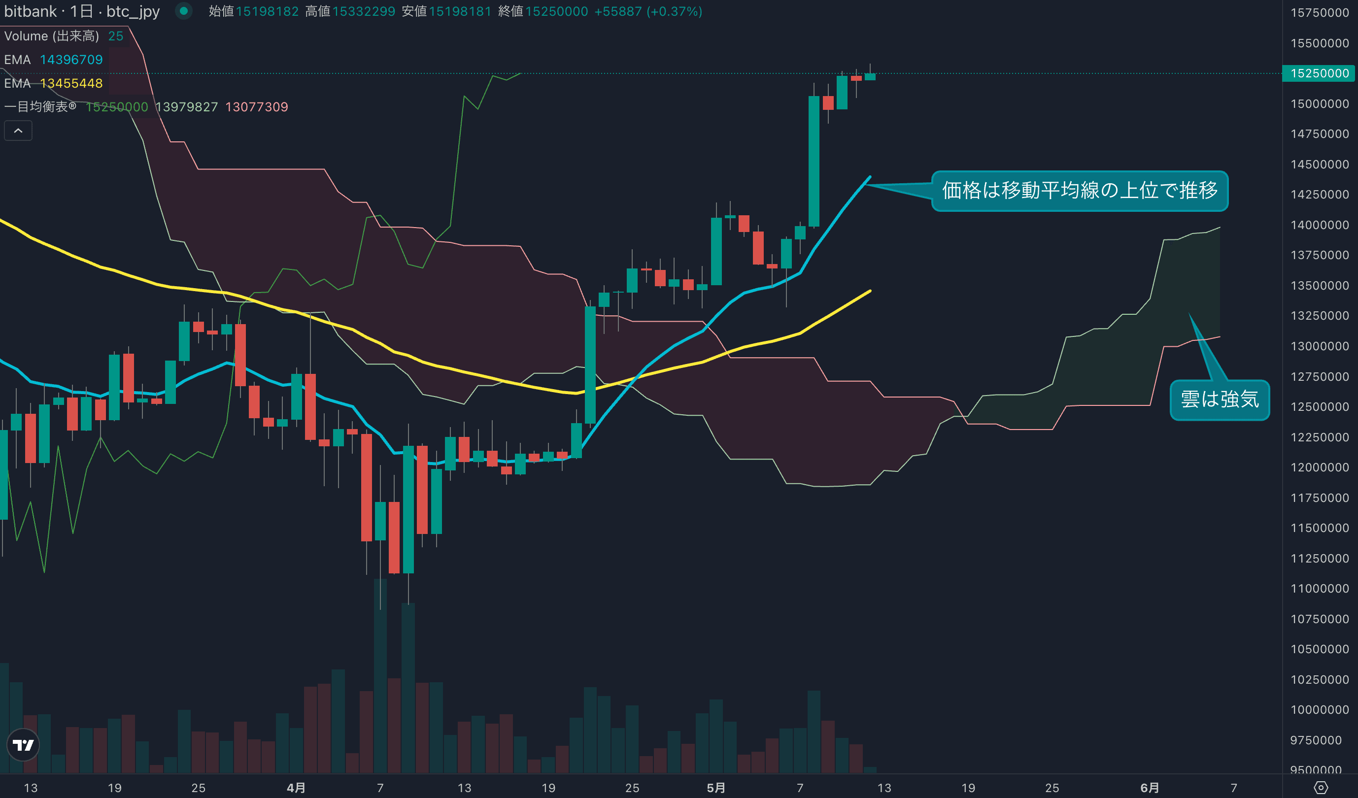 - 昨日のビットコインは0.2%下落し、終値は1519万円でした。週末は土曜日に上昇し、日曜日は小幅に下落しました。週末合計では僅かにプラスとなり底堅い動きとなりました。日足は移動平均線の上位で推移し、強気の値動きとなっています。